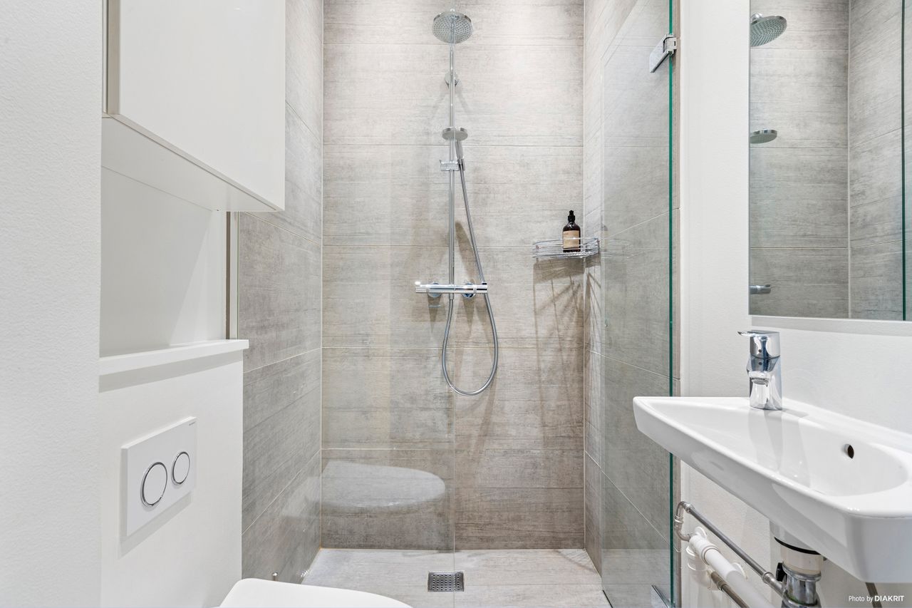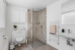 Stort badeværelse i stueplan i nyere stand med gulvvarme og separat bruseniche, unidrain og væghængt toilet. Super velholdt stand.