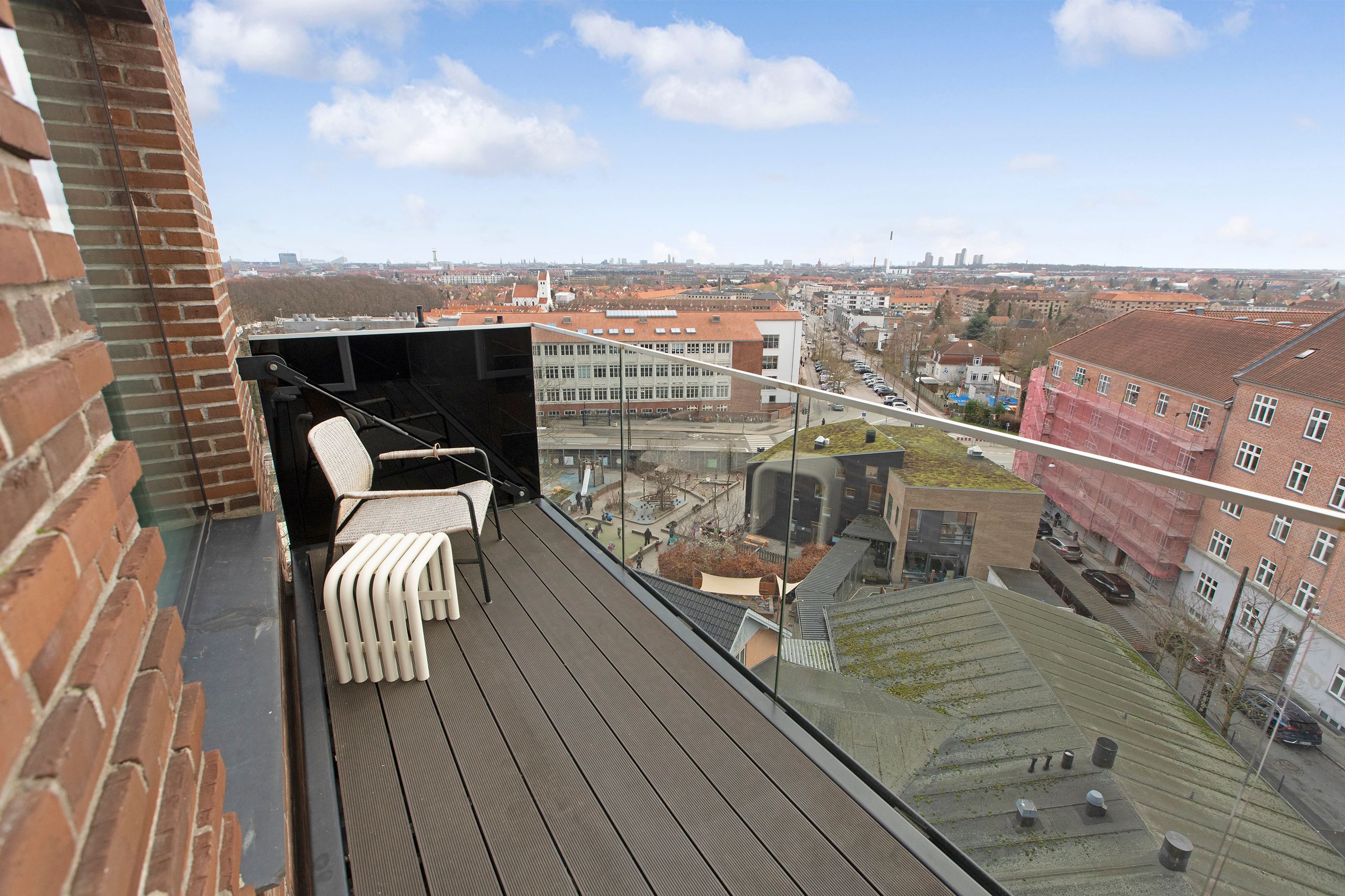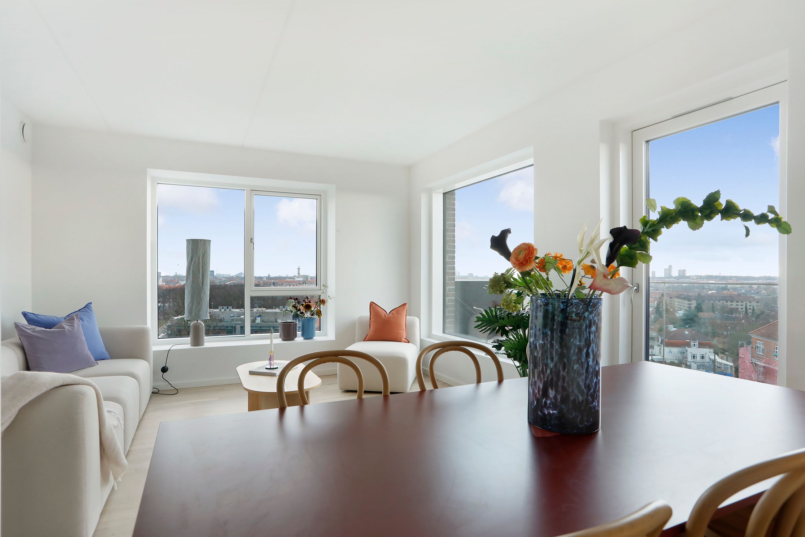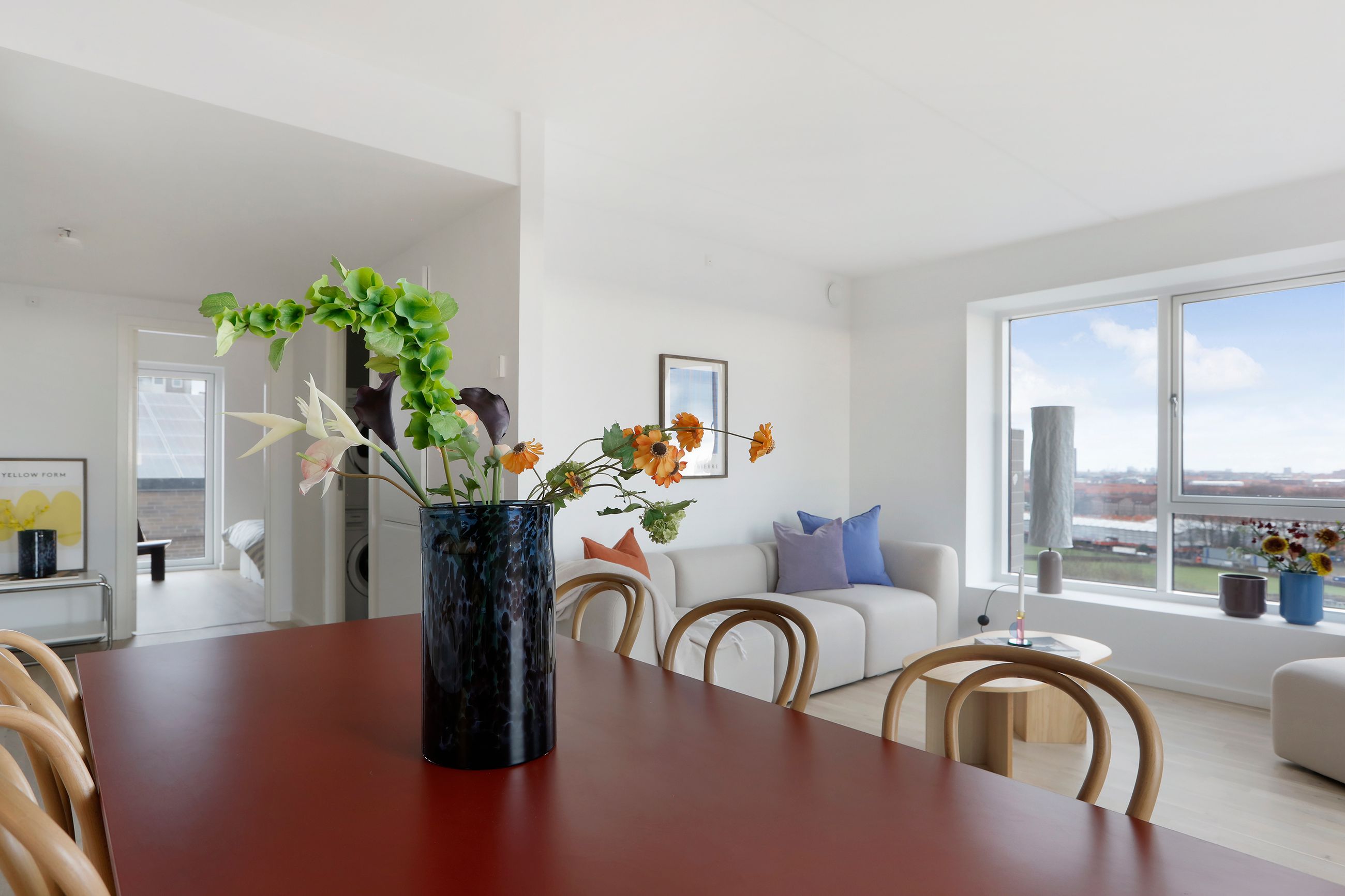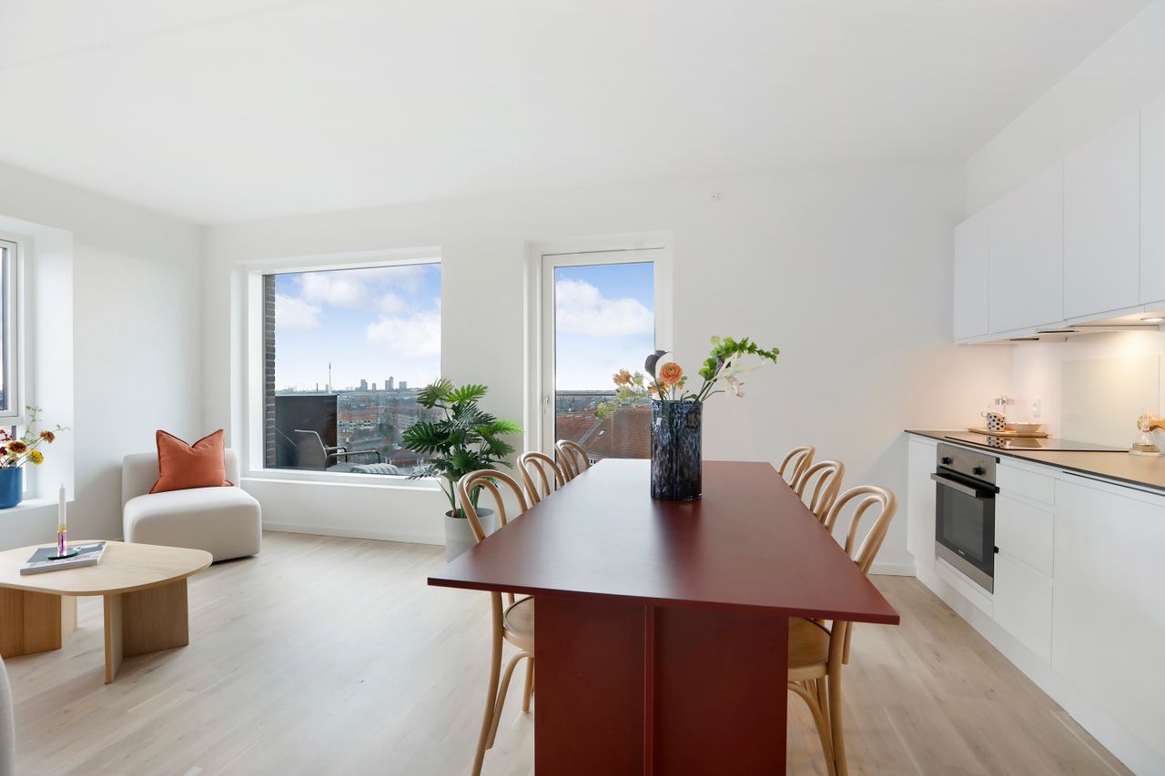 Lejlighedens hjerte er det store, åbne køkken/alrum, der ligger i direkte forbindelse med den ekstrem lyse stue. Det stilrene køkken er opført med hvide skabs- og køkkenmoduler, integreret opvaskemaskine og masser af opbevaringsplads. Her er der rig mulighed for at samles om madlavningen, samtidig med at der er plads til afslapning i stuen. Fra stuen er der udgang til den store sydvendte altan, hvorfra du kan nyde den friske luft og udsigten over København – et perfekt sted til afslapning eller hyggelige stunder med familie og venner.