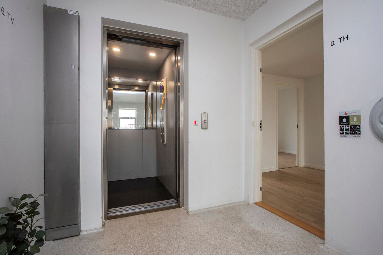 Ejendommen tilbyder desuden moderne bekvemmeligheder som elevator og mulighed for leje eller køb af egen parkeringsplads.
