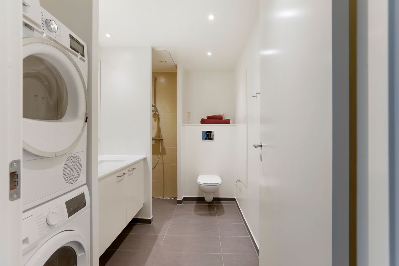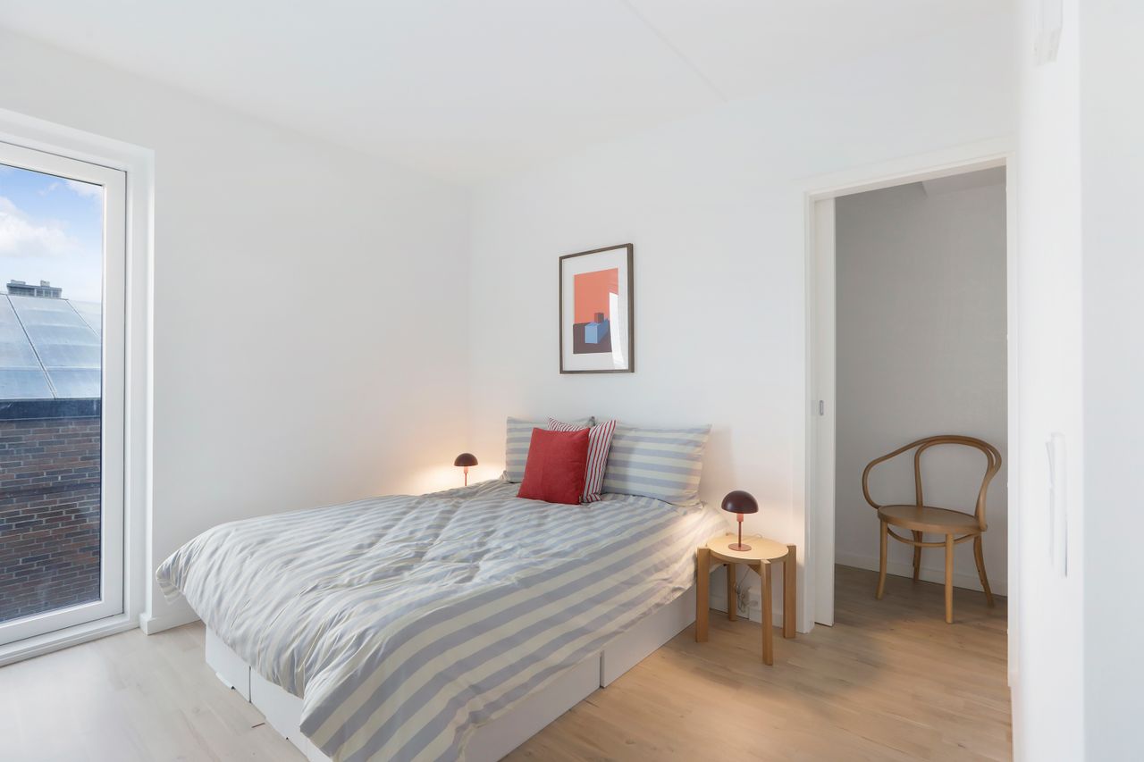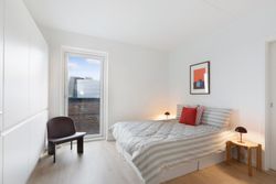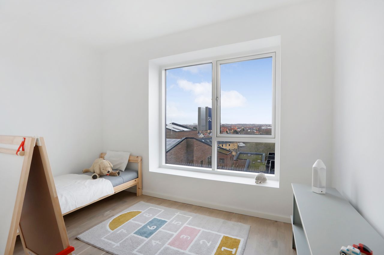 Lejligheden har et stort soveværelse med direkte adgang til et walk-in-closet/depotrum via en stilfuld skydedør, hvilket giver ekstra opbevaringsplads og et eksklusivt touch. Derudover er der et ekstra værelse, der egner sig perfekt som kontor, børneværelse eller gæsteværelse. Badeværelset er rummeligt og moderne, med separat bruseniche og vaskesøjle, hvilket giver et praktisk og rent udtryk.