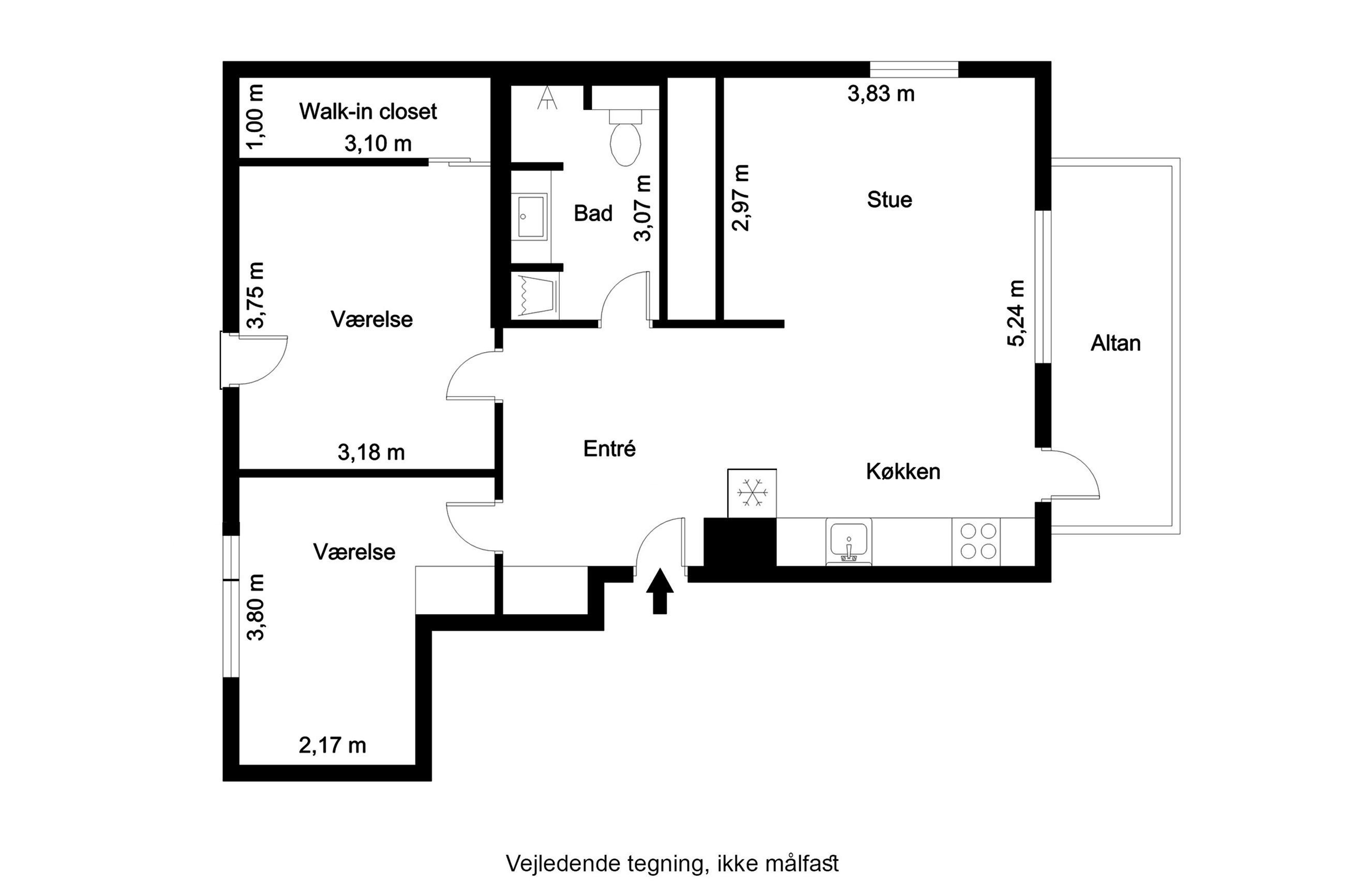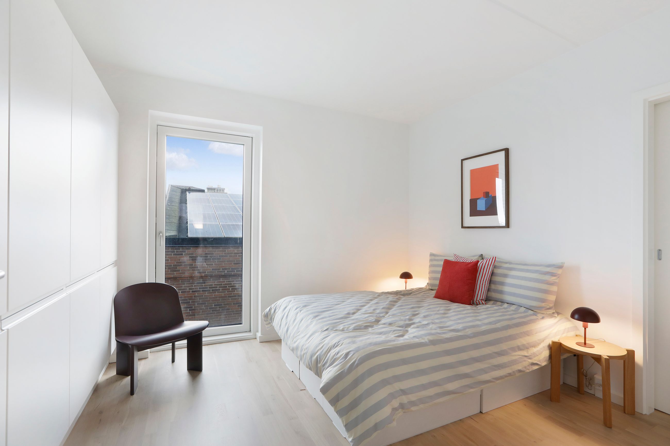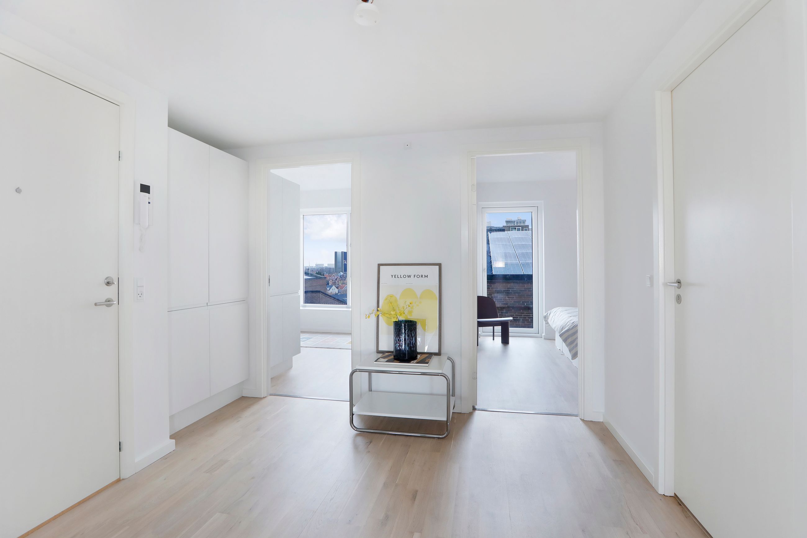 Lejligheden har et stort soveværelse med direkte adgang til et walk-in-closet/depotrum via en stilfuld skydedør, hvilket giver ekstra opbevaringsplads og et eksklusivt touch. Derudover er der et ekstra værelse, der egner sig perfekt som kontor, børneværelse eller gæsteværelse. Badeværelset er rummeligt og moderne, med separat bruseniche og vaskesøjle, hvilket giver et praktisk og rent udtryk.