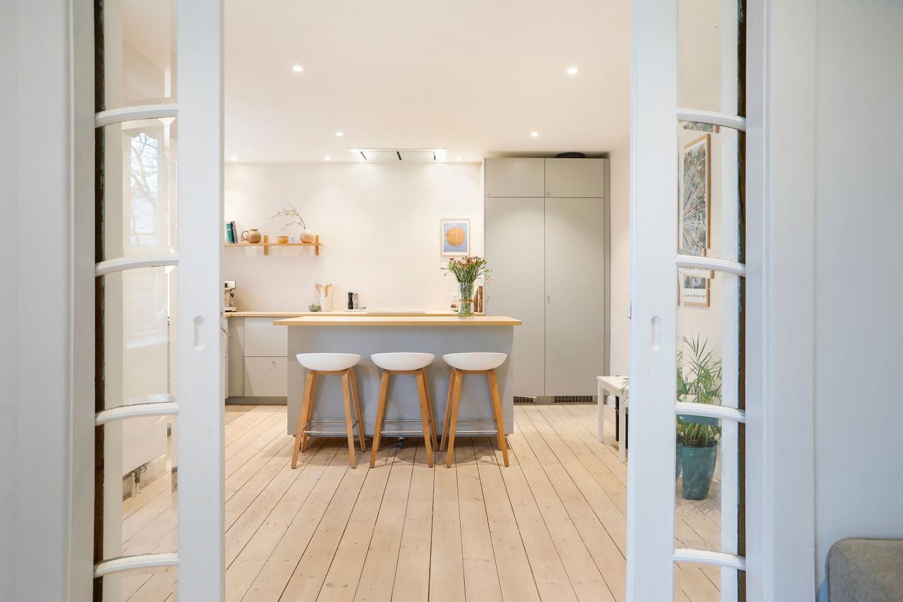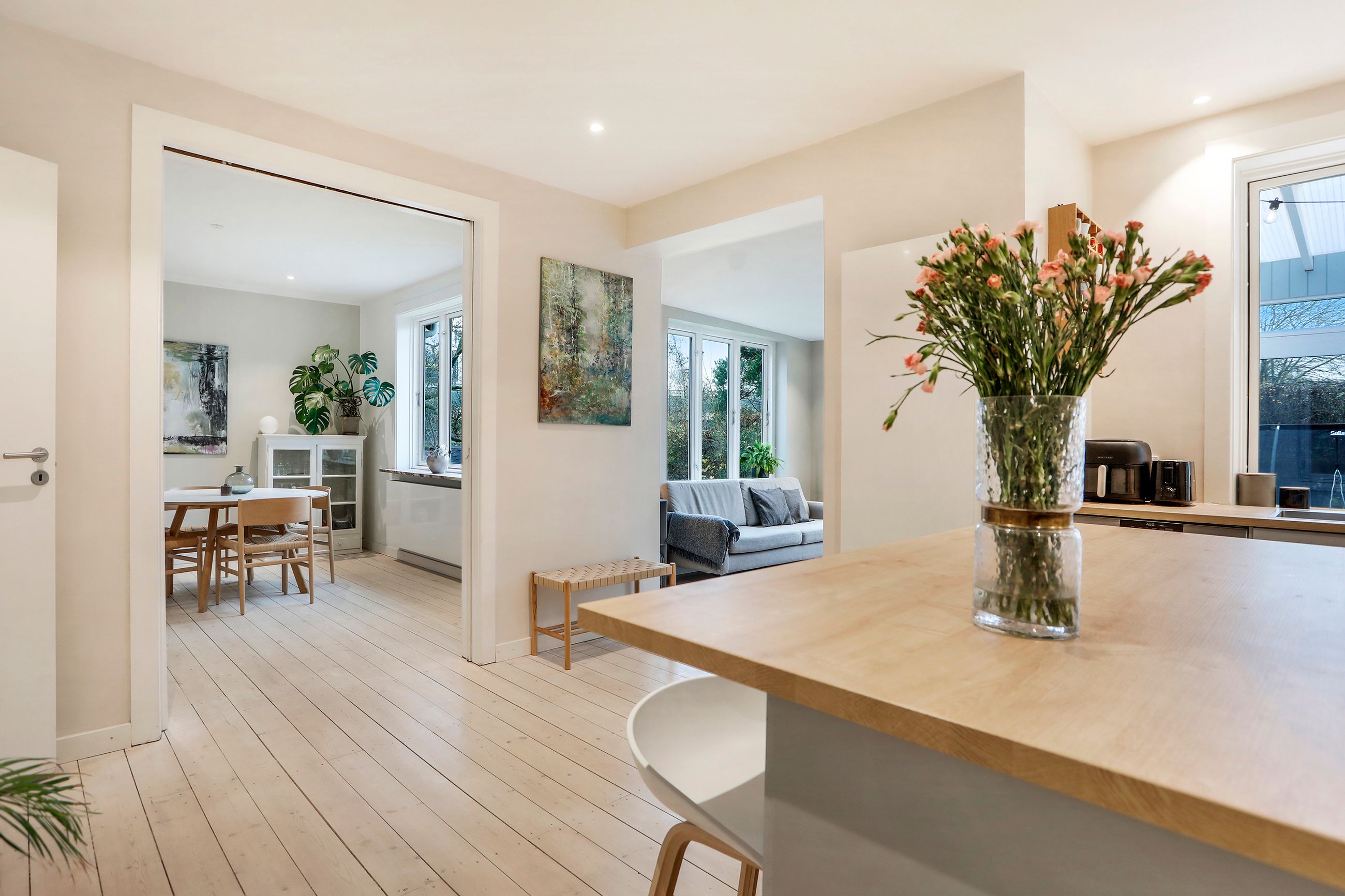 Ejendommen er løbende moderniseret med stor omtanke. Sælger har blandt andet etableret et nyt, stilrent køkken, som er flyttet ind i stuen og skaber et åbent og indbydende opholdsrum med masser af lys og plads til samvær.