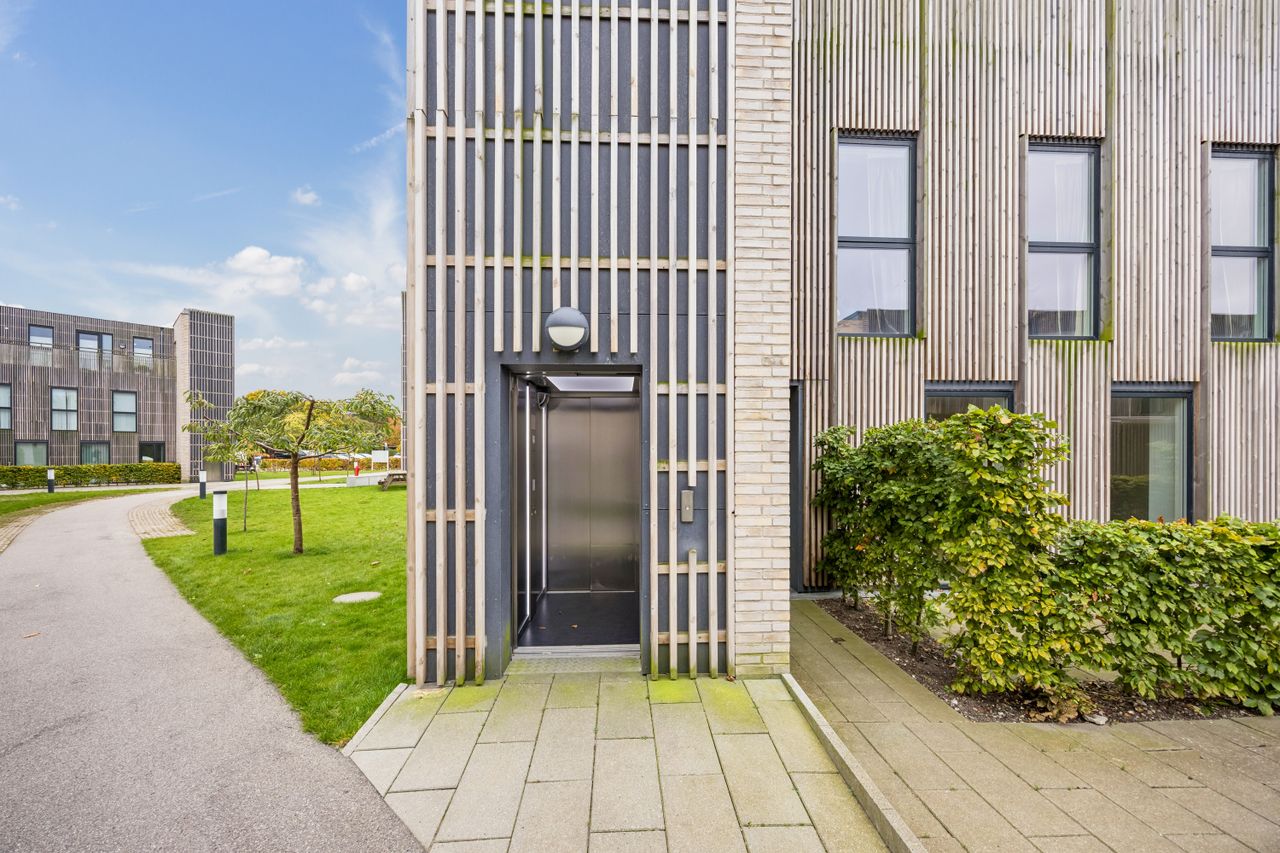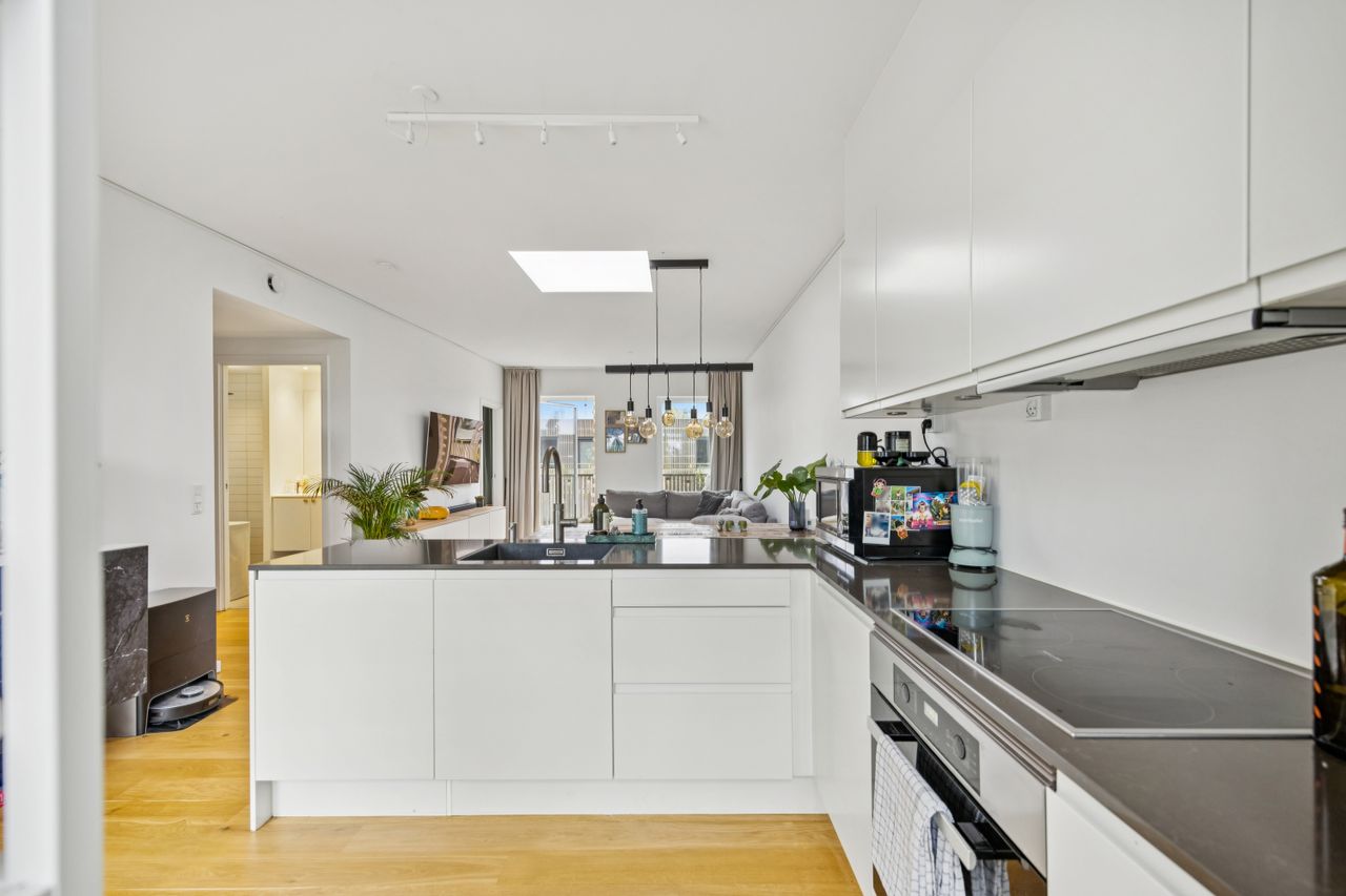 Velkommen til denne fantastiske charmerende 3-værelses lejlighed beliggende i det populære område Kirsebærhaven. Denne moderne bolig, opført i 2019, byder på et boligareal på hele 76 kvadratmeter, der er indrettet med en imponerende planløsning. Når du træder ind i lejligheden, bliver du mødt af et lækkert vinklet køkken, der står i åben forbindelse med den rummelige stue. Dette åbne rum skaber en perfekt ramme for både hverdagsliv og hyggelige sammenkomster.