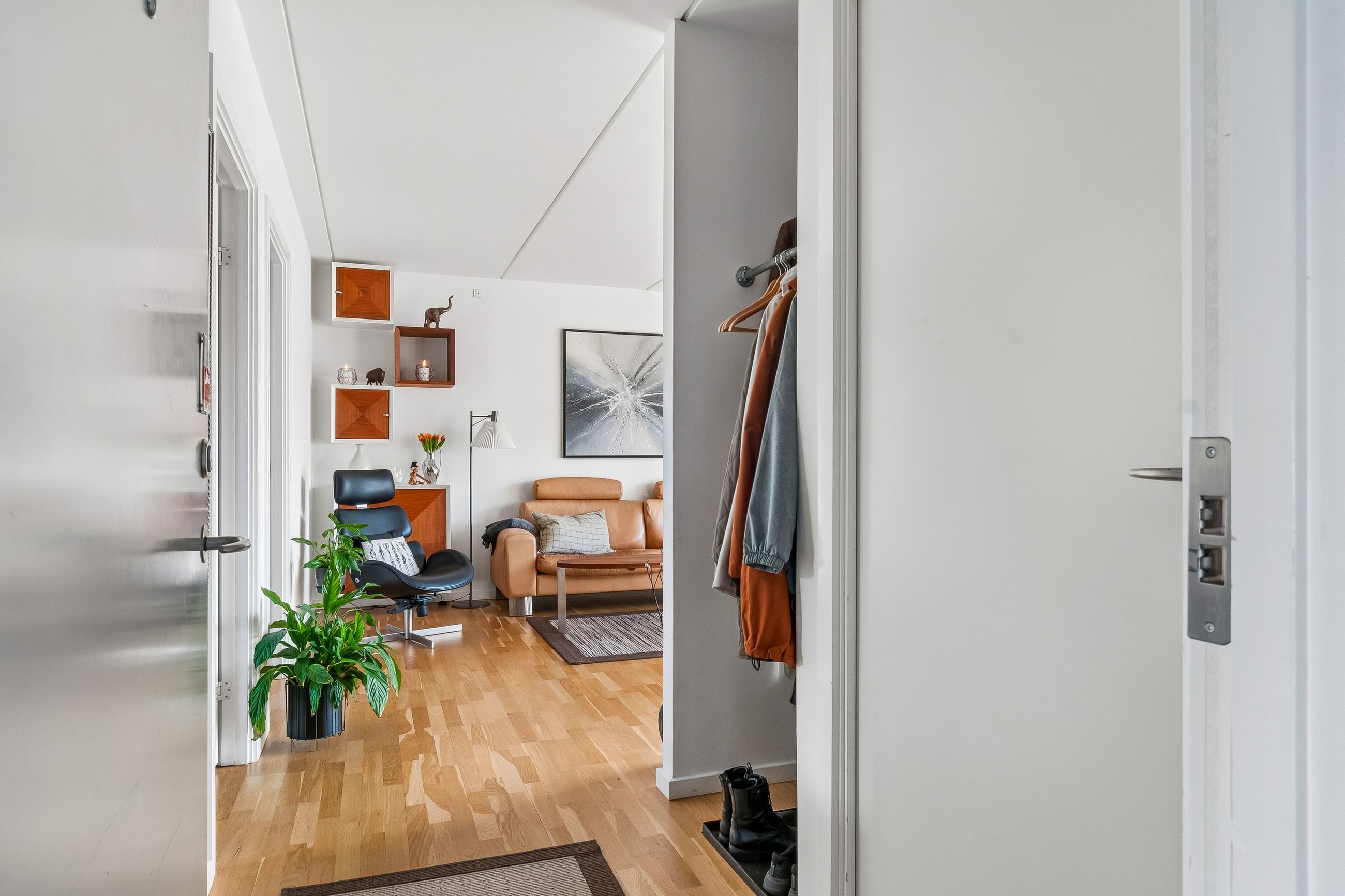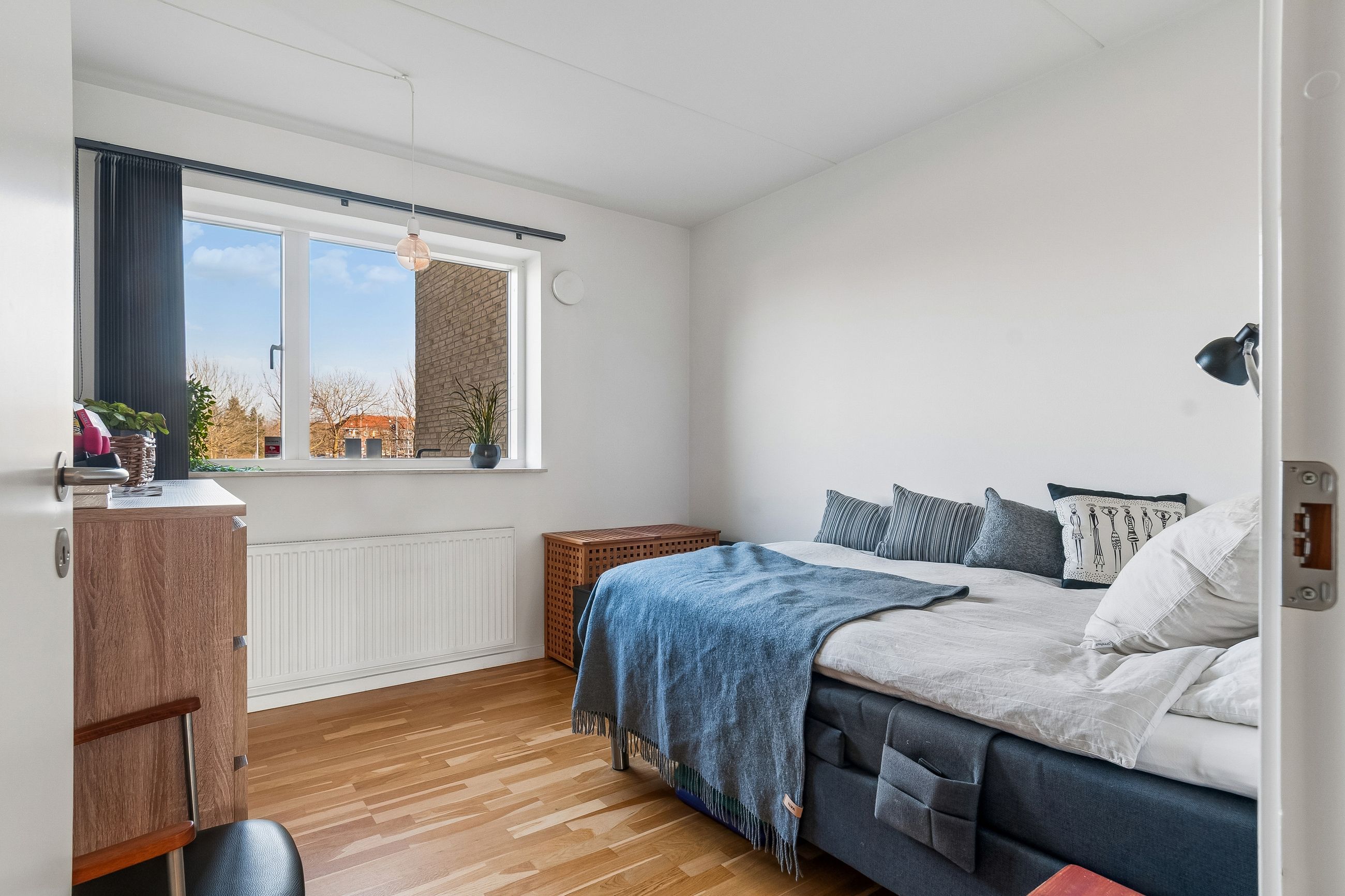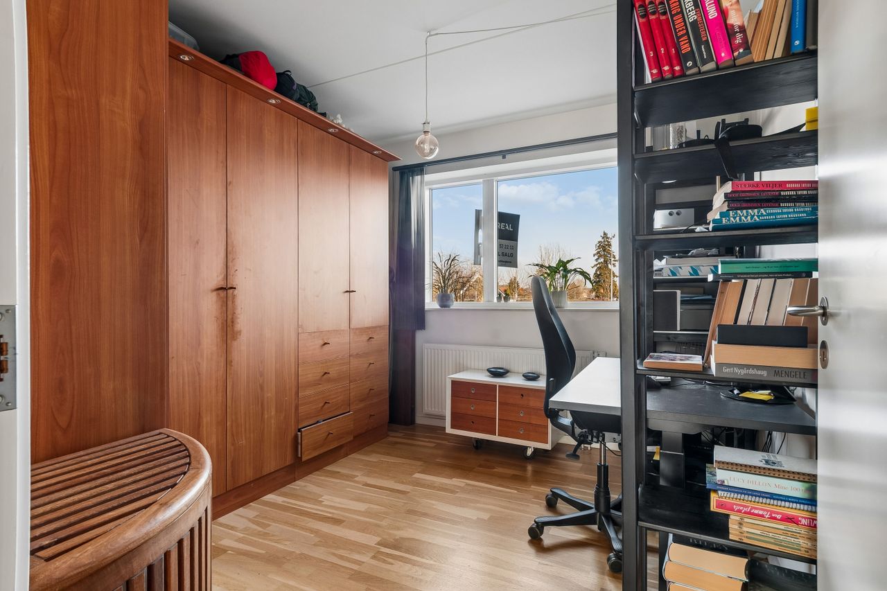 Lejligheden byder også på to rummelige værelser og depotrum i lejligheden placeret i entreen. Badeværelset er stort og funktionelt designet med en vaskesøjle hvor hvidevarene er skiftet til Asko produkter. Her er også separat bruseniche.