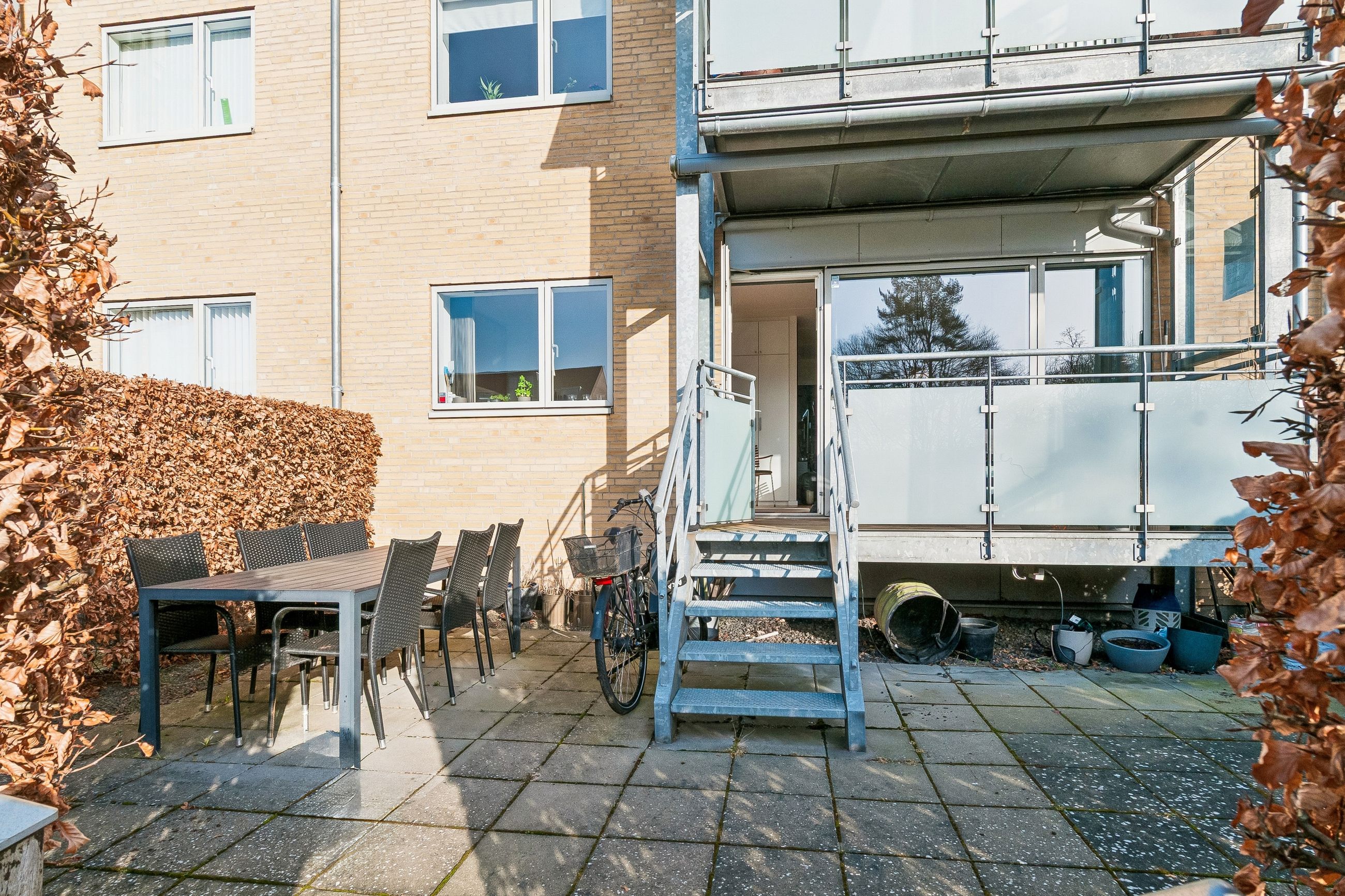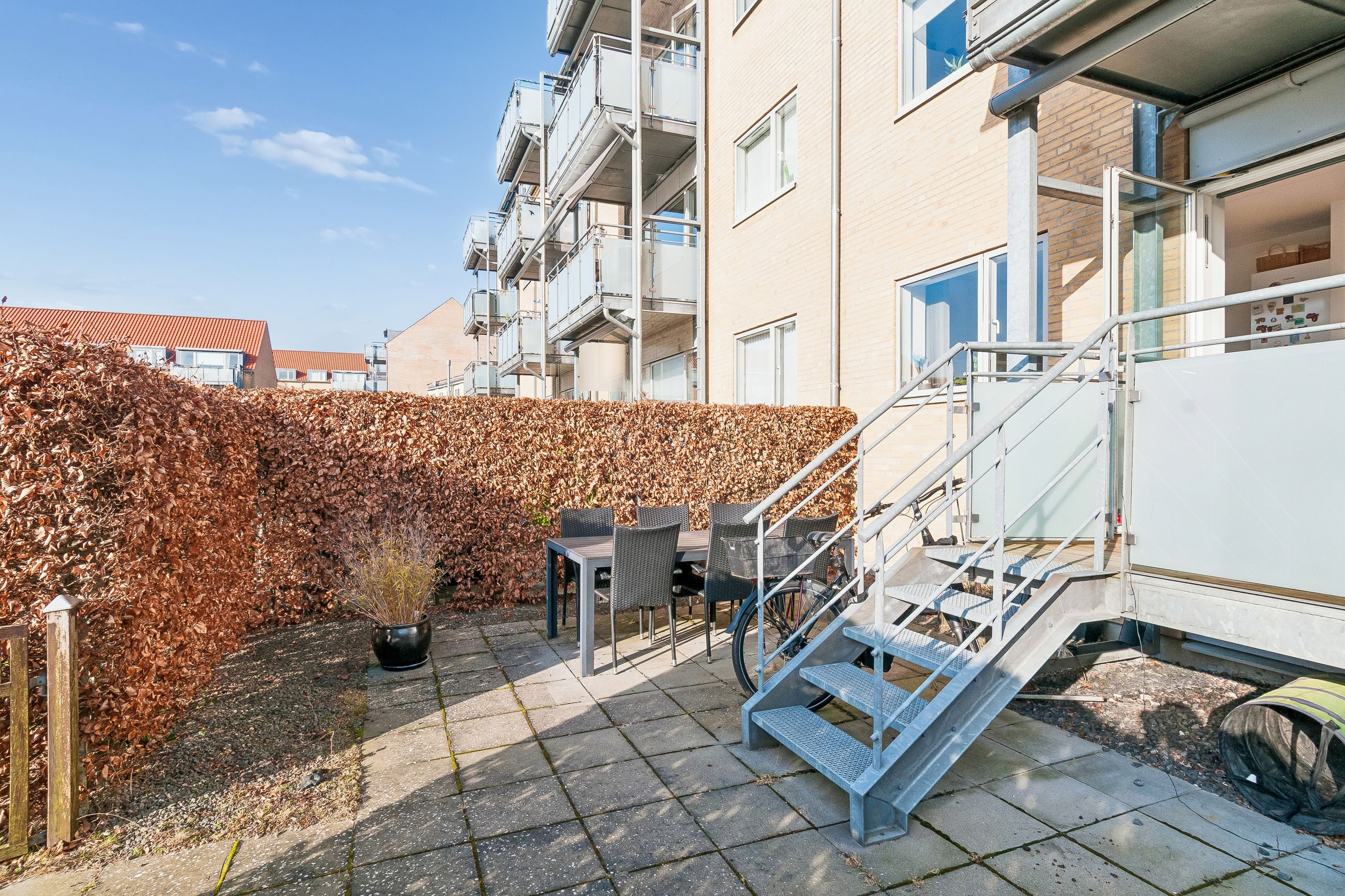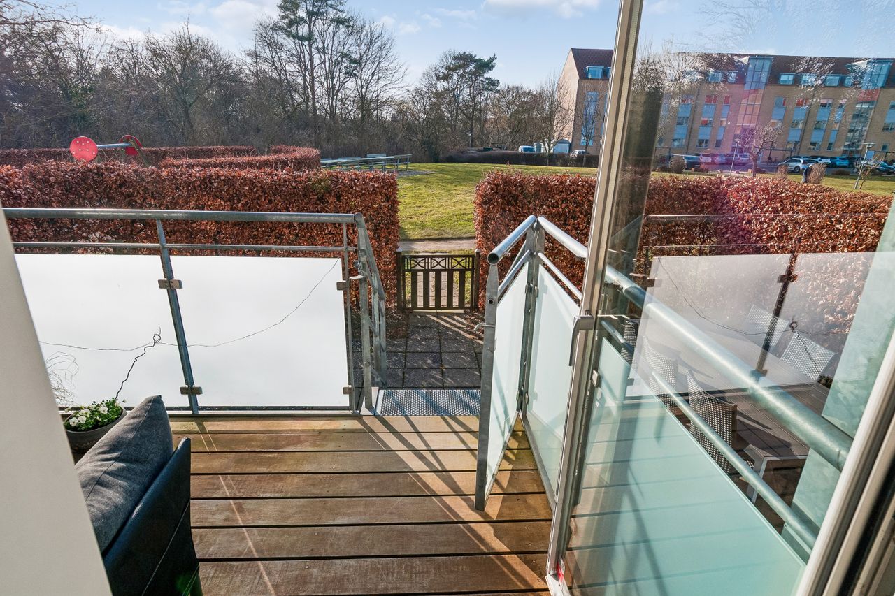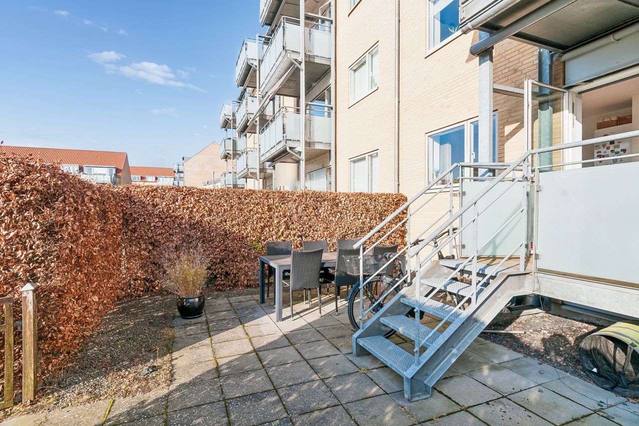 Ejendommen er nyere byggeri og boligen står pæn, velholdt og fuldstændig indflytningsklar. De skønne grønne fællesarealer tilbyder både ro og mulighed for socialt samvær blandt naboerne. Til lejligheden hører også en privat have samt parkering lige foran opgangen – en sjælden luksus i området.