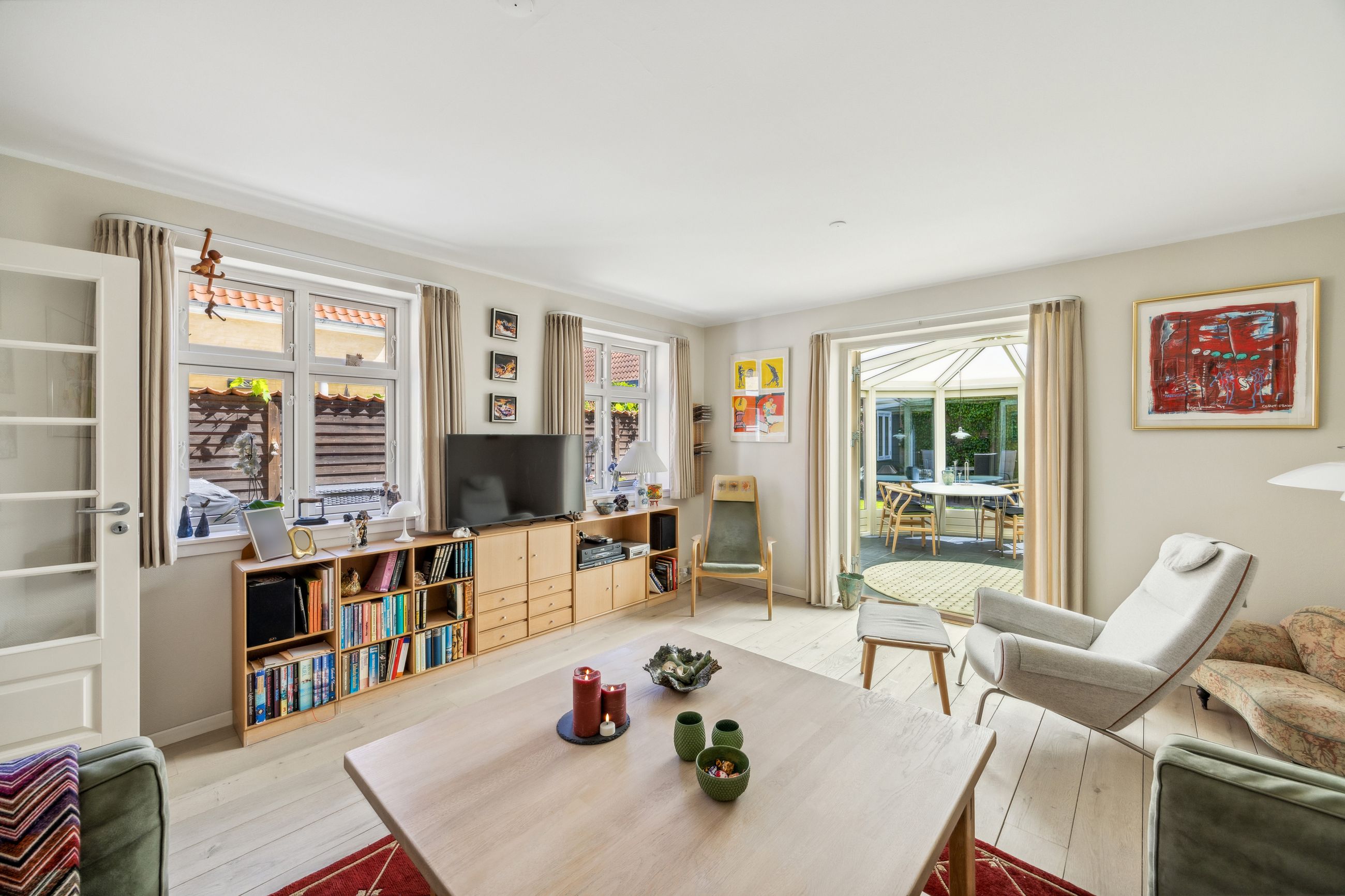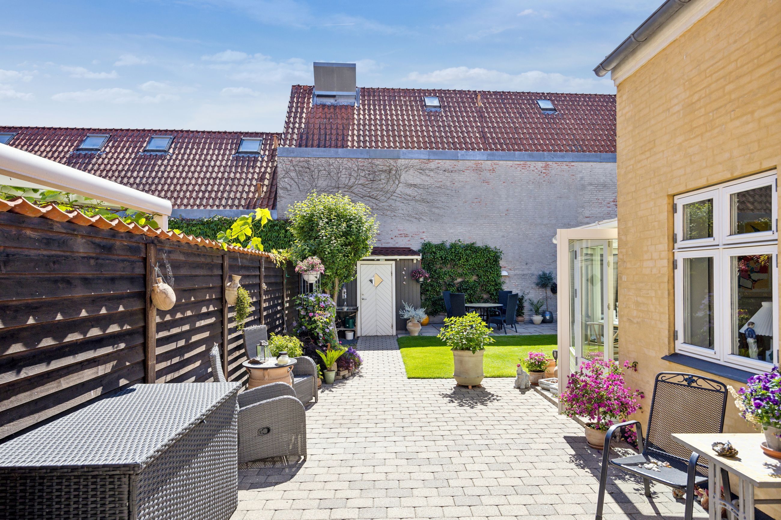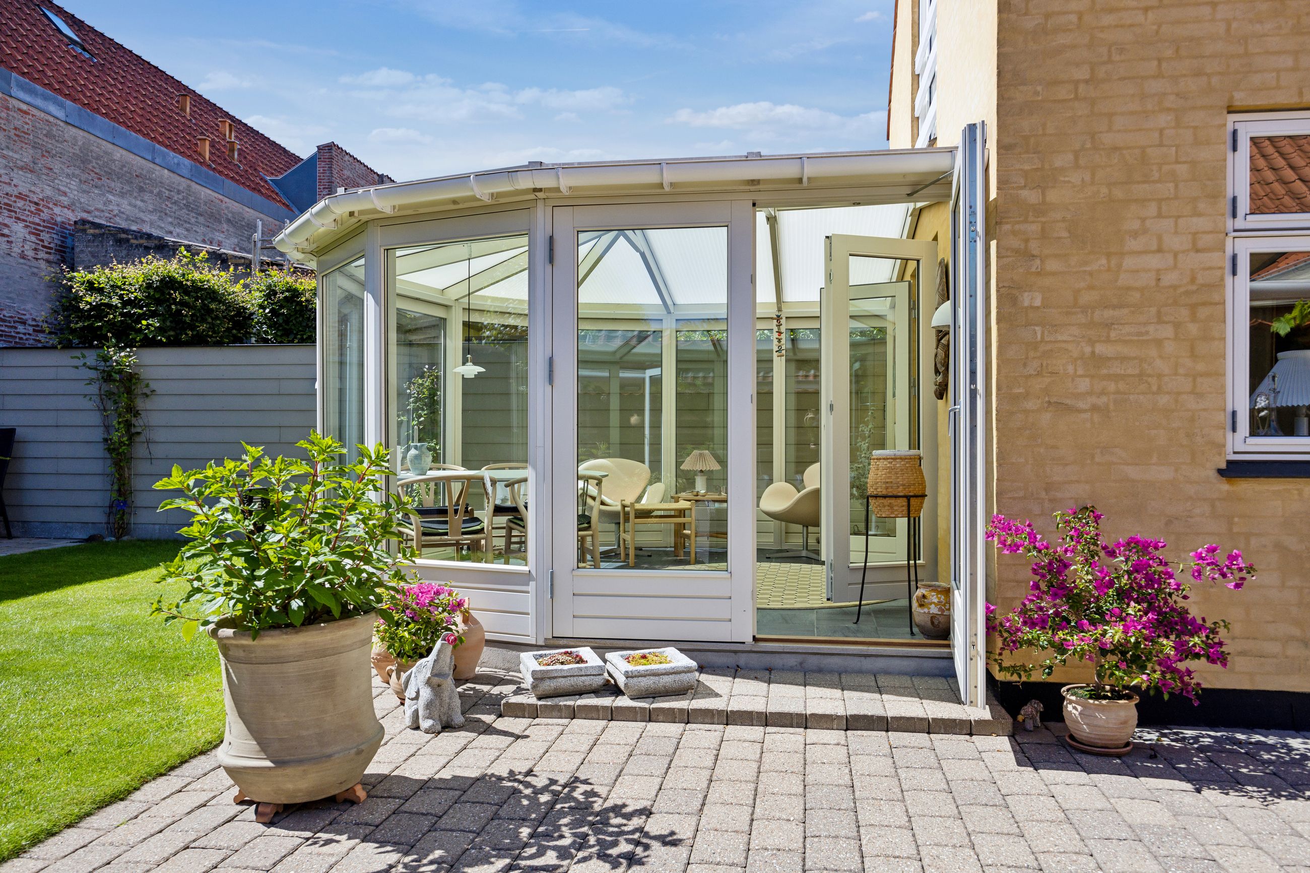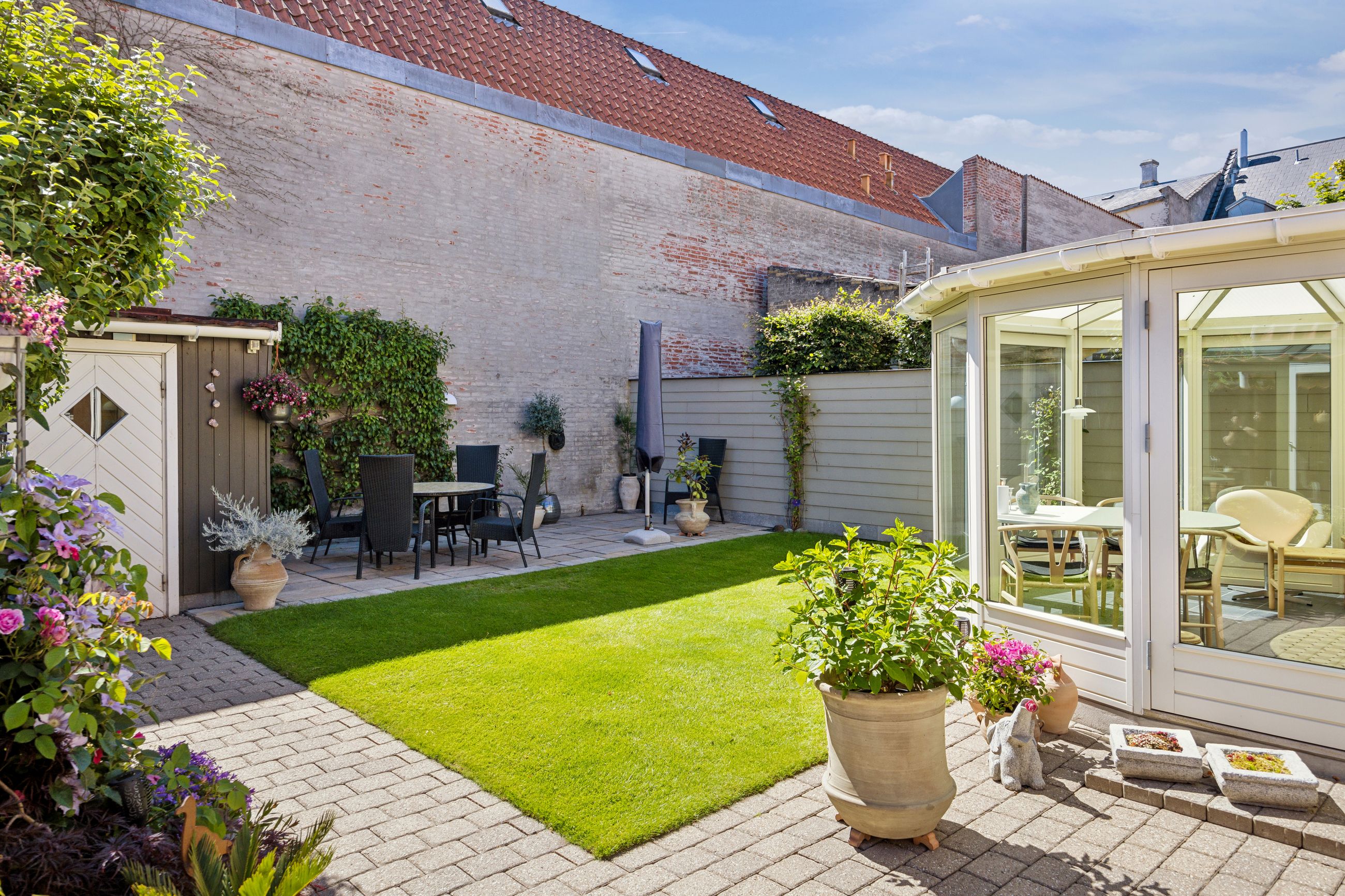 Gårdhaven er intet mindre end et privat paradis med græsarealer og terrasser, hvor lysindfaldet spiller smukt henover dagen. Den ugenerede atmosfære gør det til et ideelt sted at nyde roen midt i byen. Stueetagen byder også på en hyggelig stue med plankegulve samt en vidunderlig udestue med klinker og gulvvarme – her kan du nyde lyset året rundt.