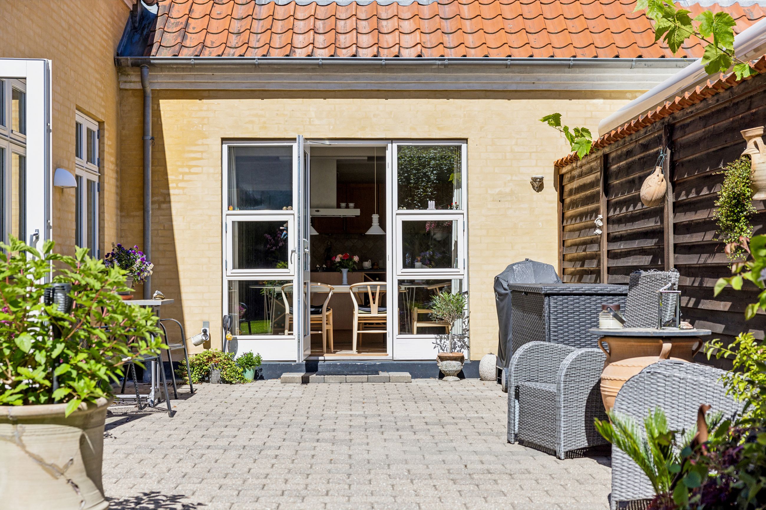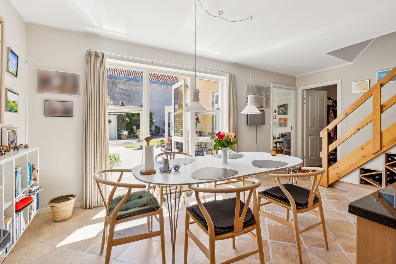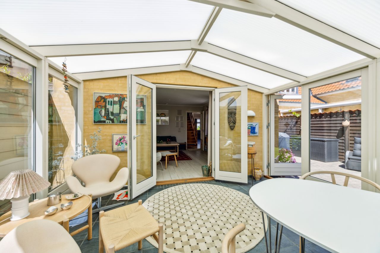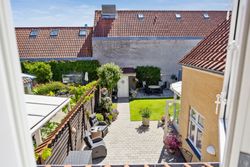 Gårdhaven er intet mindre end et privat paradis med græsarealer og terrasser, hvor lysindfaldet spiller smukt henover dagen. Den ugenerede atmosfære gør det til et ideelt sted at nyde roen midt i byen. Stueetagen byder også på en hyggelig stue med plankegulve samt en vidunderlig udestue med klinker og gulvvarme – her kan du nyde lyset året rundt.