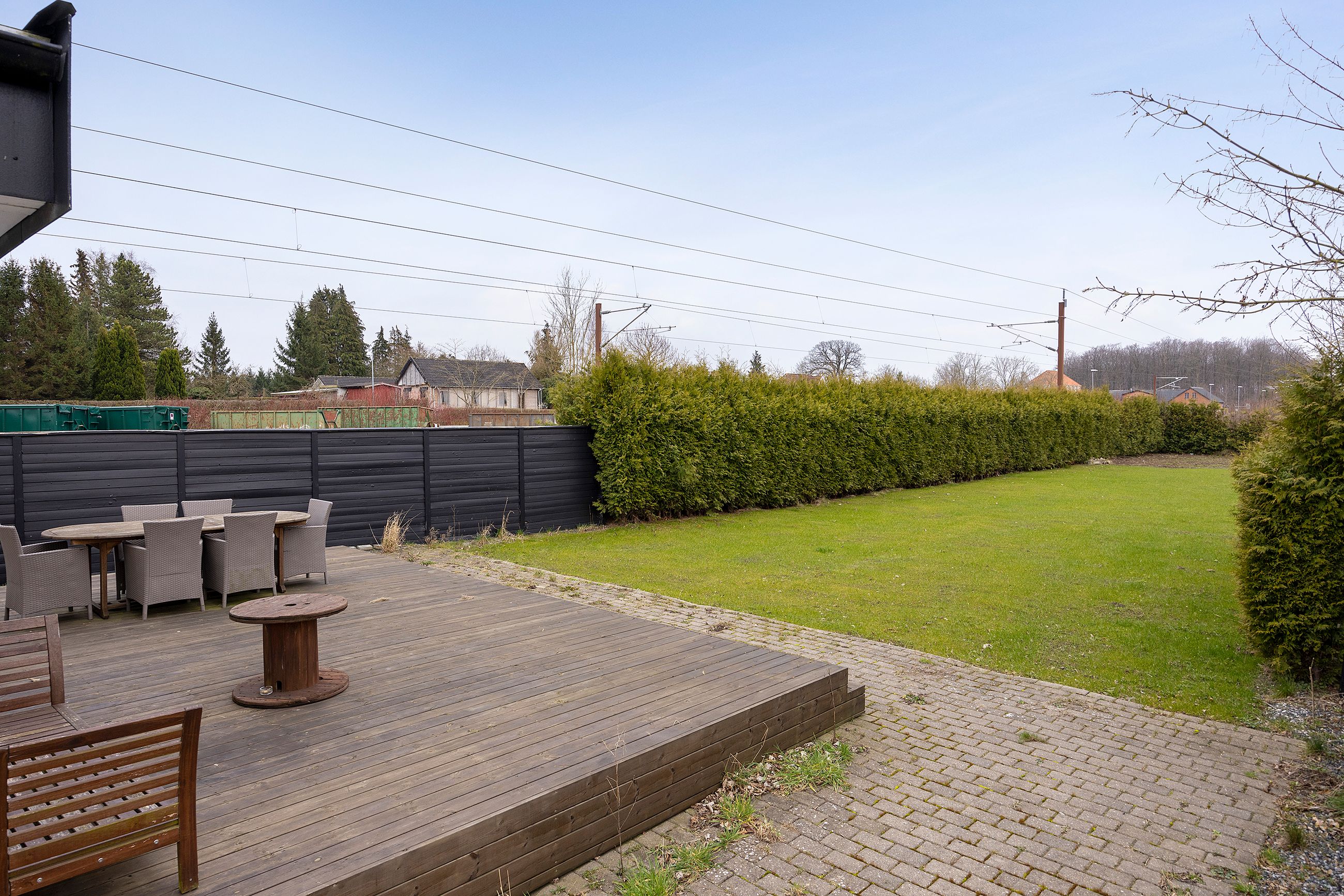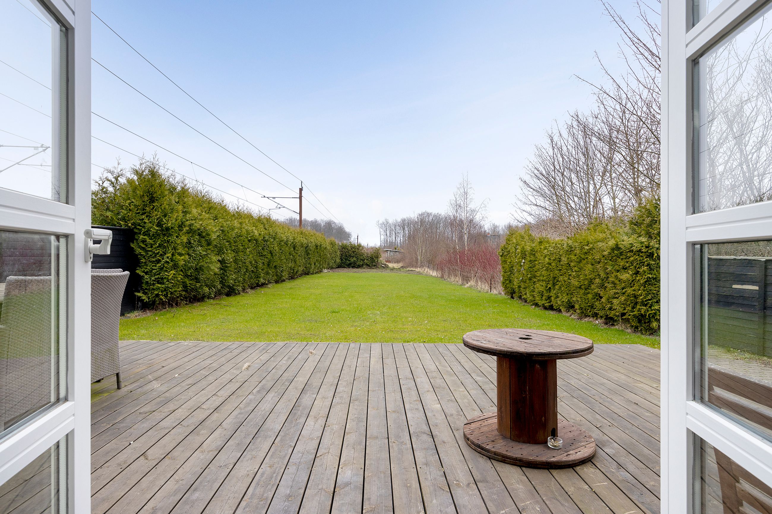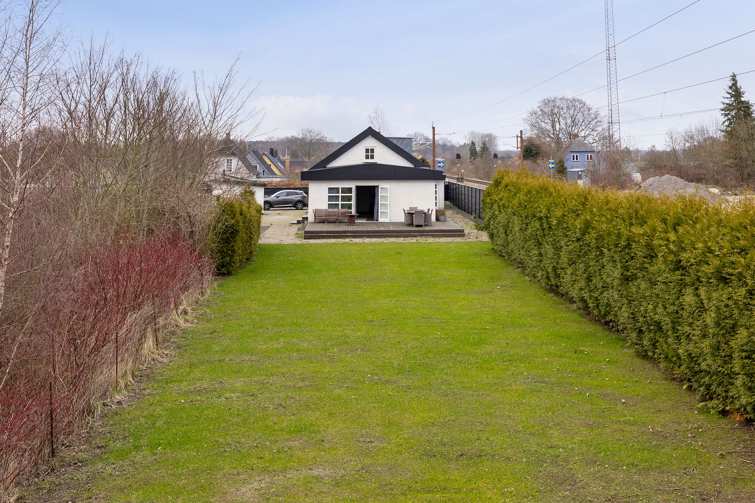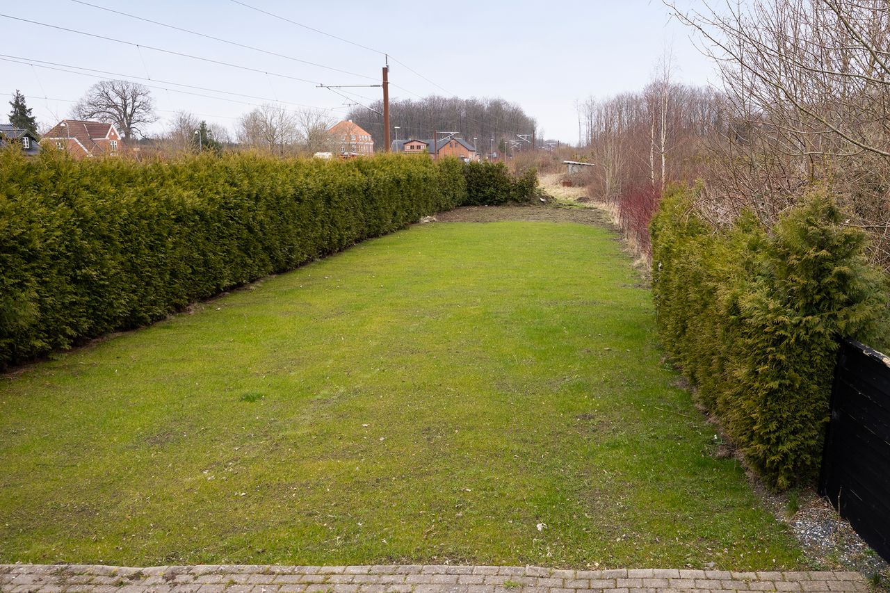 store grund giver anledning til en aflang have, hvor en nem græsplæne ligger godt afskærmet af hæk og