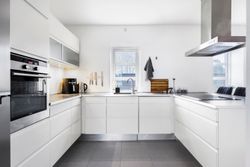 Det rummelige køkken giver sig til kende med grebsfrie fronter, integrerede hårde hvidevarer og