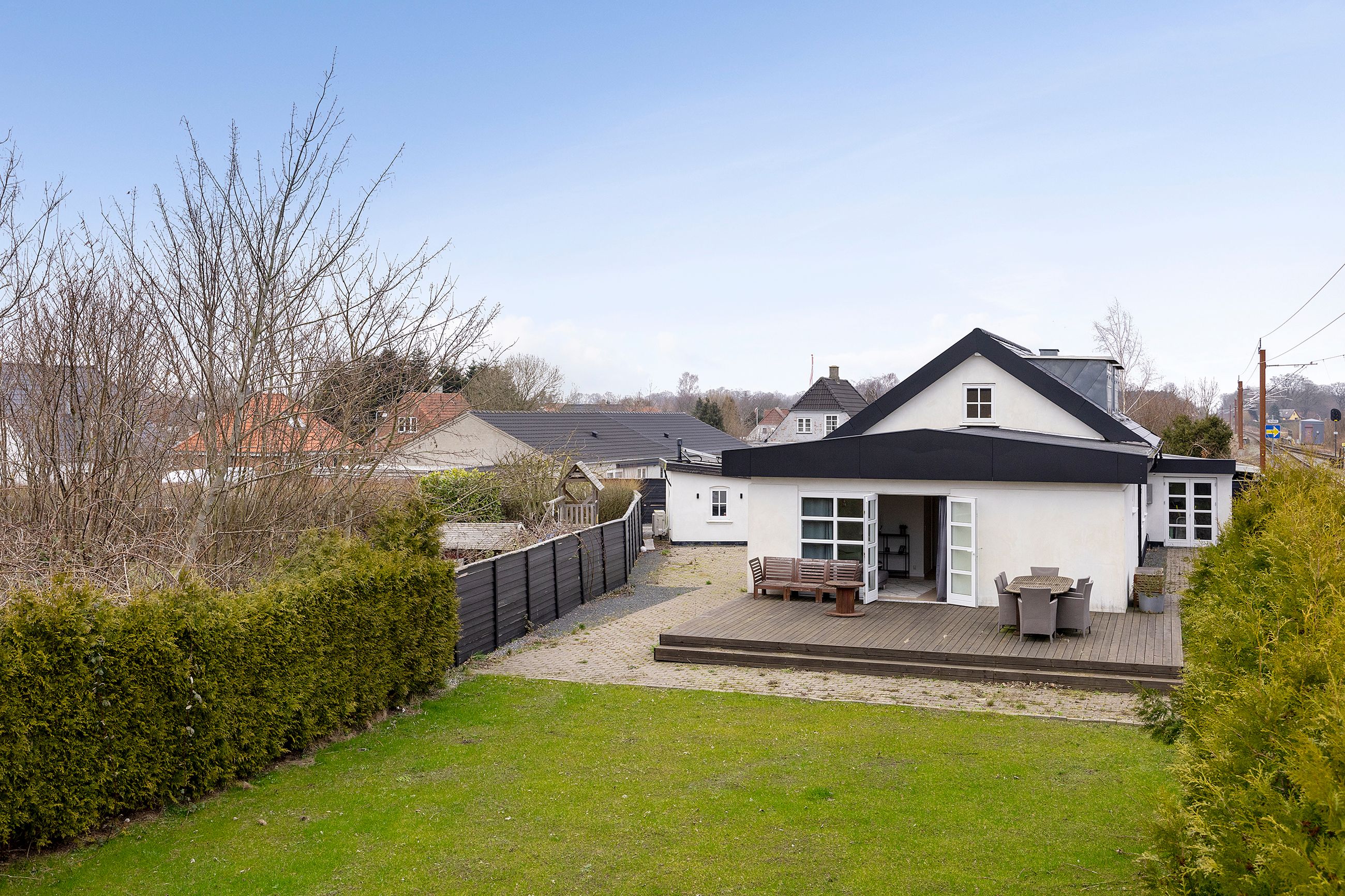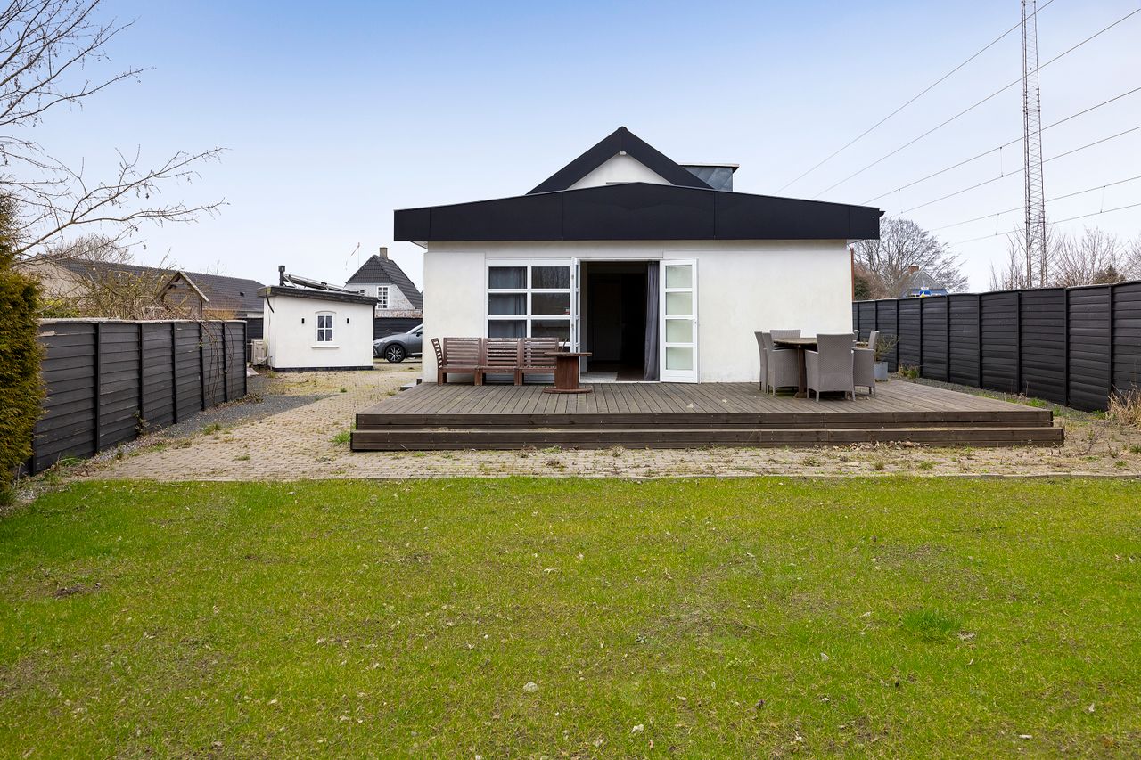 fortil, mens den mod sydvest giver plads til en ideelt placeret træterrasse. Bilen kan I parkere i den