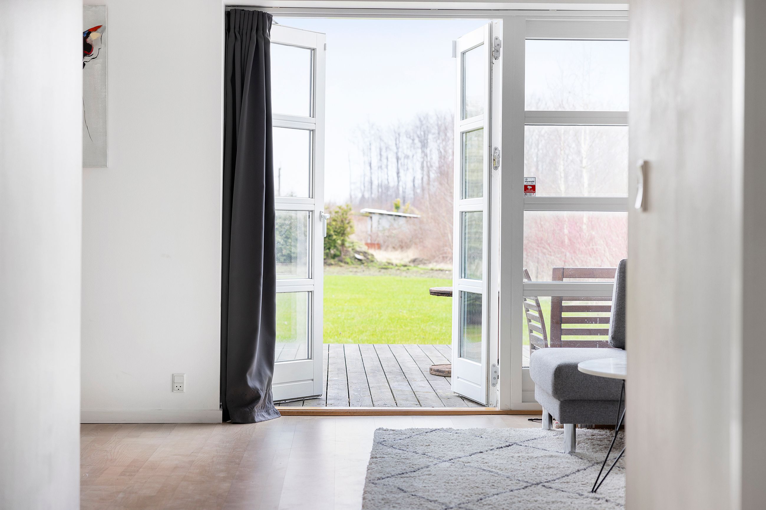 Herfra passerer I to værelser på vej til den store stue, hvor brede vinduer og glasindfattede dobbeltdøre
