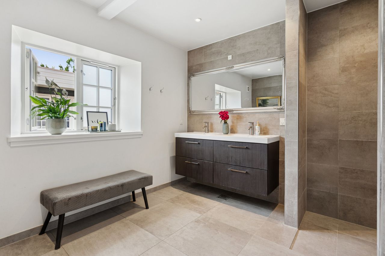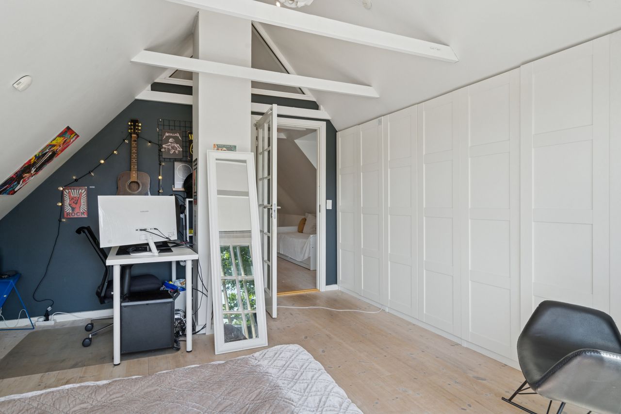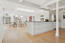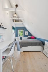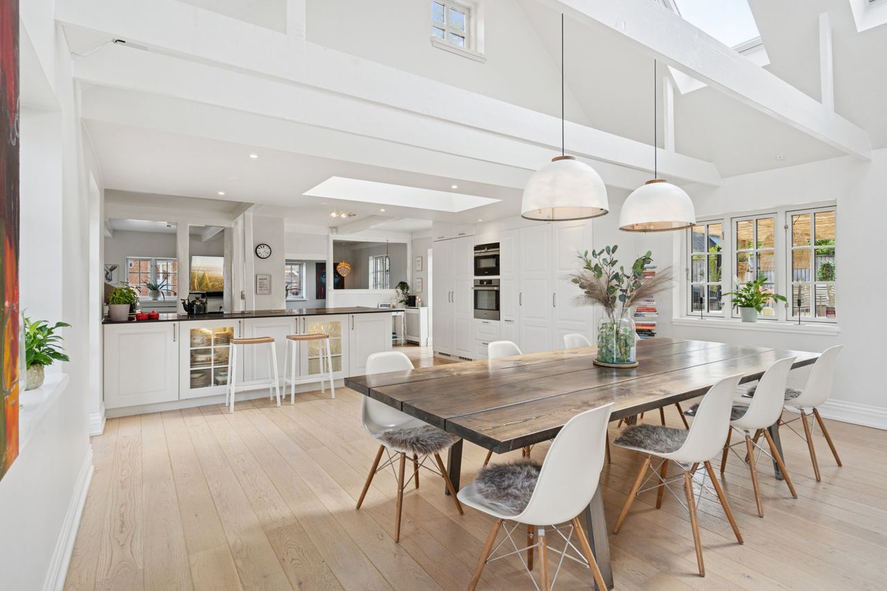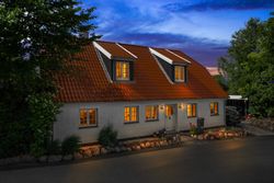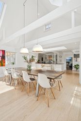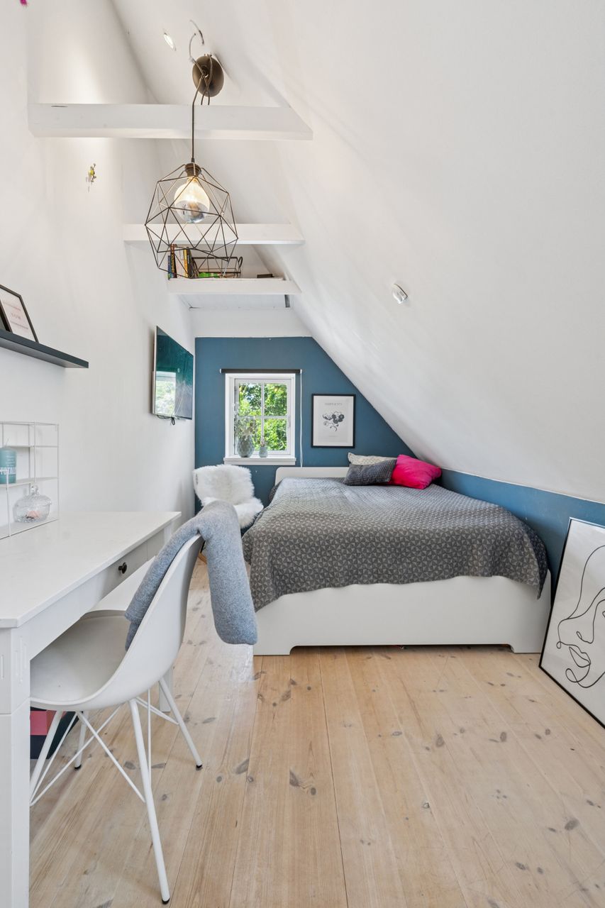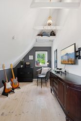 Husets hjerte er det indbydende køkken-alrum, som blev renoveret i 2017. Her kan familien samles omkring måltiderne i lyse omgivelser med udsigt til den syd-vest vendte have. Boligen byder på fem rummelige soveværelser og to moderne badeværelser fra 2017, samt et ekstra badeværelse i annekset. Gulvvarme sikrer en behagelig temperatur året rundt, dog undtaget værelset mod nord samt køkkenet og tv-stuen.