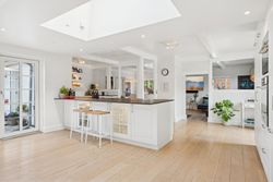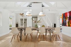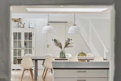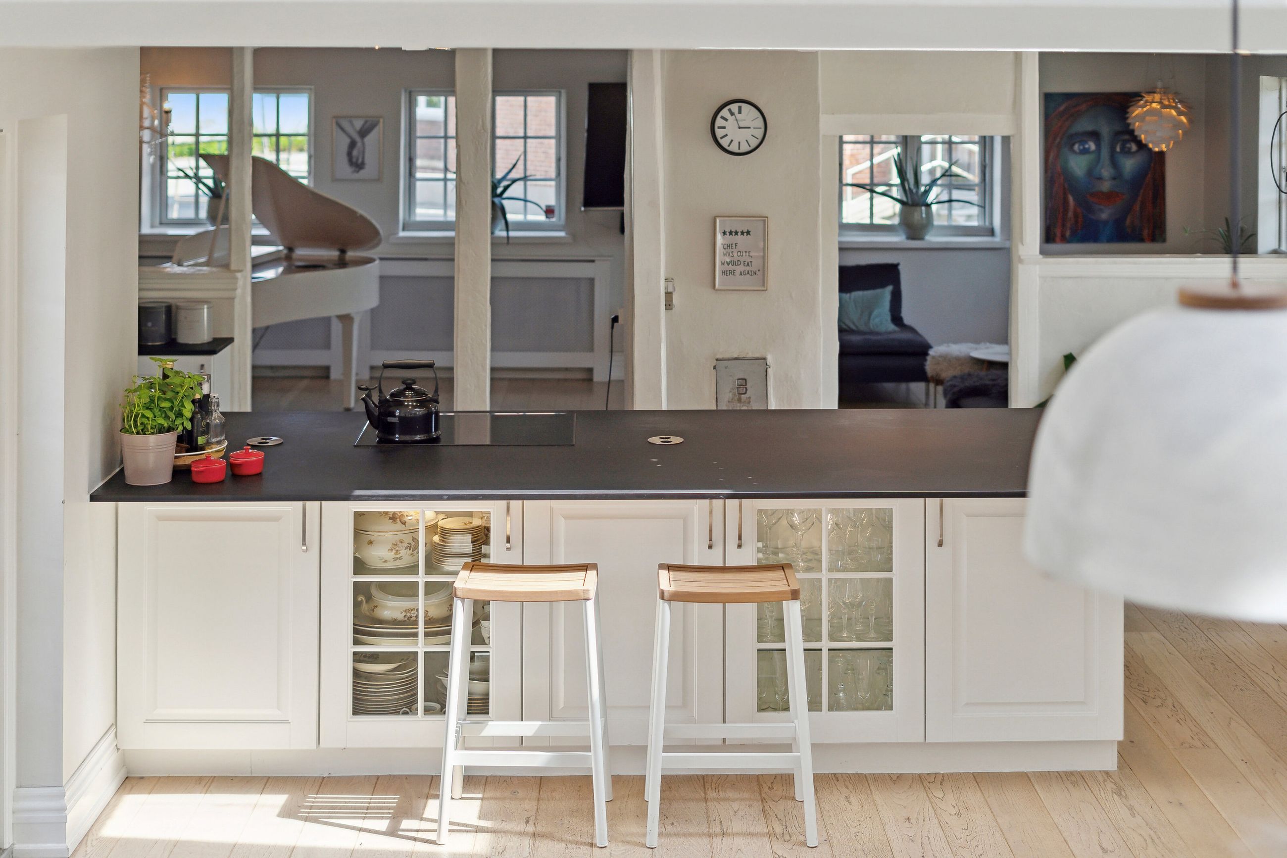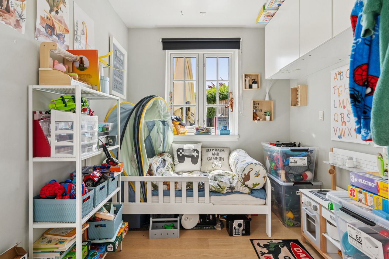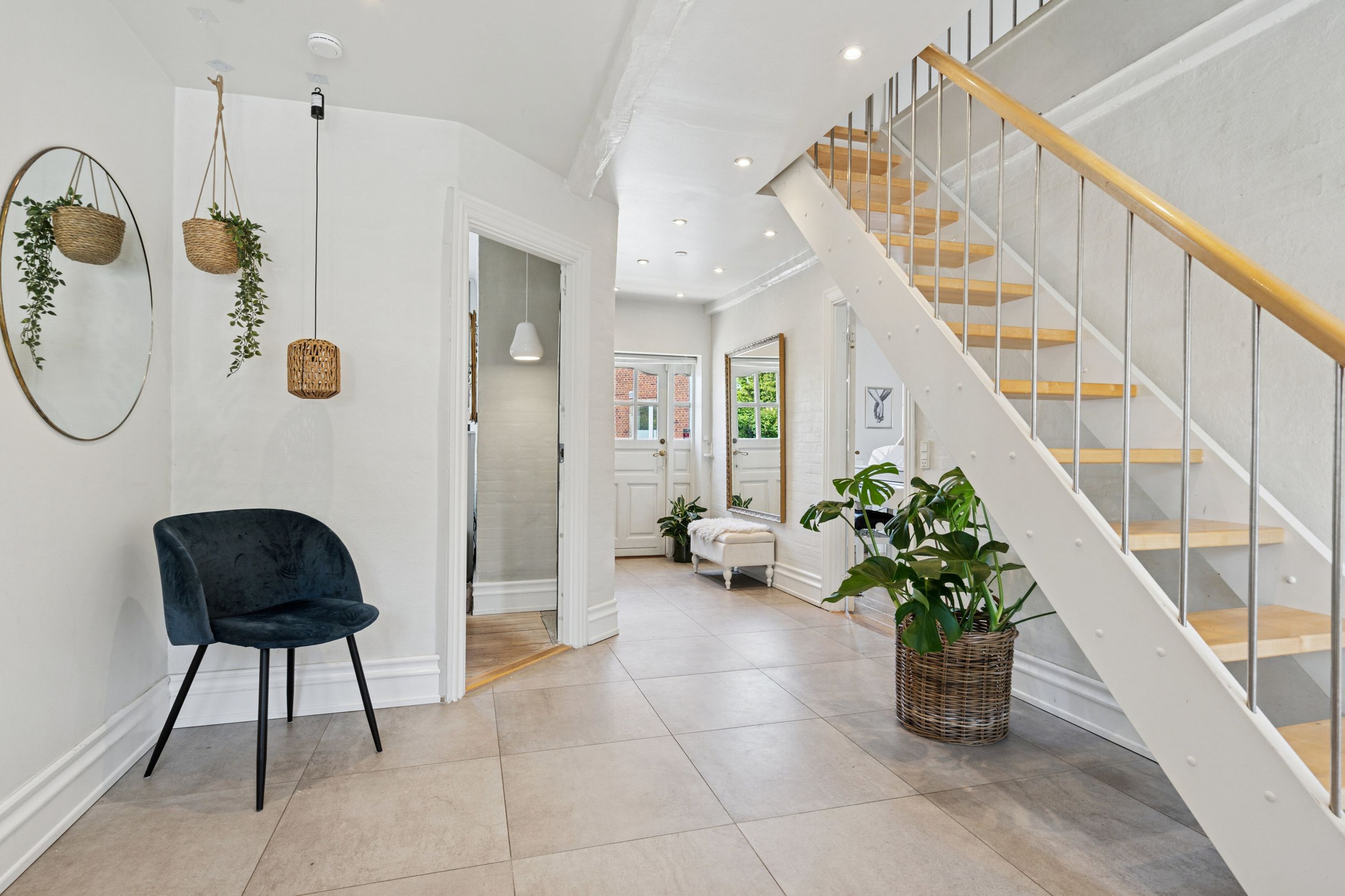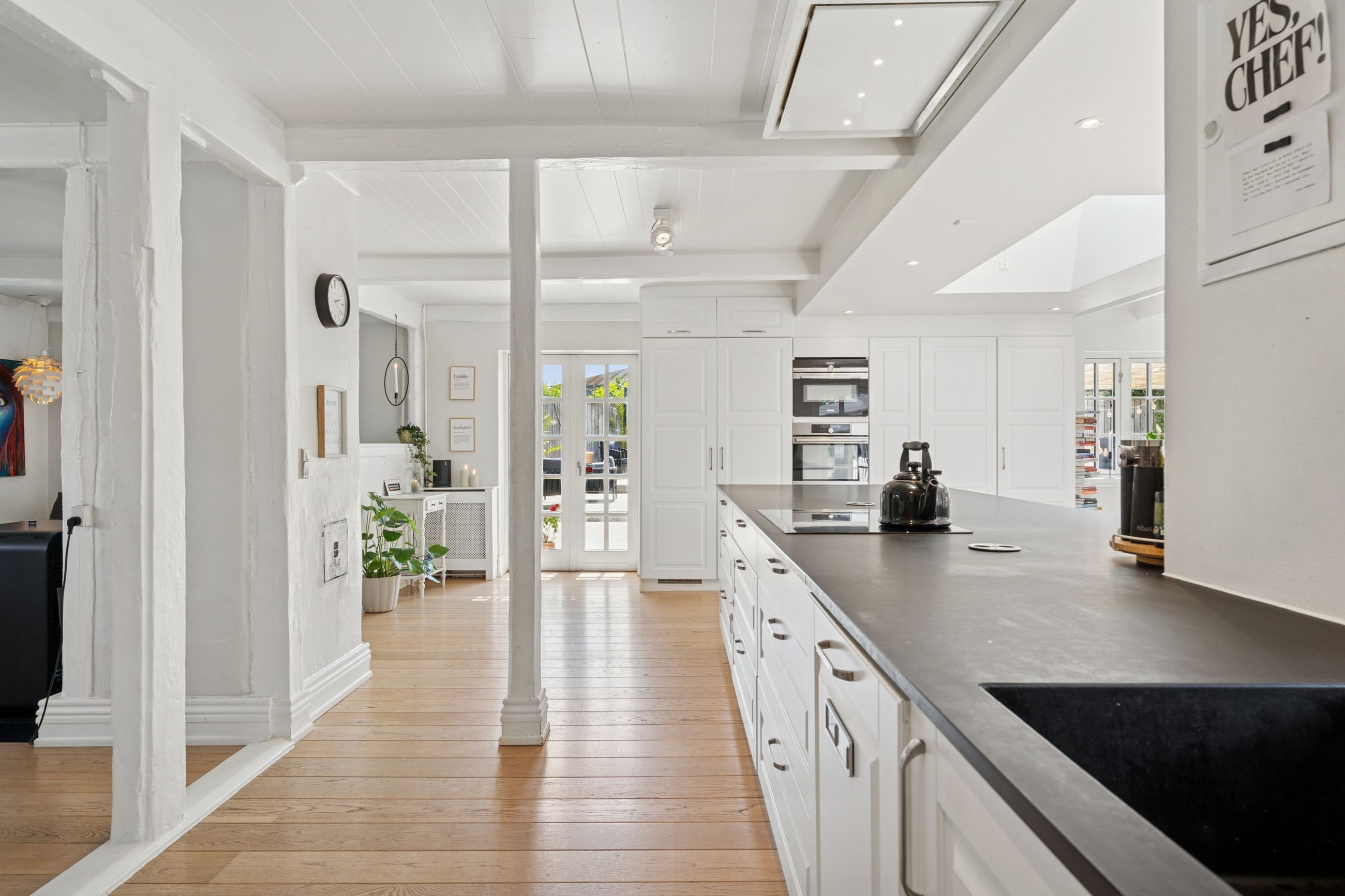 Husets hjerte er det indbydende køkken-alrum, som blev renoveret i 2017. Her kan familien samles omkring måltiderne i lyse omgivelser med udsigt til den syd-vest vendte have. Boligen byder på fem rummelige soveværelser og to moderne badeværelser fra 2017, samt et ekstra badeværelse i annekset. Gulvvarme sikrer en behagelig temperatur året rundt, dog undtaget værelset mod nord samt køkkenet og tv-stuen.