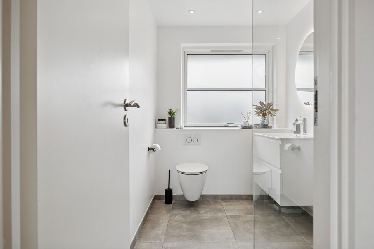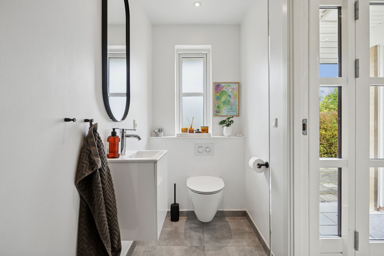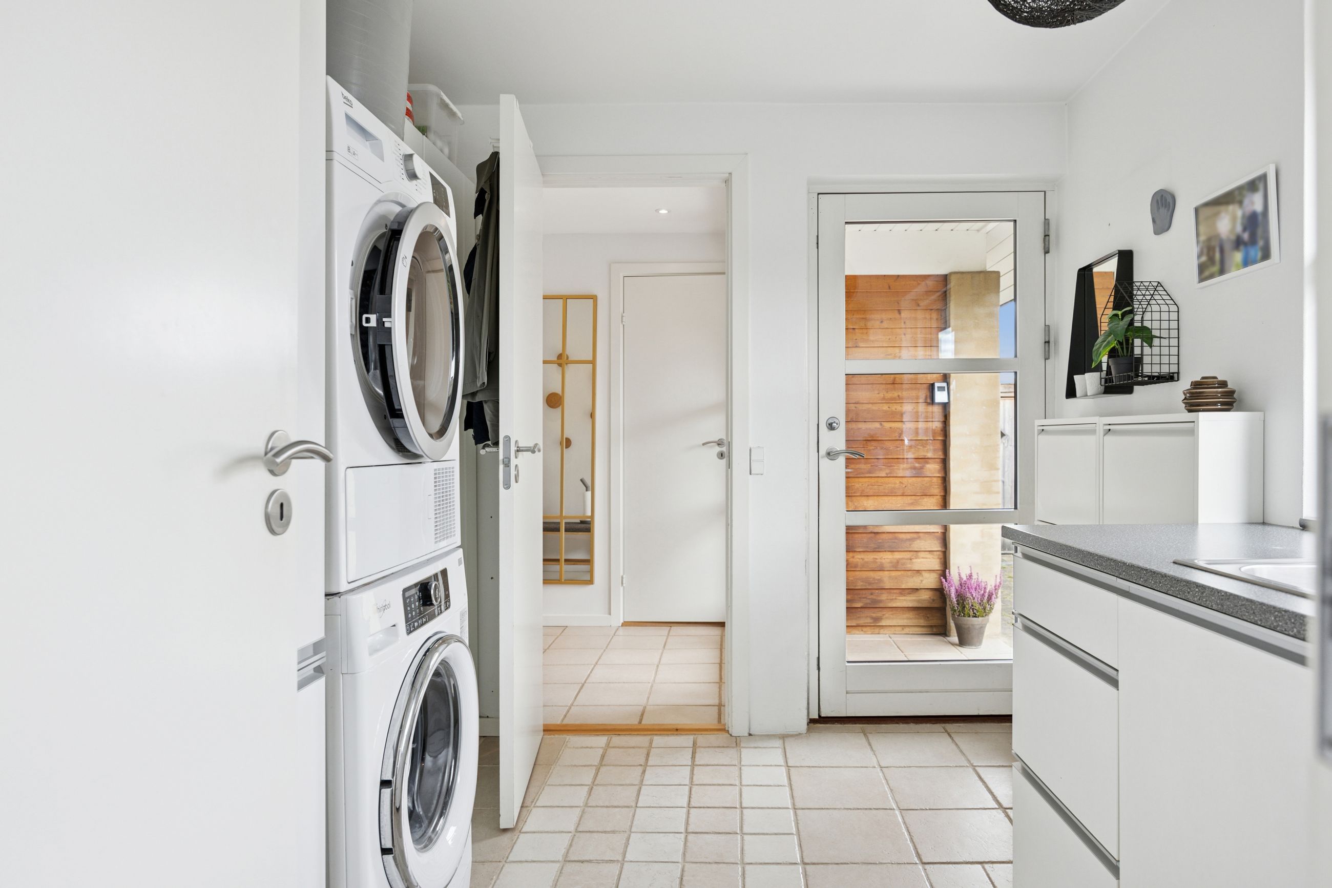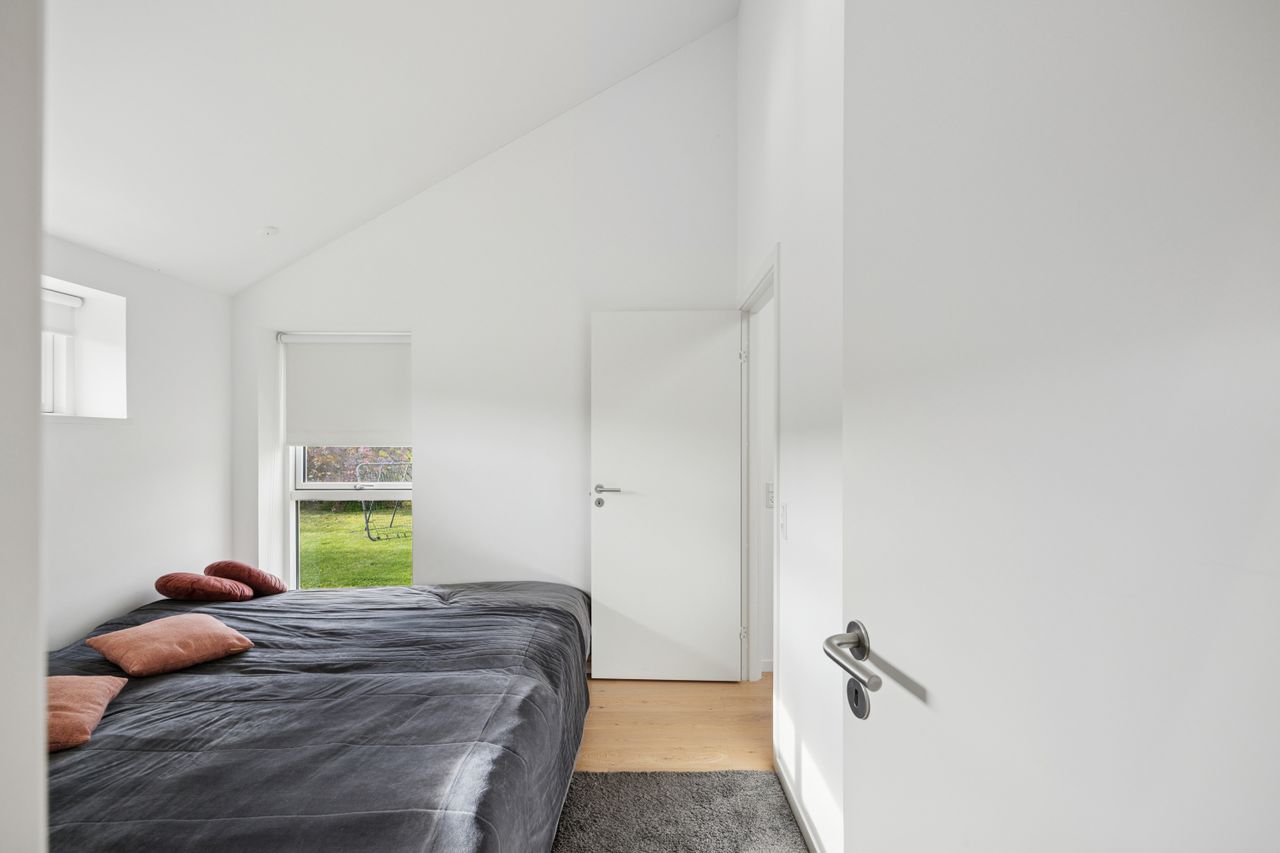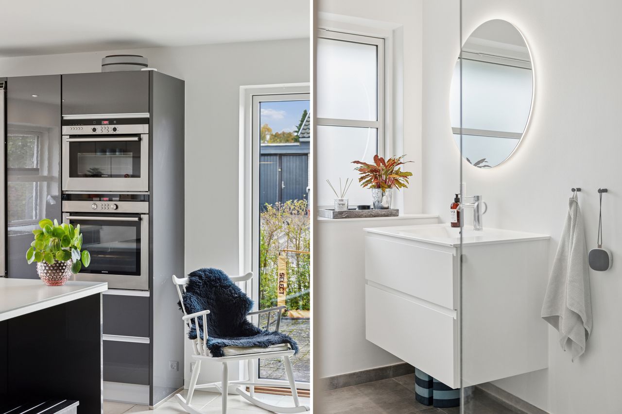 Modsat tilbygningen finder du tre gode værelser samt to nyere badeværelser udført i flotte materialer – begge udstyret med gulvvarme for maksimal velvære. Et praktisk bryggers gør hverdagen nemmere ved at give ekstra opbevaringsplads.