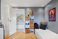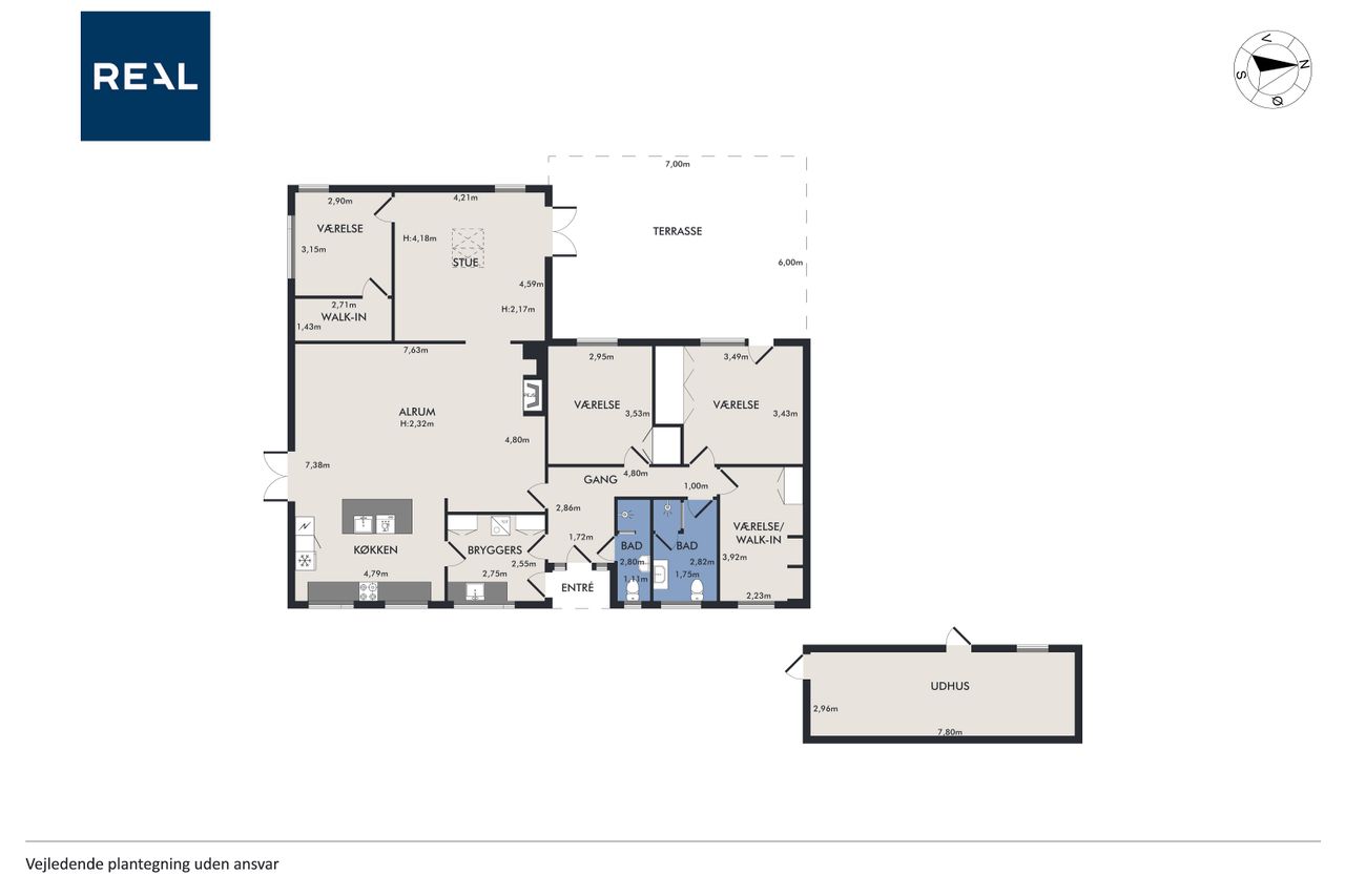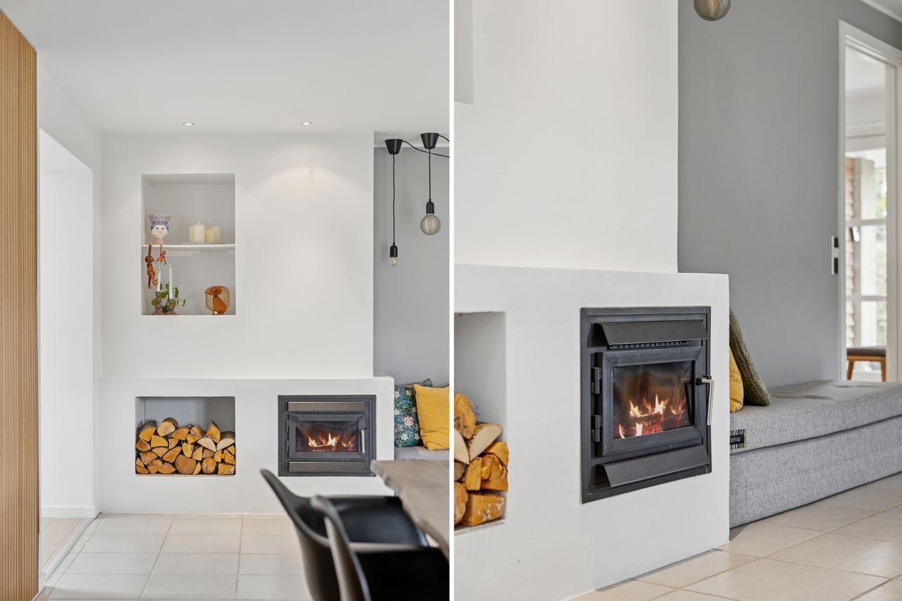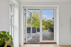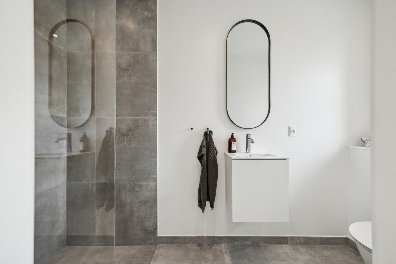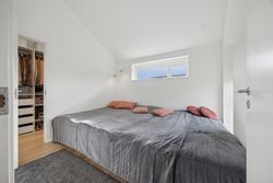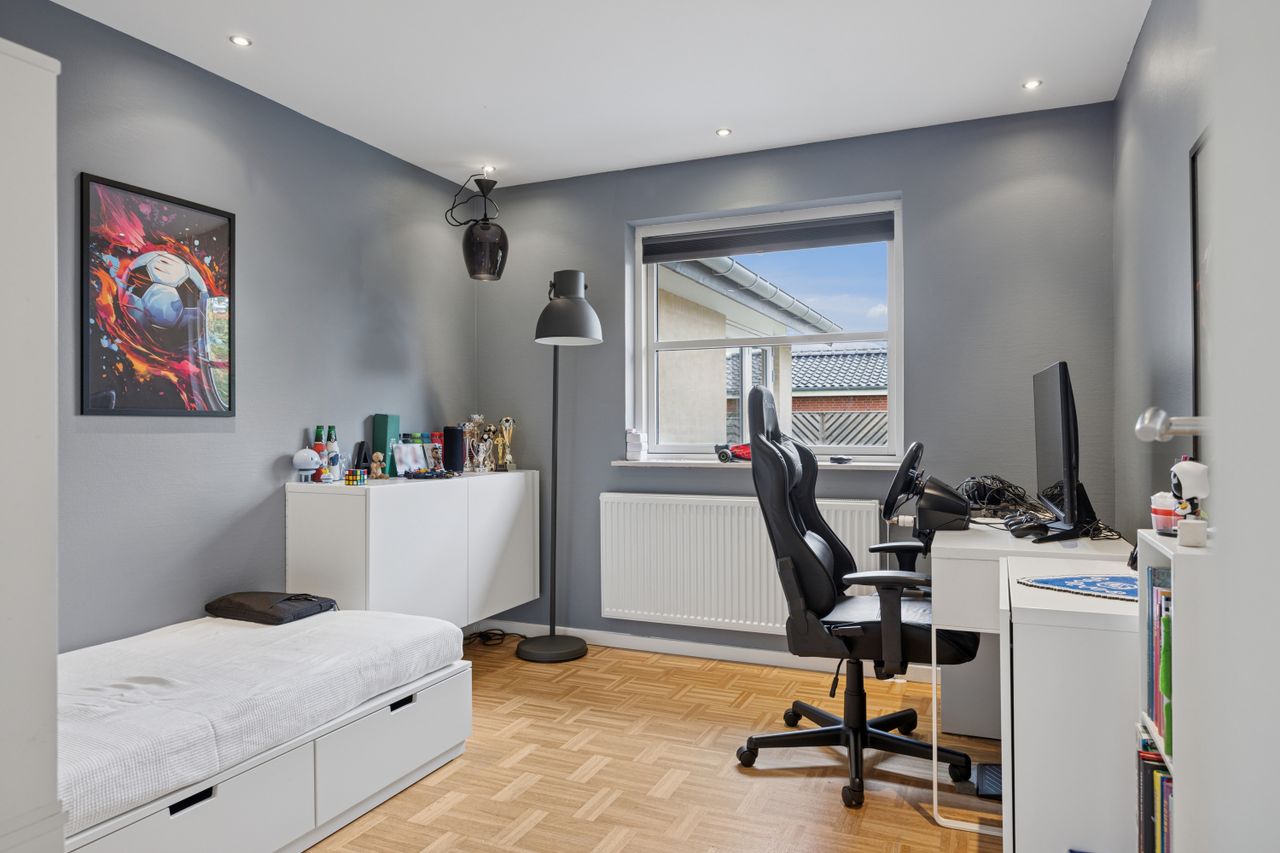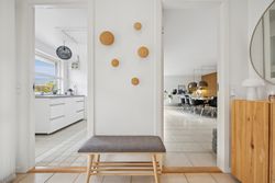Modsat tilbygningen finder du tre gode værelser samt to nyere badeværelser udført i flotte materialer – begge udstyret med gulvvarme for maksimal velvære. Et praktisk bryggers gør hverdagen nemmere ved at give ekstra opbevaringsplads.