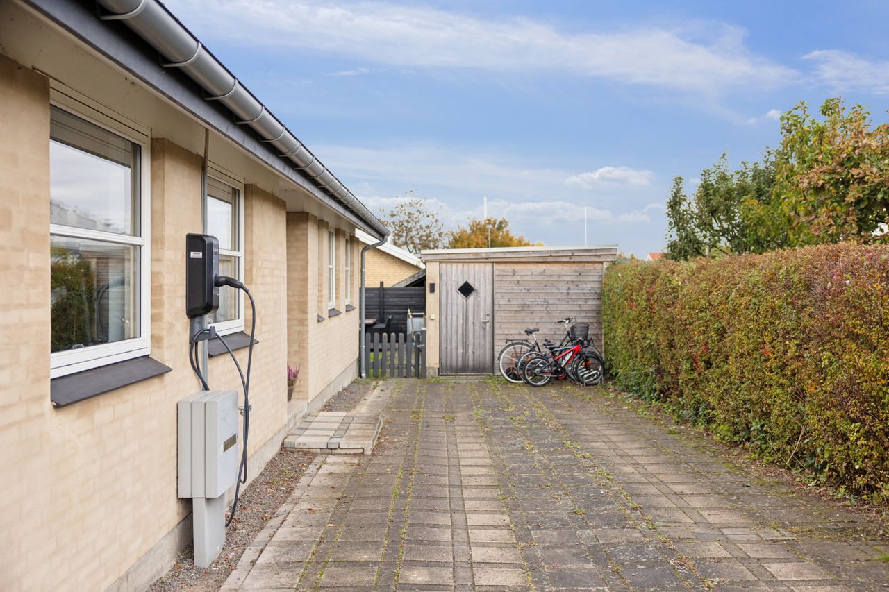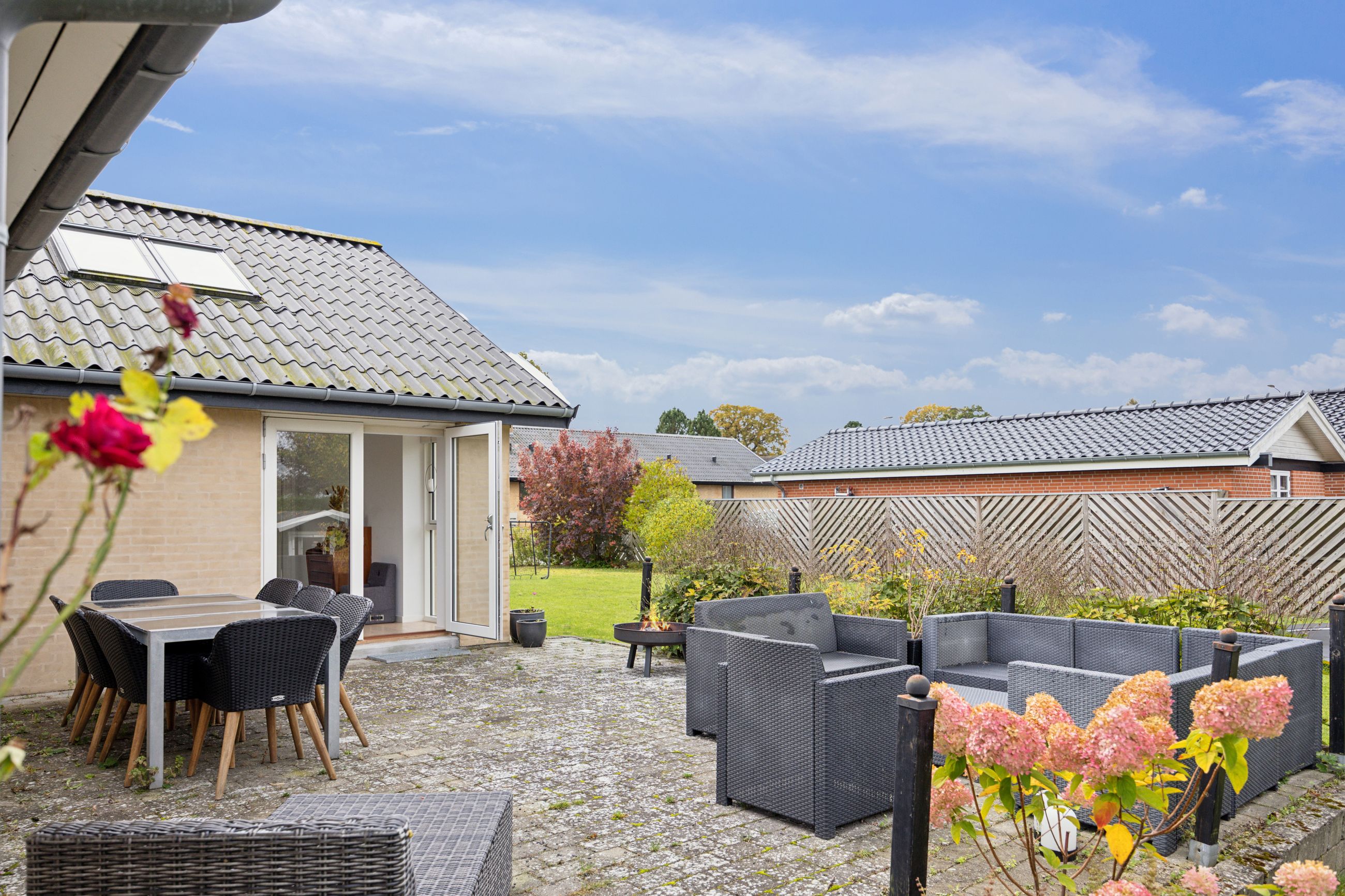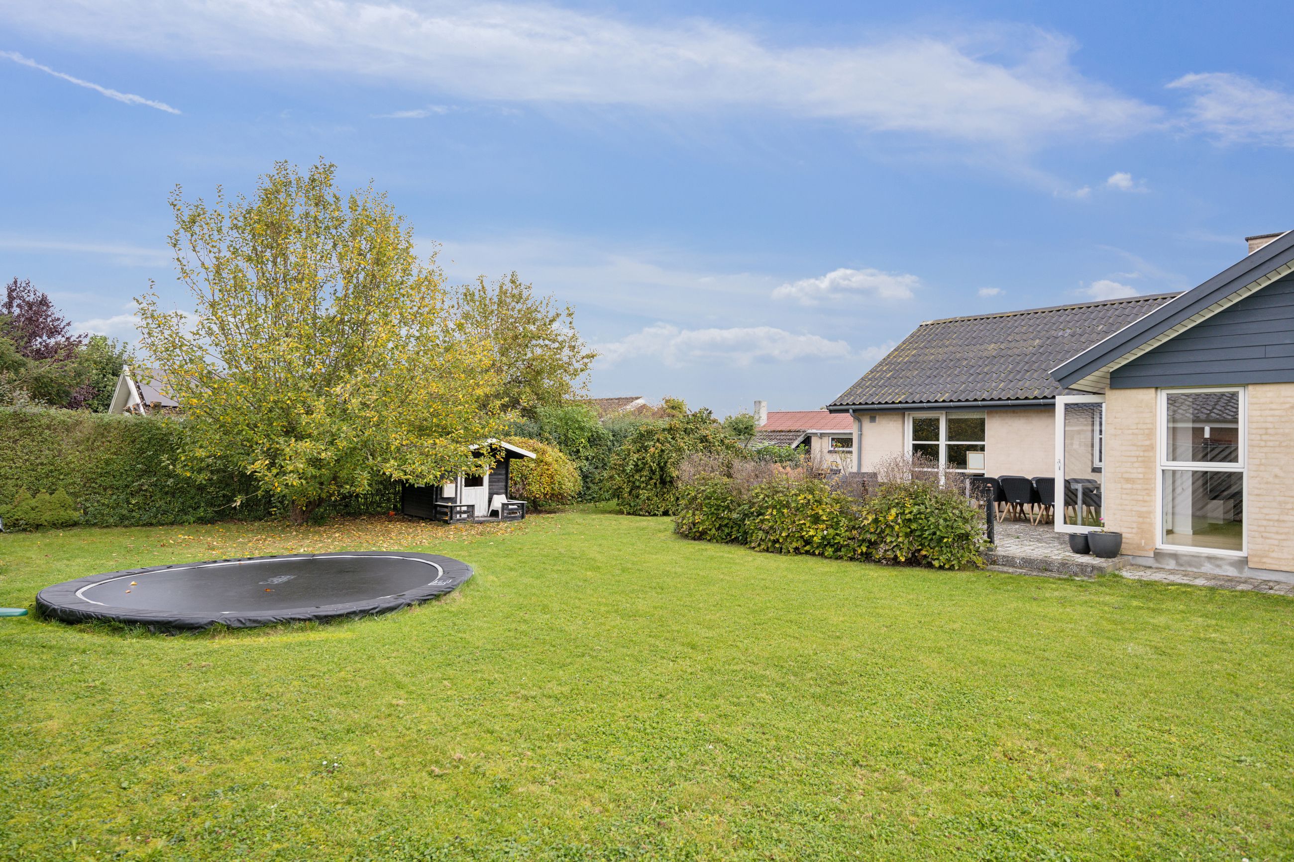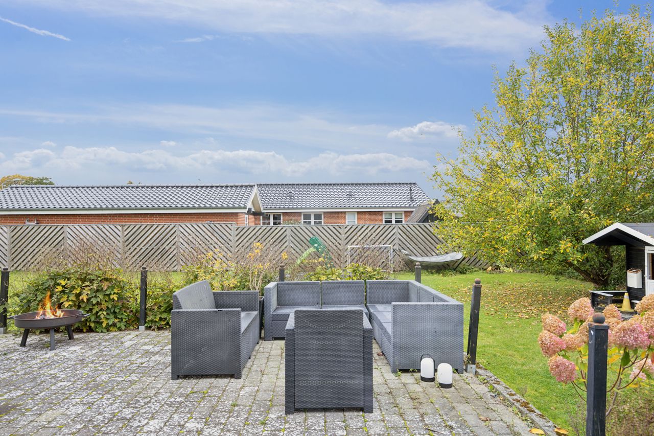 Udendørs venter en skøn sydvestvendt have, hvor solen kan nydes hele dagen lang. En dejlig terrasse strækker sig langs huset og giver rig mulighed for afslapning eller grillhygge om sommeren. Derudover er der plads til bilen i indkørslen samt et skur til opbevaring.