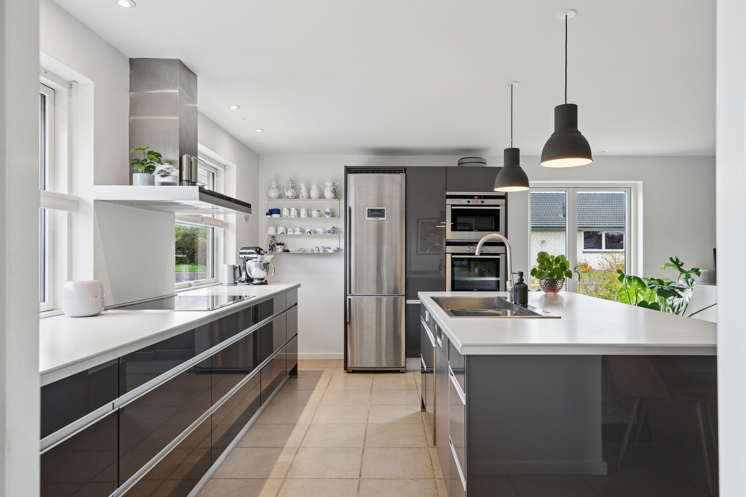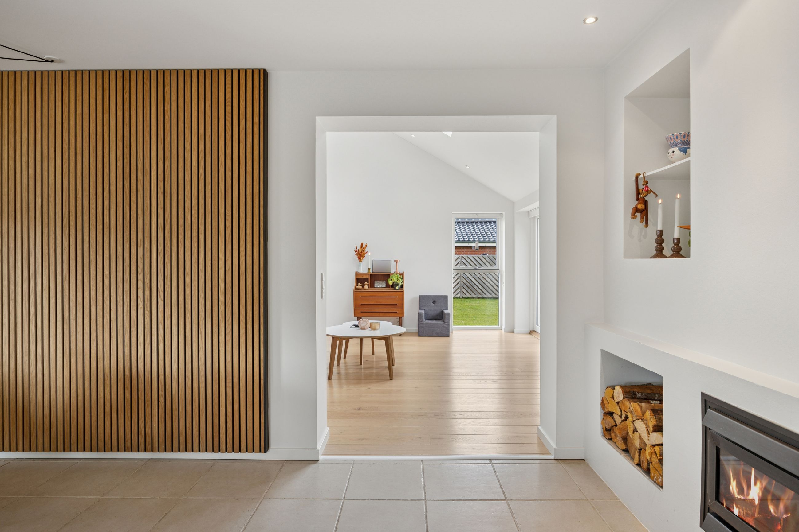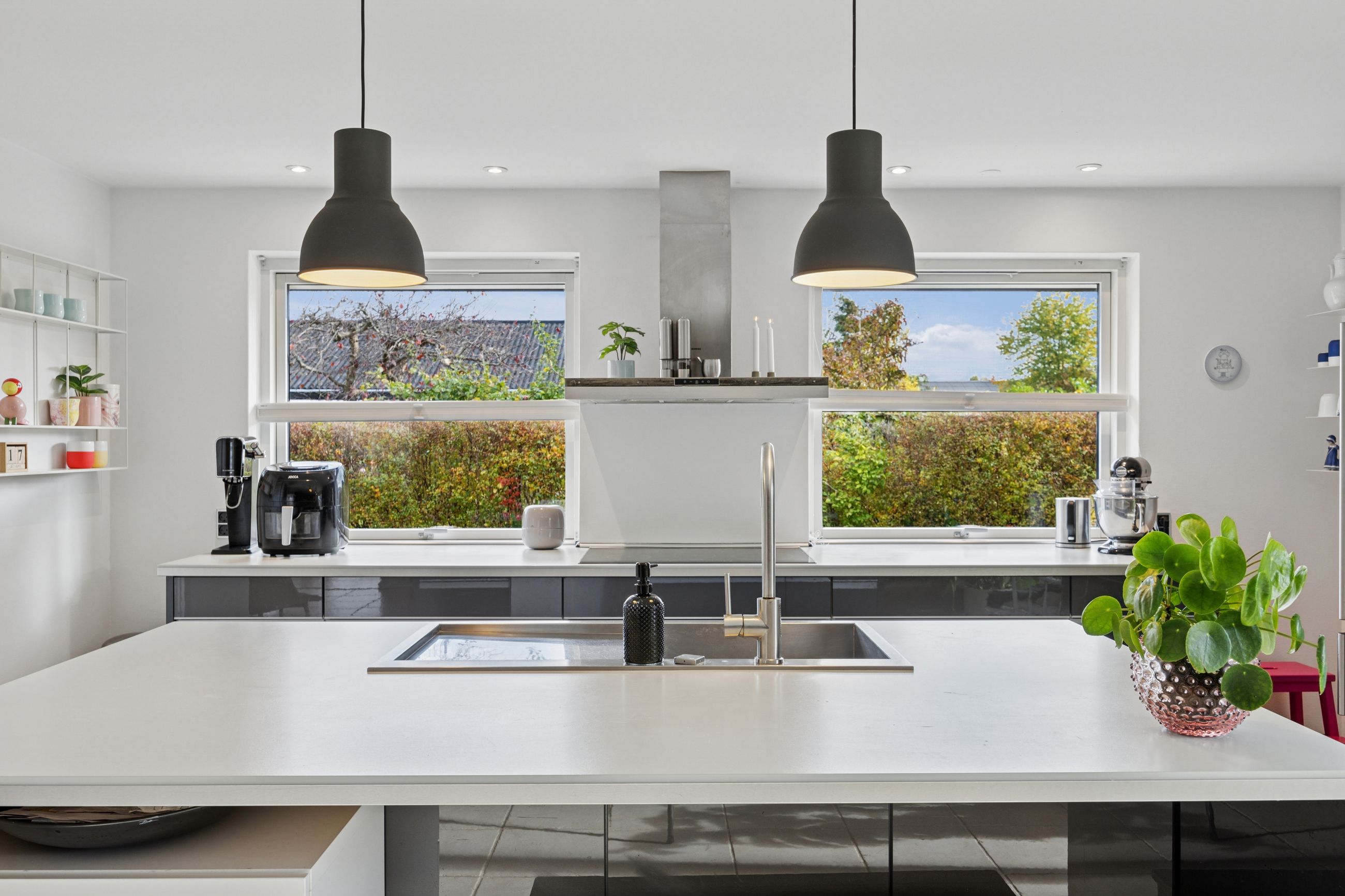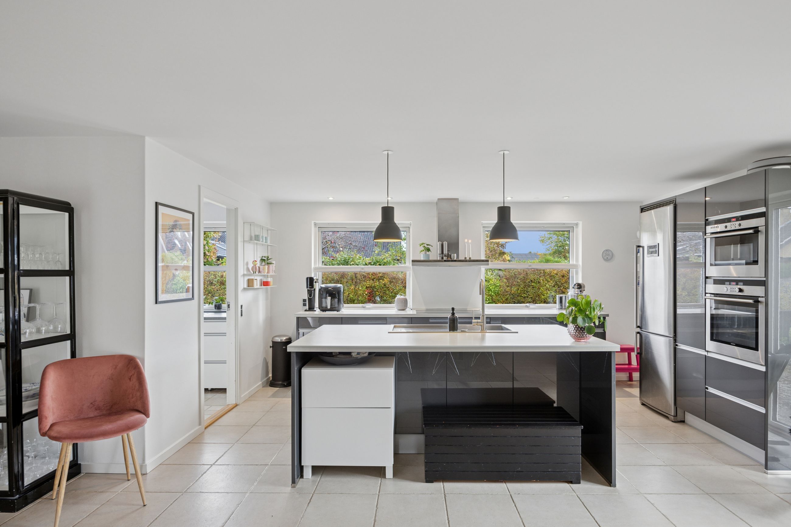 Huset blev oprindeligt bygget i 1973 og har siden gennemgået en omfattende modernisering med en stilfuld tilbygning fra 2018. Den familievenlige planløsning byder velkommen med en rummelig entré, hvor der er god plads til overtøj og sko. Herfra træder man ind i det imponerende alrum, som er husets hjerte. Det åbne køkkenområde præsenterer sig flot med masser af skabsplads og en praktisk køkkenø, der indbyder til madlavning og samvær.