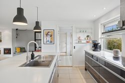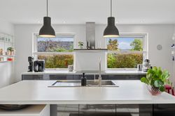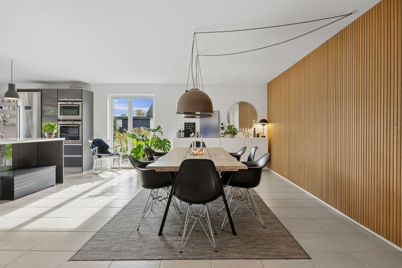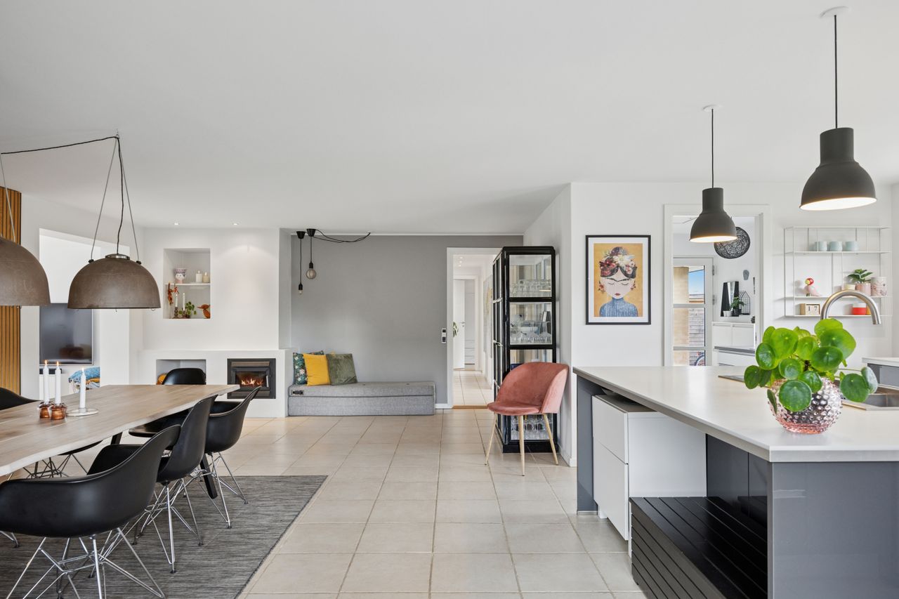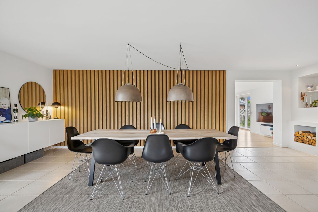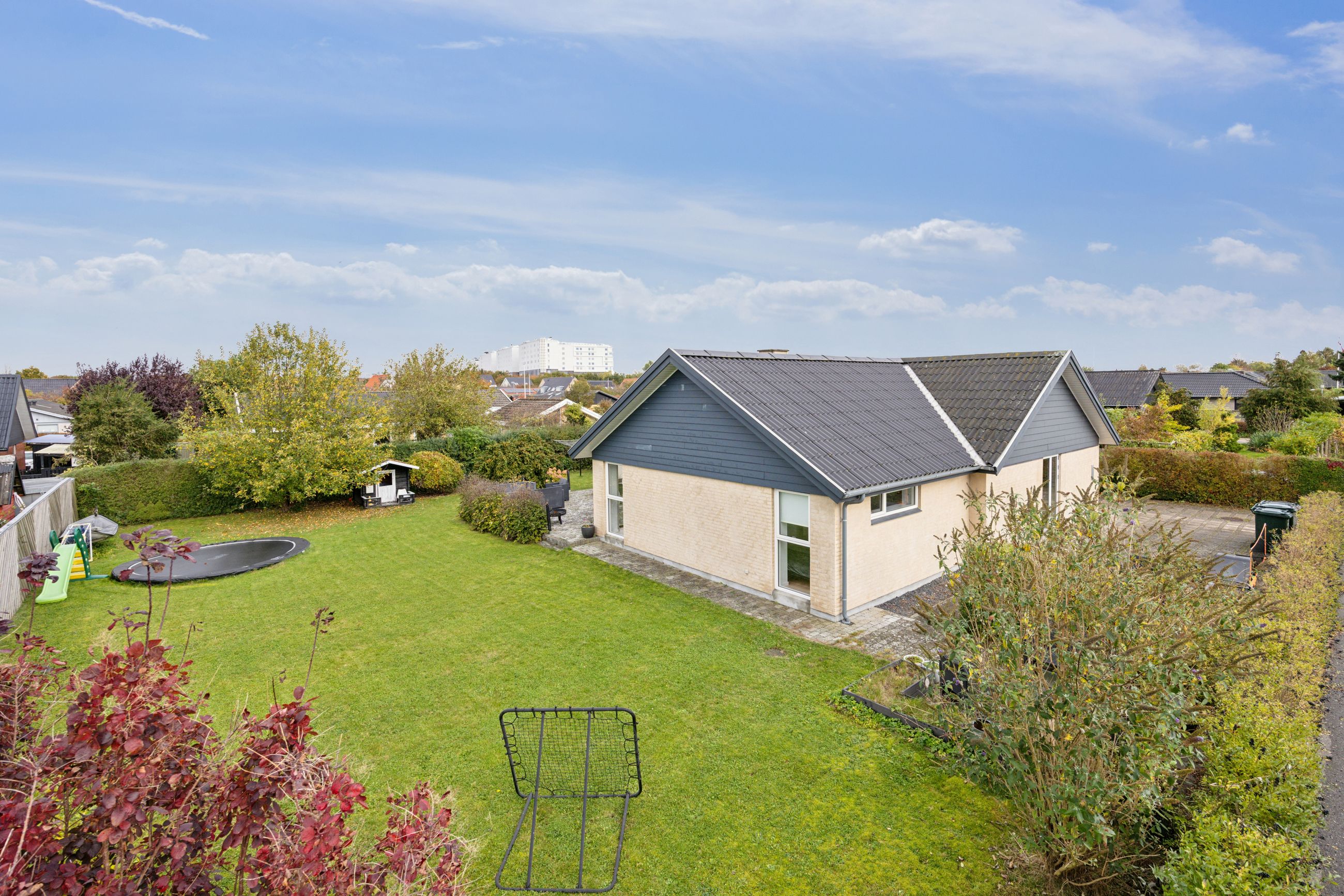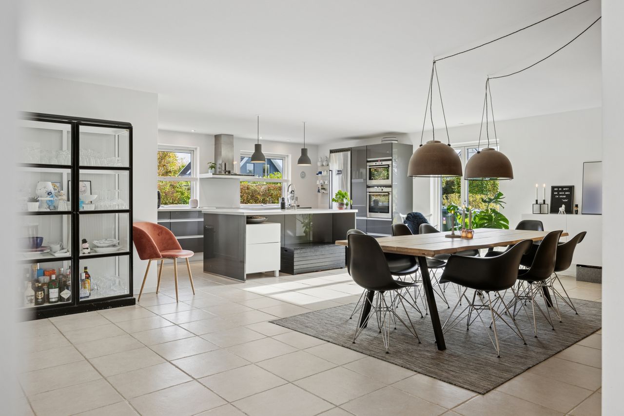 Huset blev oprindeligt bygget i 1973 og har siden gennemgået en omfattende modernisering med en stilfuld tilbygning fra 2018. Den familievenlige planløsning byder velkommen med en rummelig entré, hvor der er god plads til overtøj og sko. Herfra træder man ind i det imponerende alrum, som er husets hjerte. Det åbne køkkenområde præsenterer sig flot med masser af skabsplads og en praktisk køkkenø, der indbyder til madlavning og samvær.
