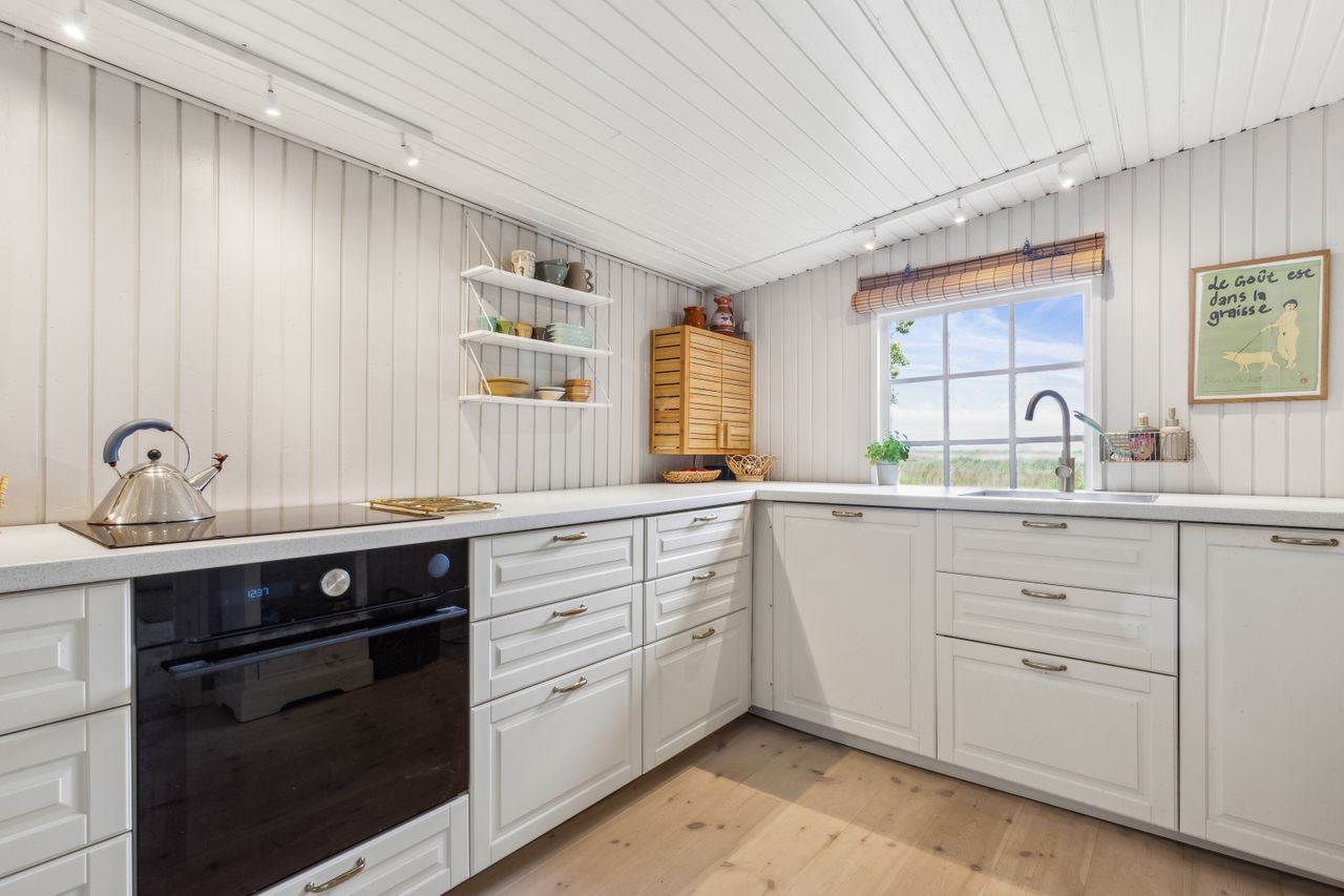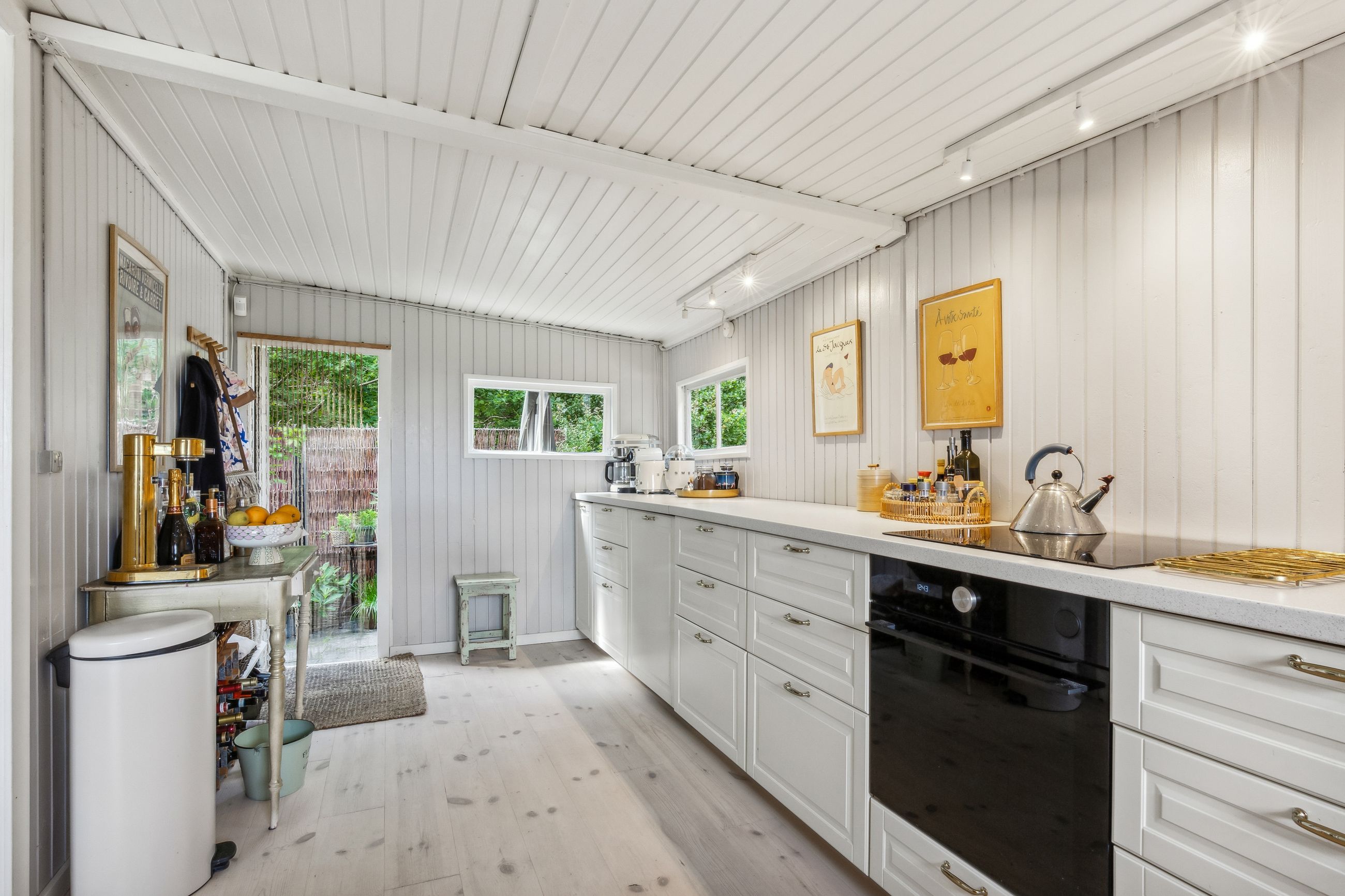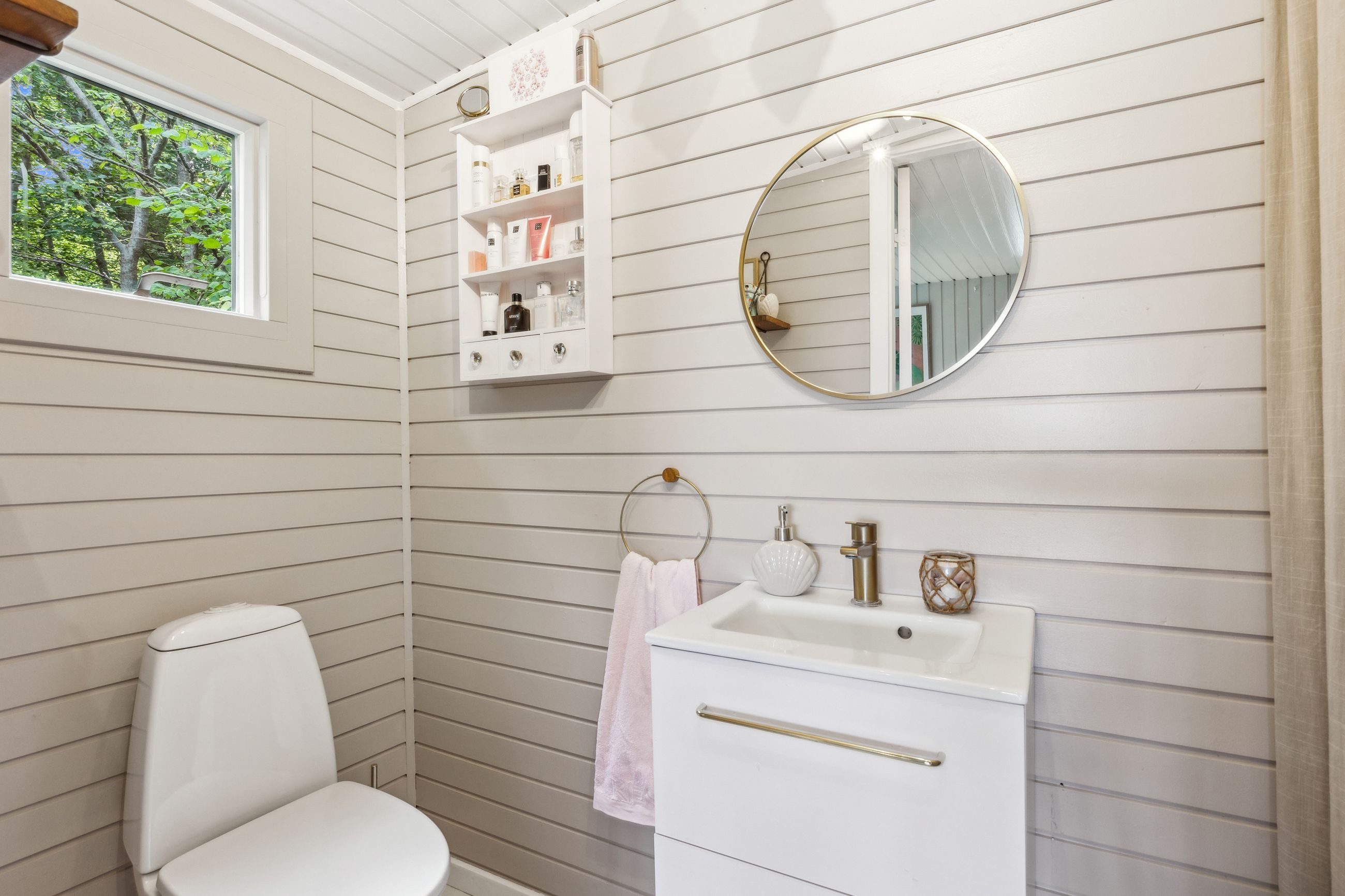 Køkkenet er blevet skiftet i 2022 inkl. nye hårde hvidevarer og fremstår moderne med alle nødvendige faciliteter for at gøre madlavningen til en leg. De lyse elementer og åbne hylder skaber en hyggelig atmosfære, hvor man har lyst til at opholde sig. Huset rummer også et badeværelse i god stand, hvilket gør det nemt at opretholde den daglige komfort.