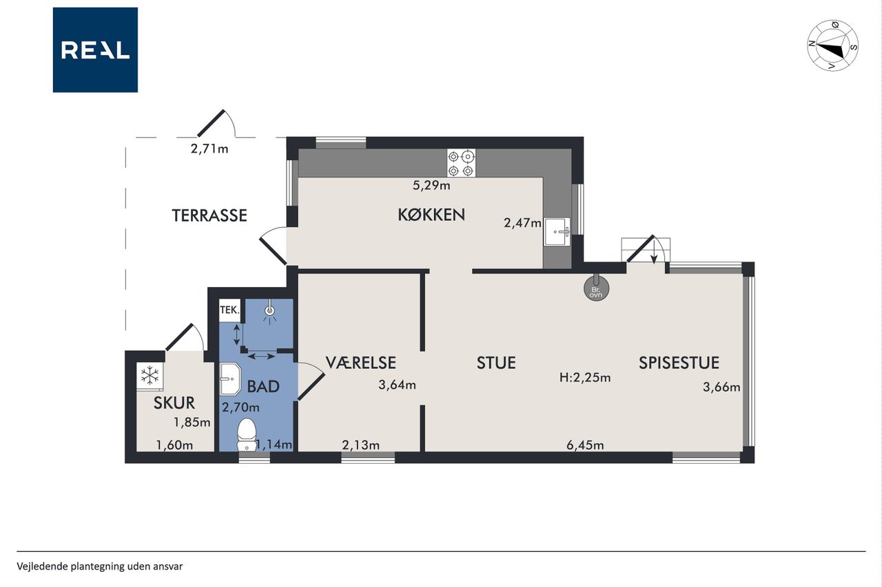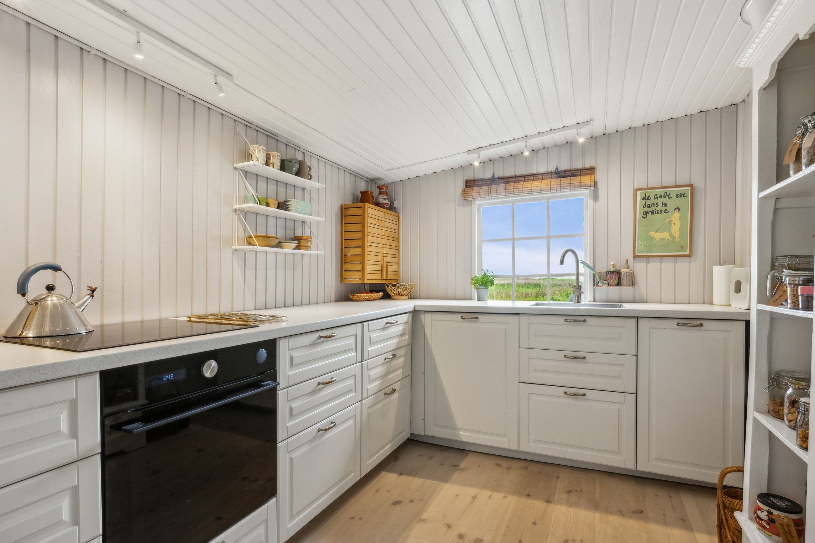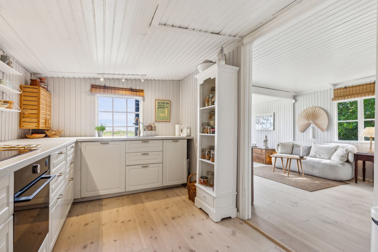 Køkkenet er blevet skiftet i 2022 inkl. nye hårde hvidevarer og fremstår moderne med alle nødvendige faciliteter for at gøre madlavningen til en leg. De lyse elementer og åbne hylder skaber en hyggelig atmosfære, hvor man har lyst til at opholde sig. Huset rummer også et badeværelse i god stand, hvilket gør det nemt at opretholde den daglige komfort.