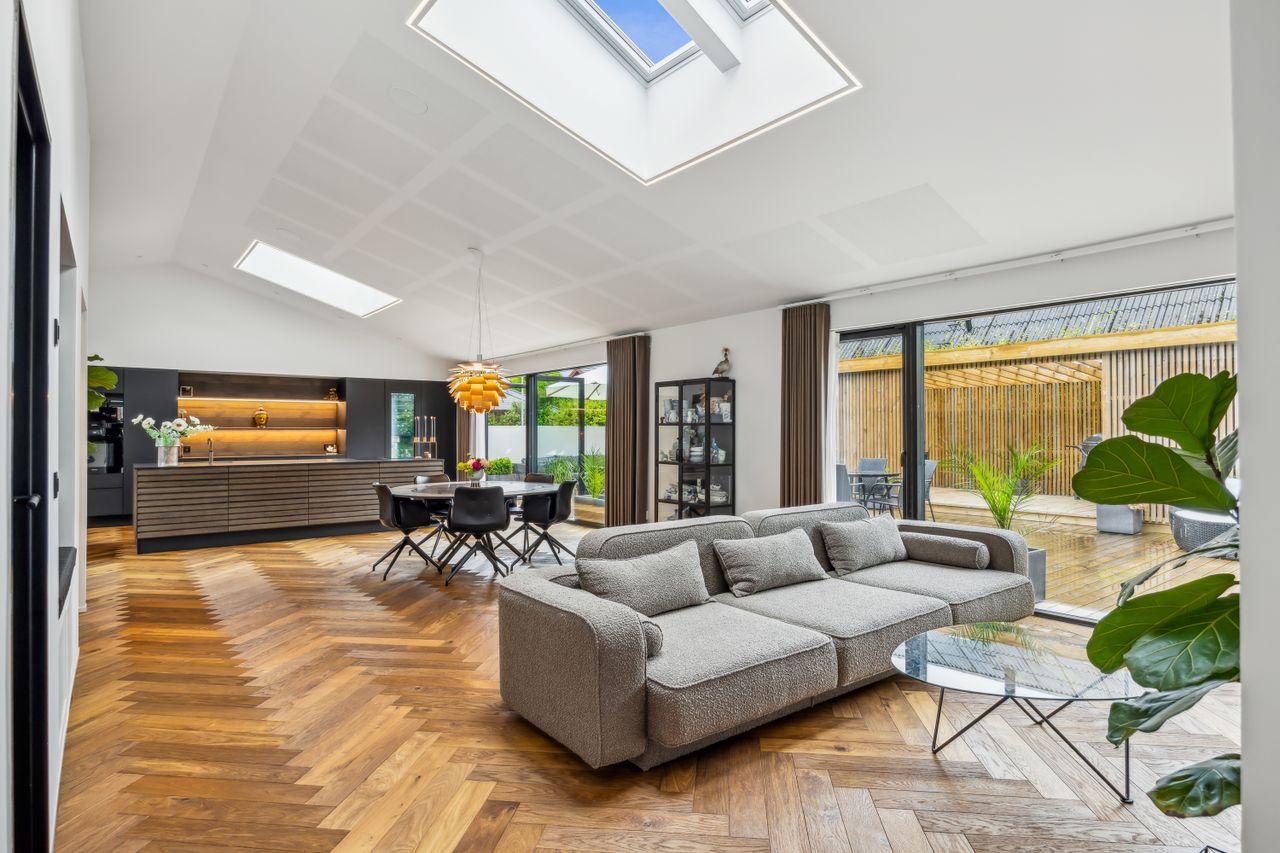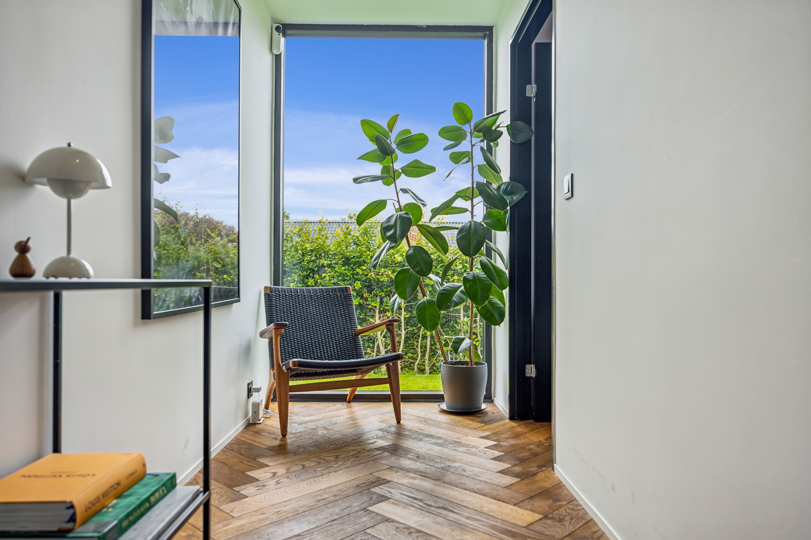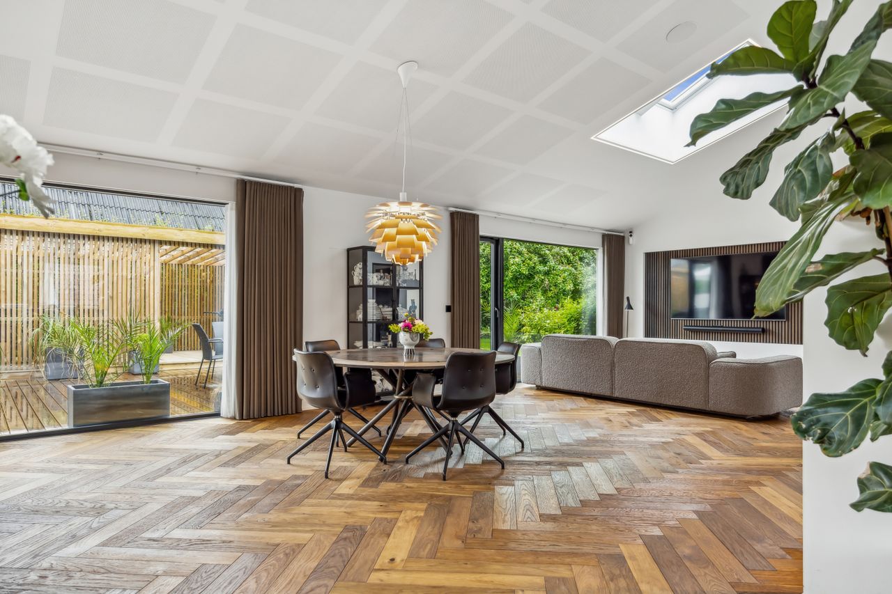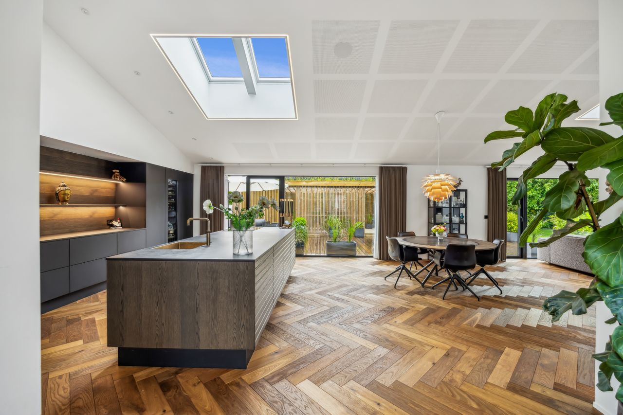Indenfor mødes du af smukke, massive hårdtbørstede sildebensgulve i specialmål med behagelig gulvvarme overalt. Køkkenalrummet imponerer med loft til kip, indbygget Sonos i loftet, stor køkkenø med masser af plads og dobbelte Velux-vinduer over sofa, seng og badekar, hvorfra man kan nyde den smukke himmel. Hårdehvidevarerne er topmodeller fra Miele – alt med touch – herunder ovn med kamera og trådløst stegetermometer, vin-køleskab med sommelier-sæt, fryser med isterningefunktion, kaffemaskine der med ét tryk laver din yndlings cafékaffe og Quooker med brus.