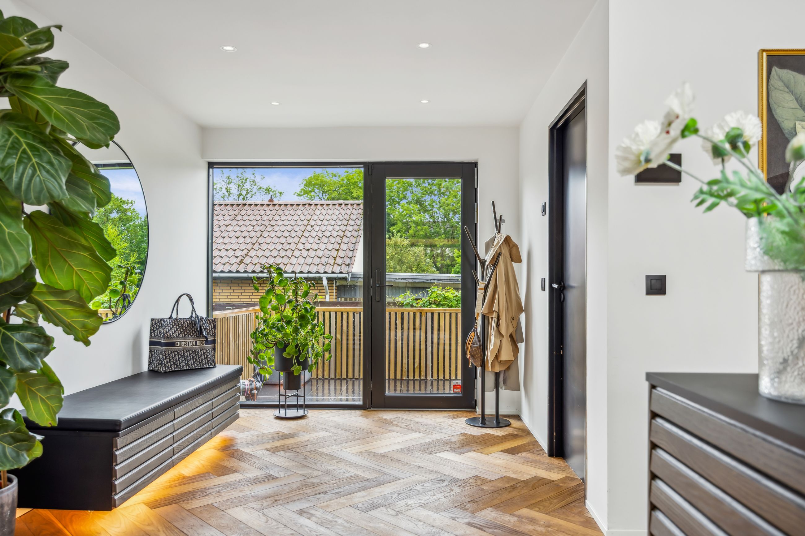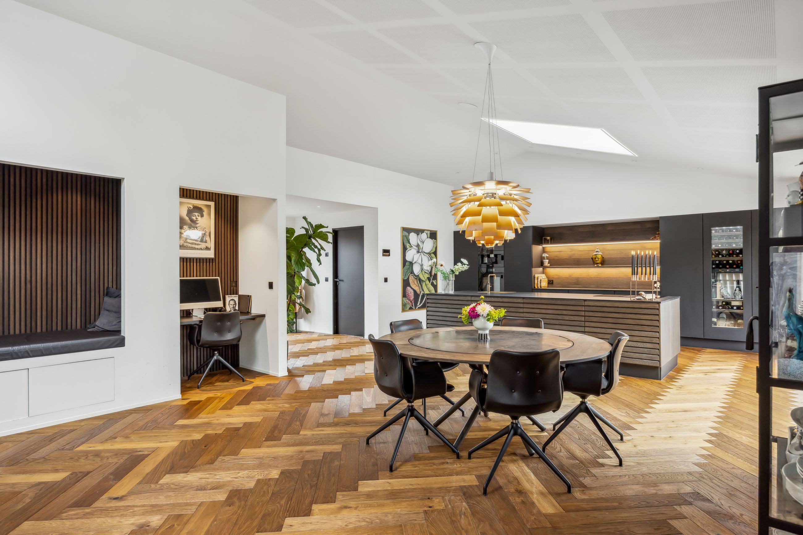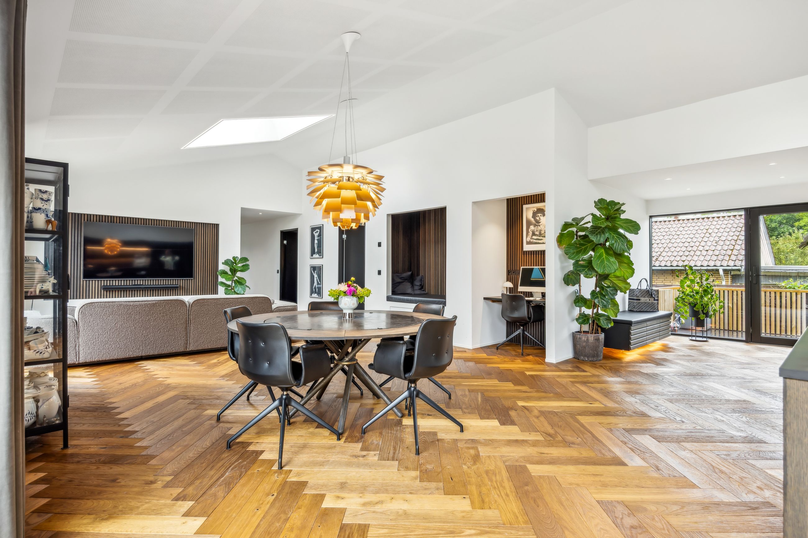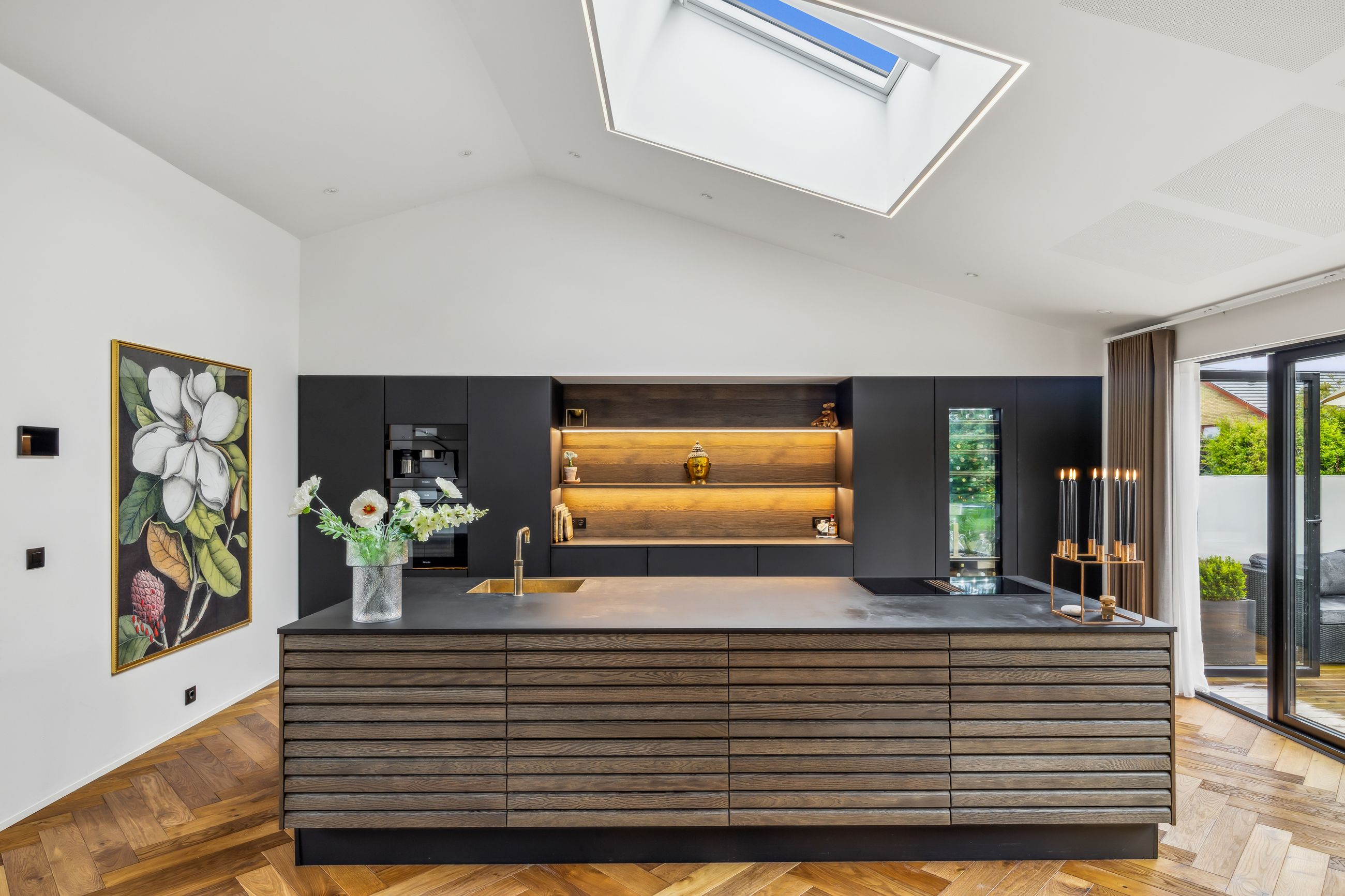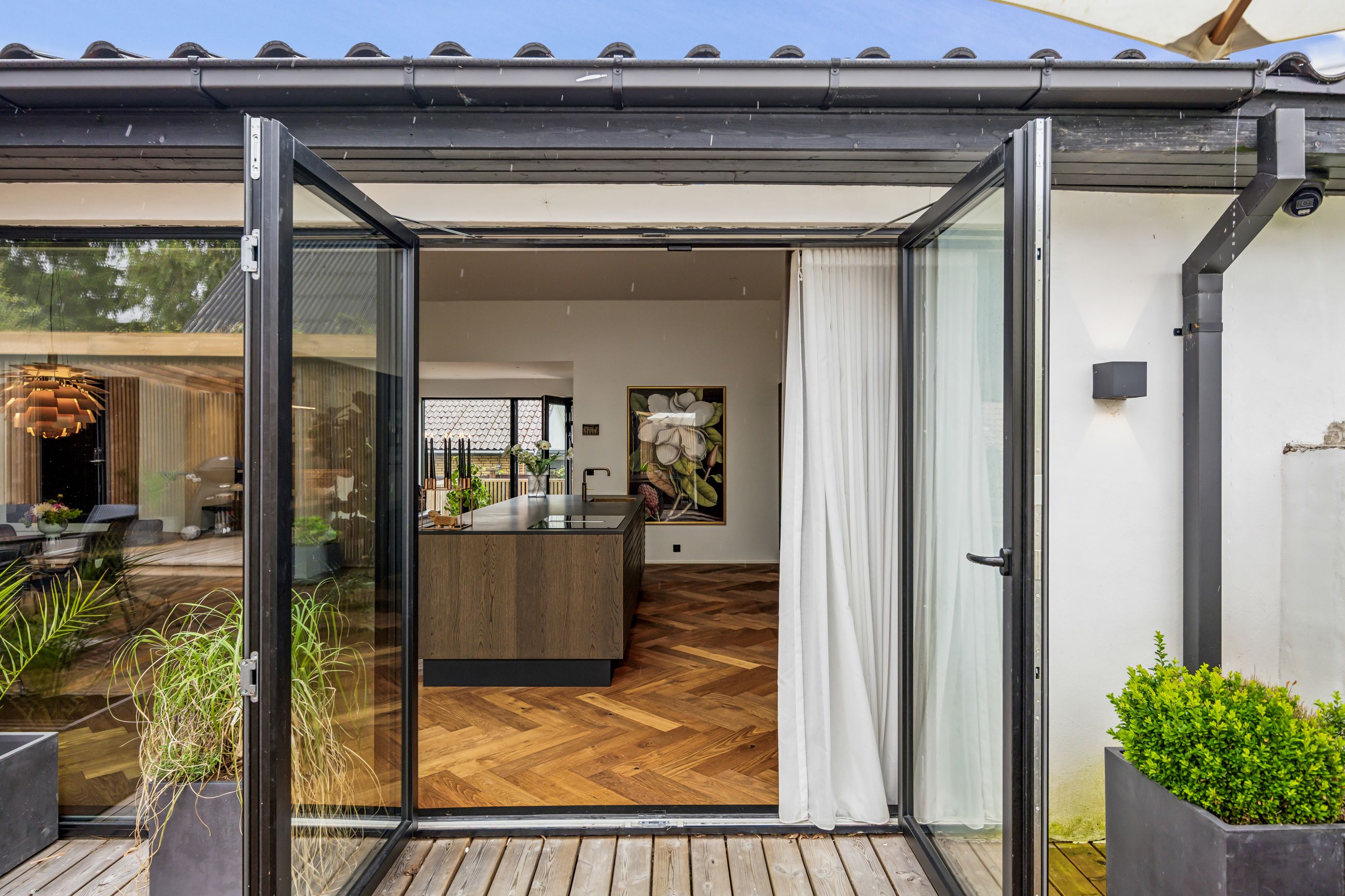 Indenfor mødes du af smukke, massive hårdtbørstede sildebensgulve i specialmål med behagelig gulvvarme overalt. Køkkenalrummet imponerer med loft til kip, indbygget Sonos i loftet, stor køkkenø med masser af plads og dobbelte Velux-vinduer over sofa, seng og badekar, hvorfra man kan nyde den smukke himmel. Hårdehvidevarerne er topmodeller fra Miele – alt med touch – herunder ovn med kamera og trådløst stegetermometer, vin-køleskab med sommelier-sæt, fryser med isterningefunktion, kaffemaskine der med ét tryk laver din yndlings cafékaffe og Quooker med brus.