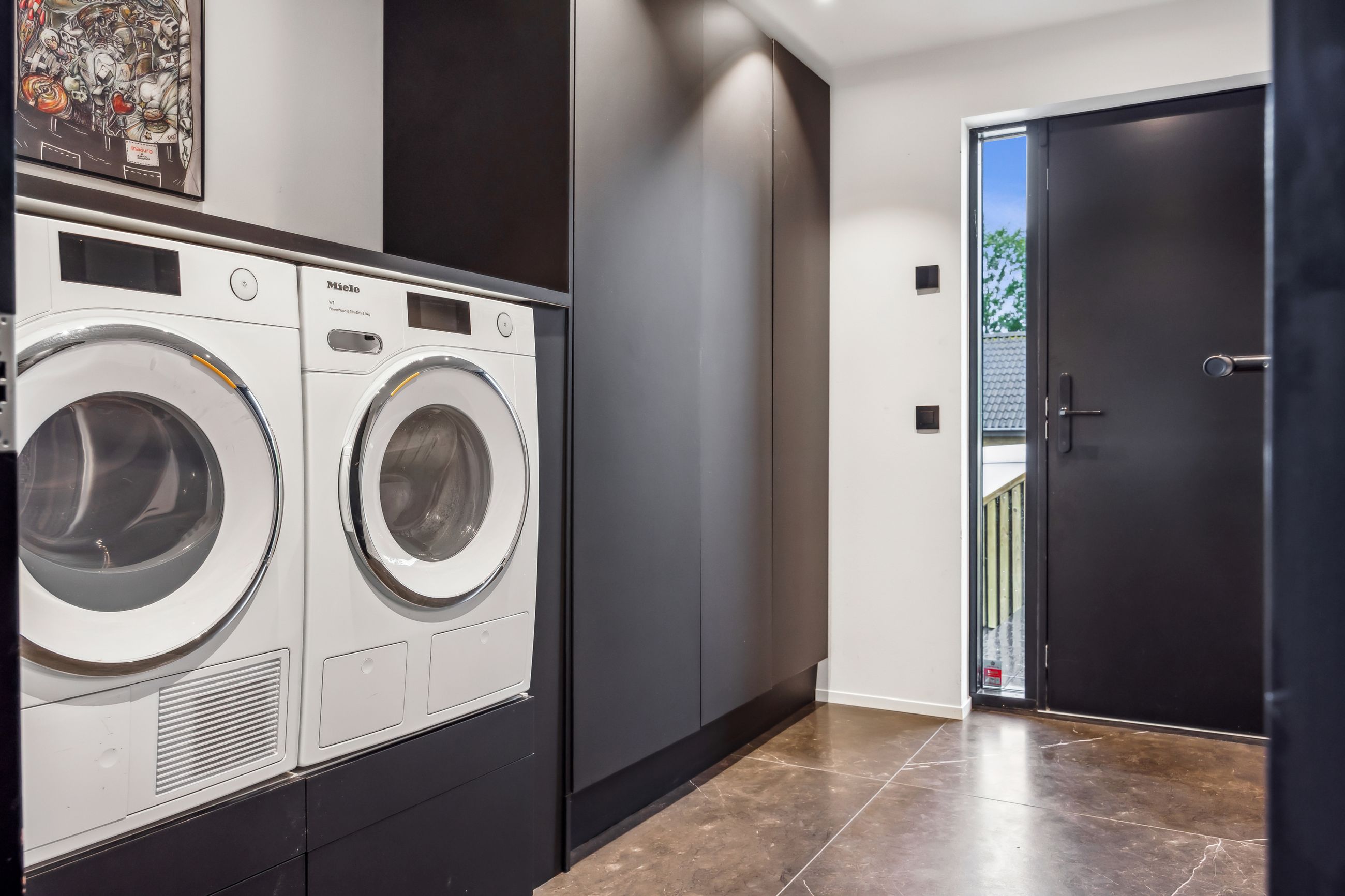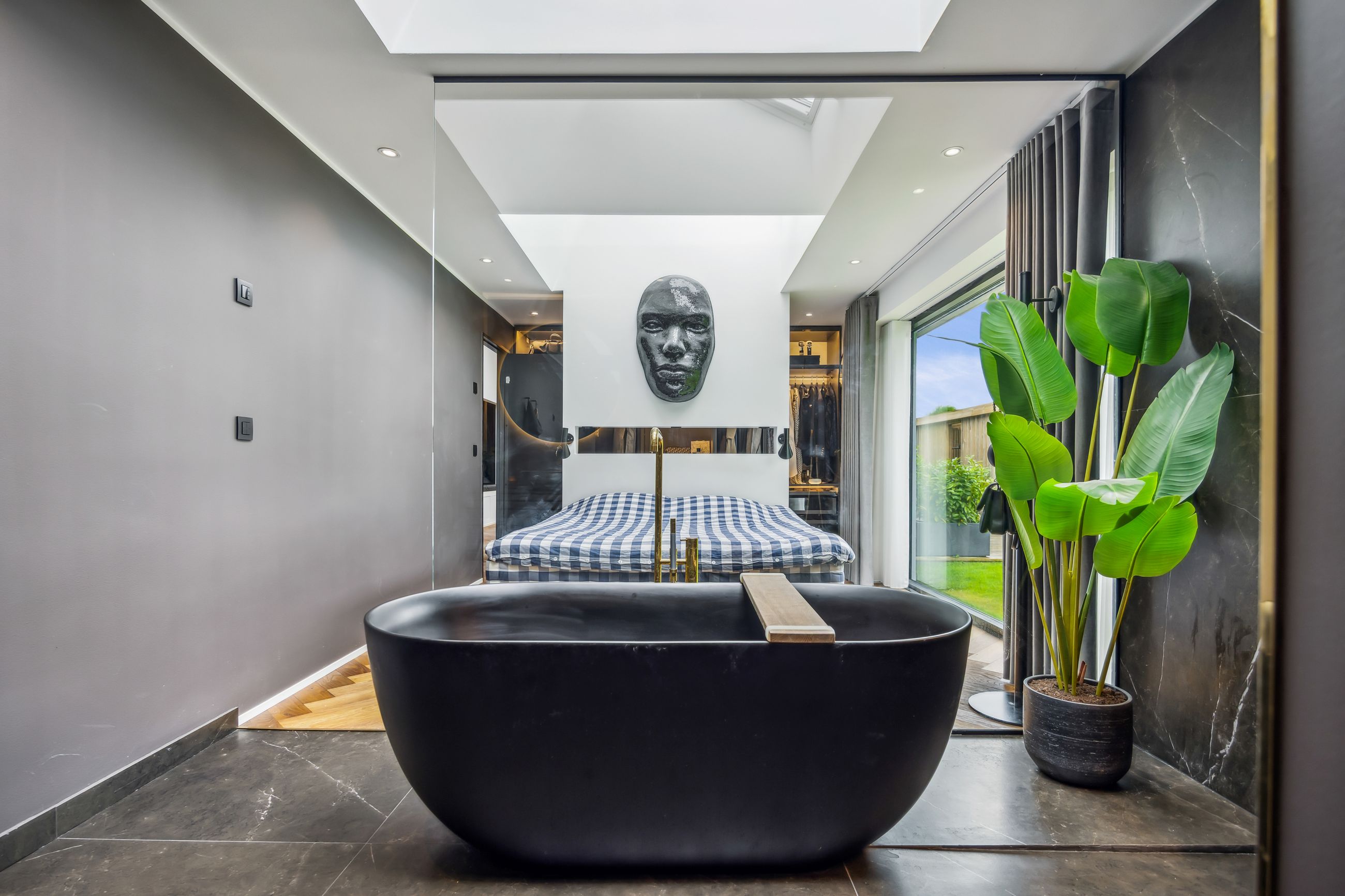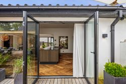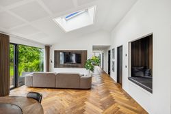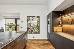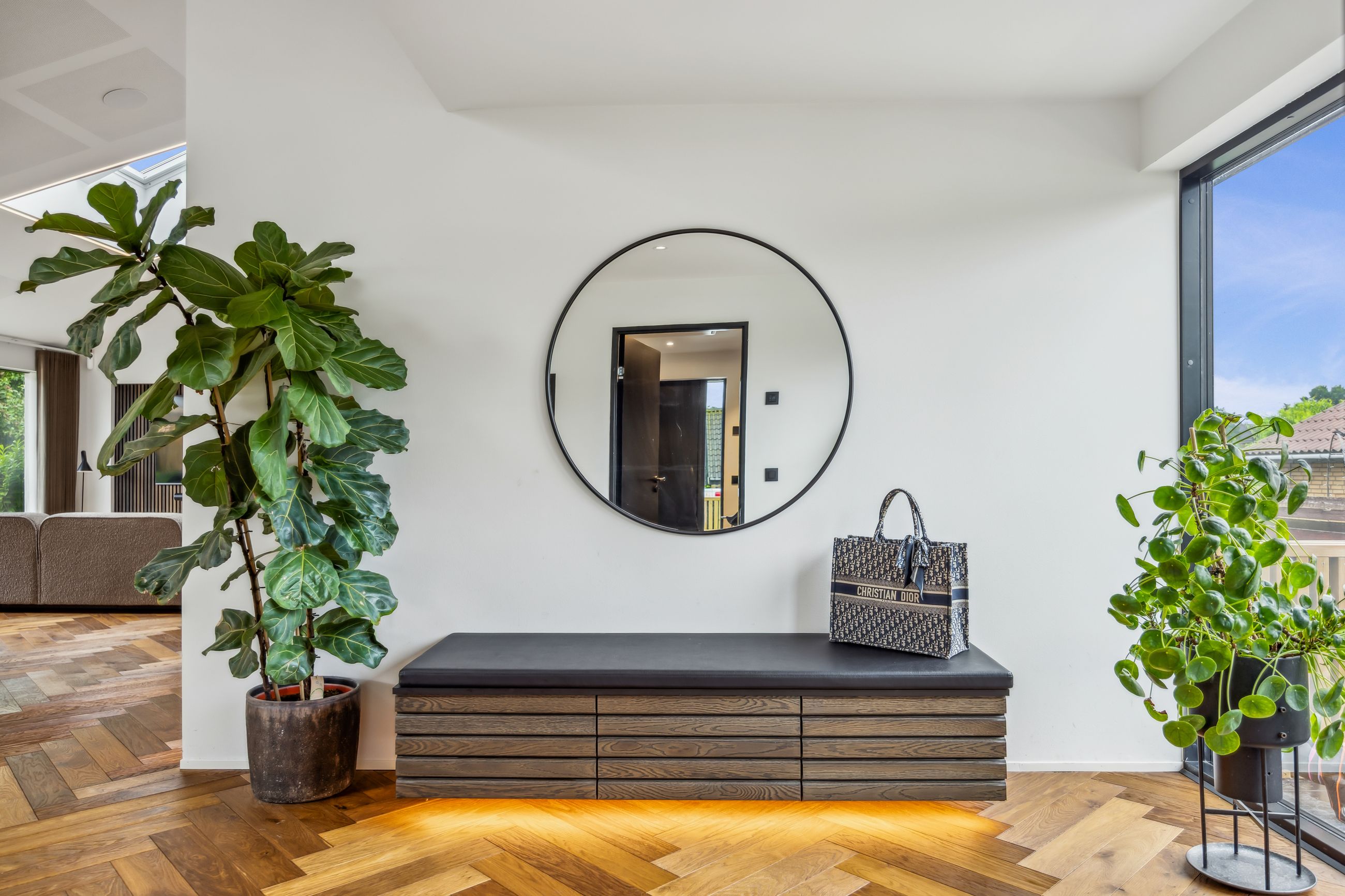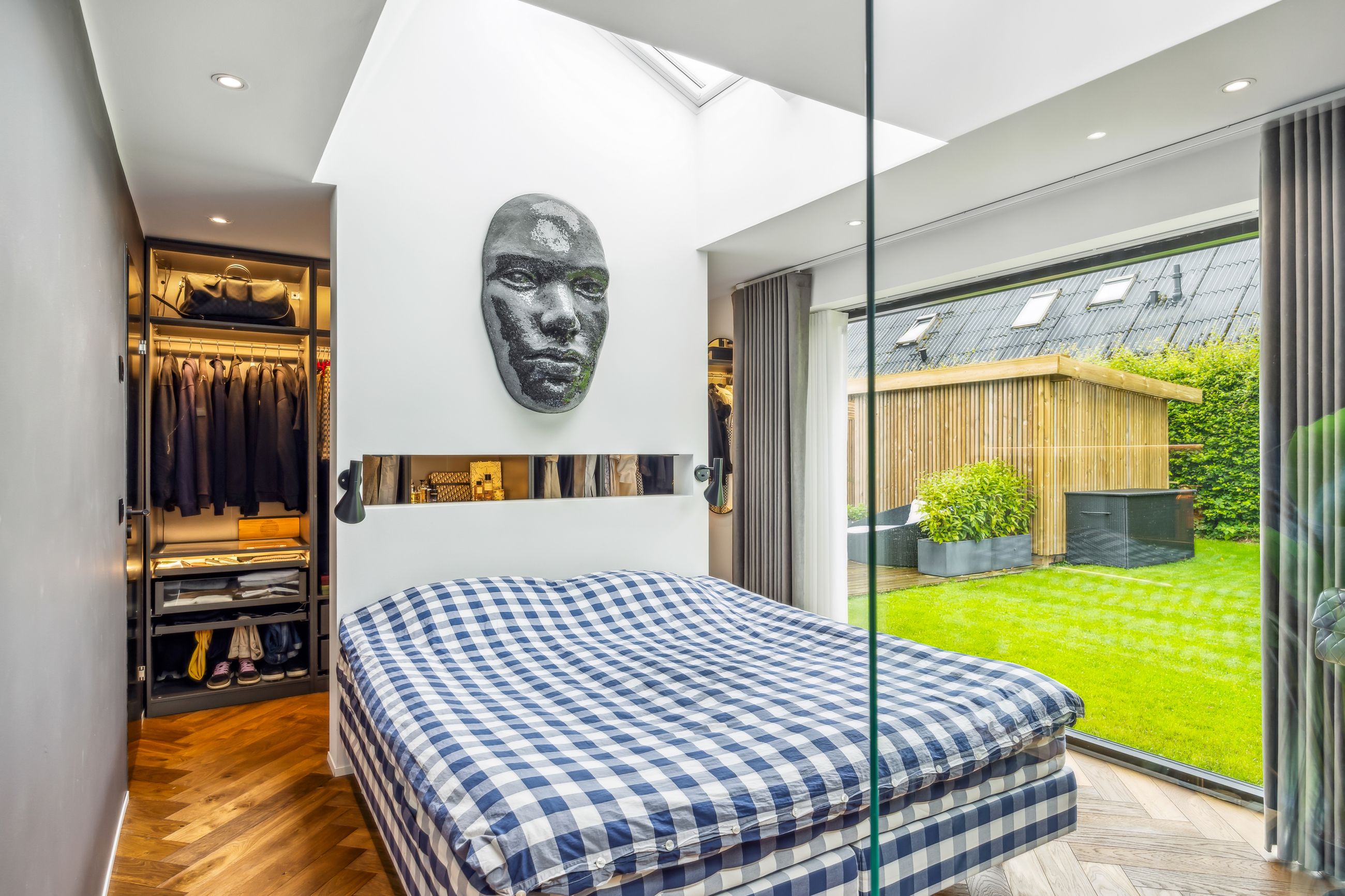 Indenfor mødes du af smukke, massive hårdtbørstede sildebensgulve i specialmål med behagelig gulvvarme overalt. Køkkenalrummet imponerer med loft til kip, indbygget Sonos i loftet, stor køkkenø med masser af plads og dobbelte Velux-vinduer over sofa, seng og badekar, hvorfra man kan nyde den smukke himmel. Hårdehvidevarerne er topmodeller fra Miele – alt med touch – herunder ovn med kamera og trådløst stegetermometer, vin-køleskab med sommelier-sæt, fryser med isterningefunktion, kaffemaskine der med ét tryk laver din yndlings cafékaffe og Quooker med brus.