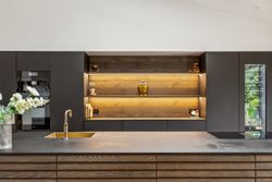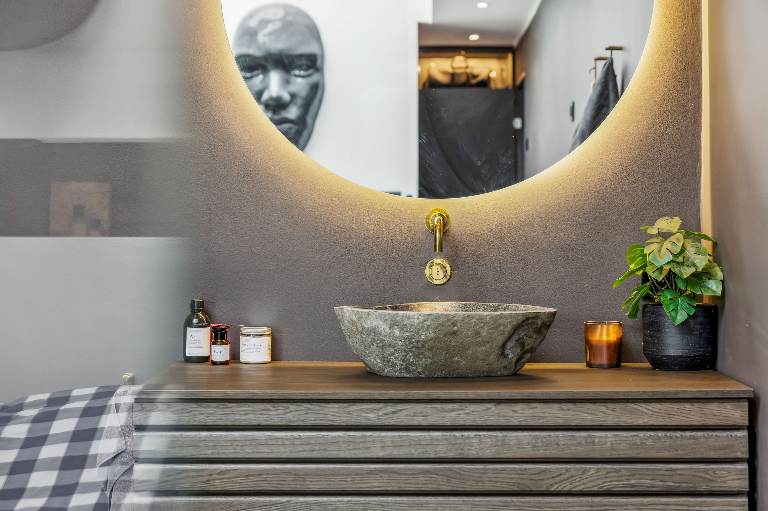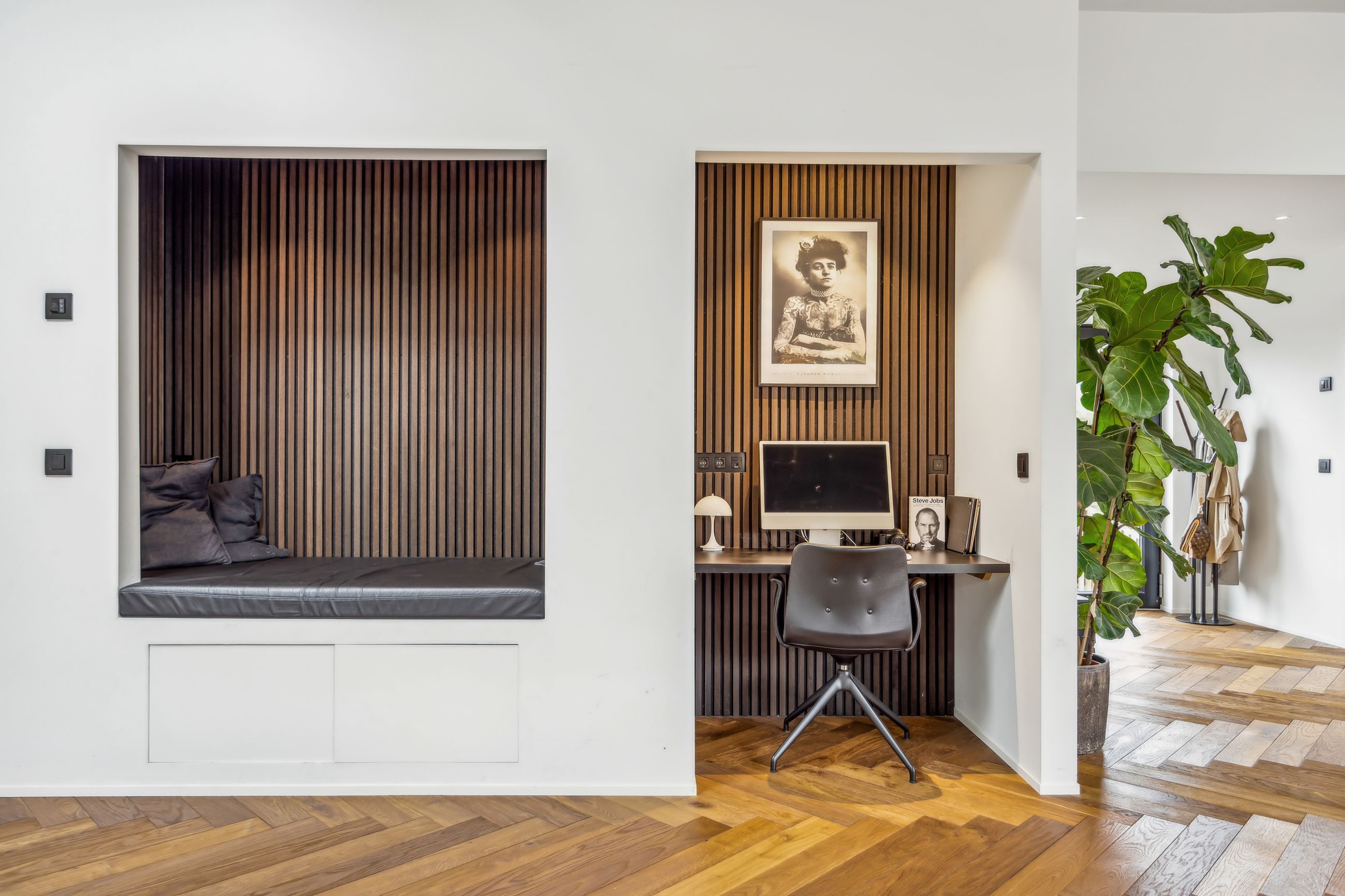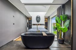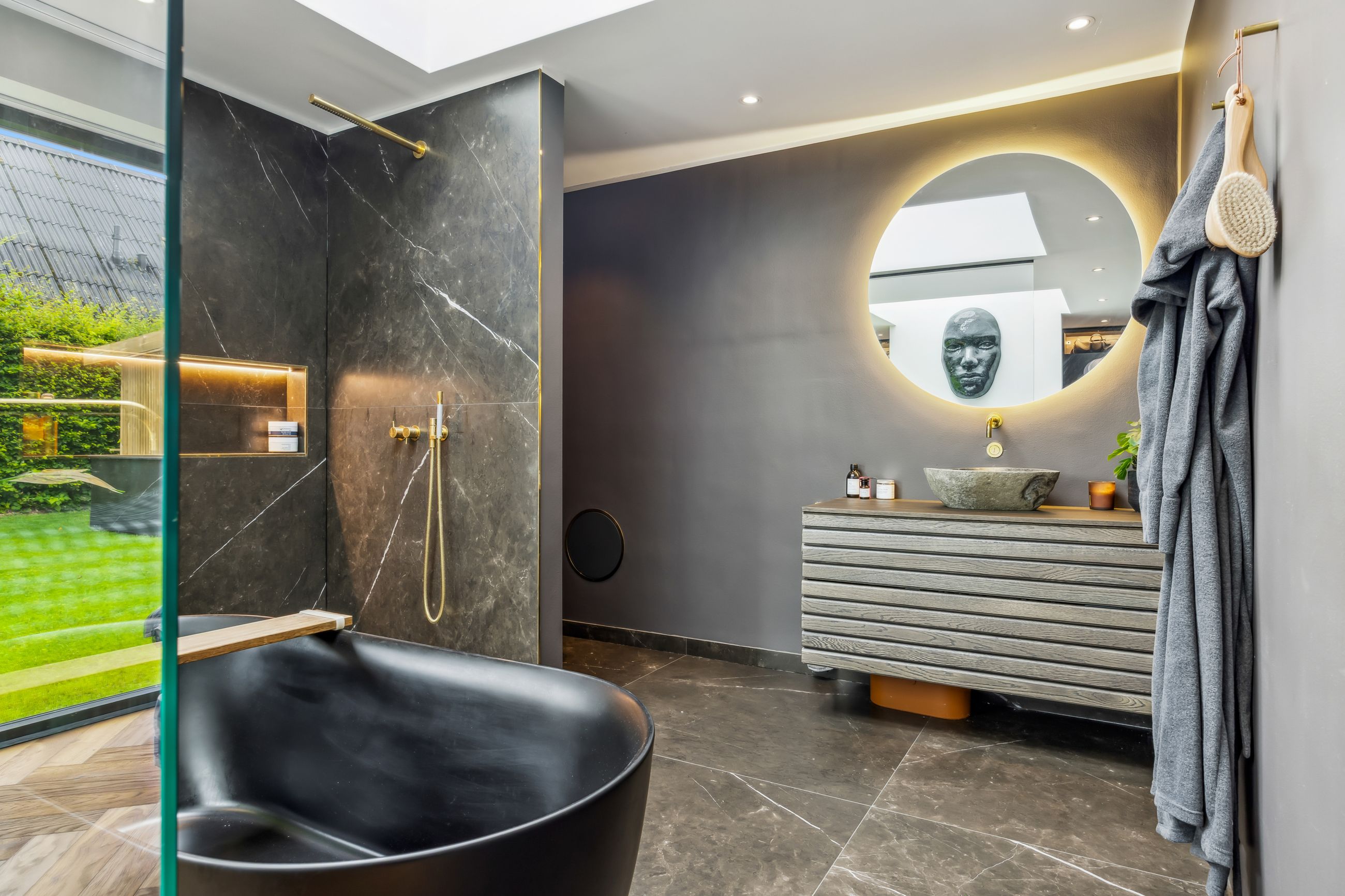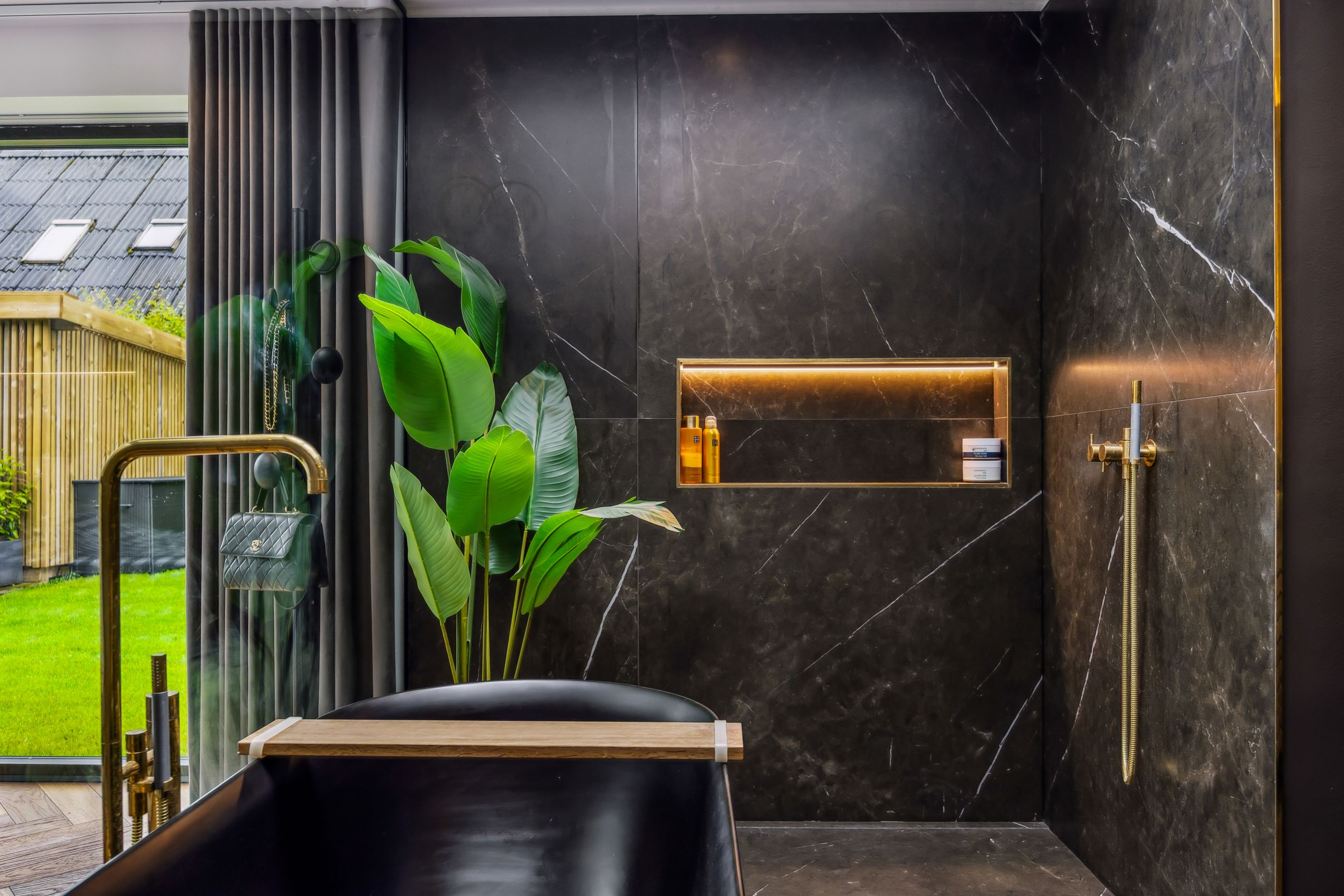 Indenfor mødes du af smukke, massive hårdtbørstede sildebensgulve i specialmål med behagelig gulvvarme overalt. Køkkenalrummet imponerer med loft til kip, indbygget Sonos i loftet, stor køkkenø med masser af plads og dobbelte Velux-vinduer over sofa, seng og badekar, hvorfra man kan nyde den smukke himmel. Hårdehvidevarerne er topmodeller fra Miele – alt med touch – herunder ovn med kamera og trådløst stegetermometer, vin-køleskab med sommelier-sæt, fryser med isterningefunktion, kaffemaskine der med ét tryk laver din yndlings cafékaffe og Quooker med brus.