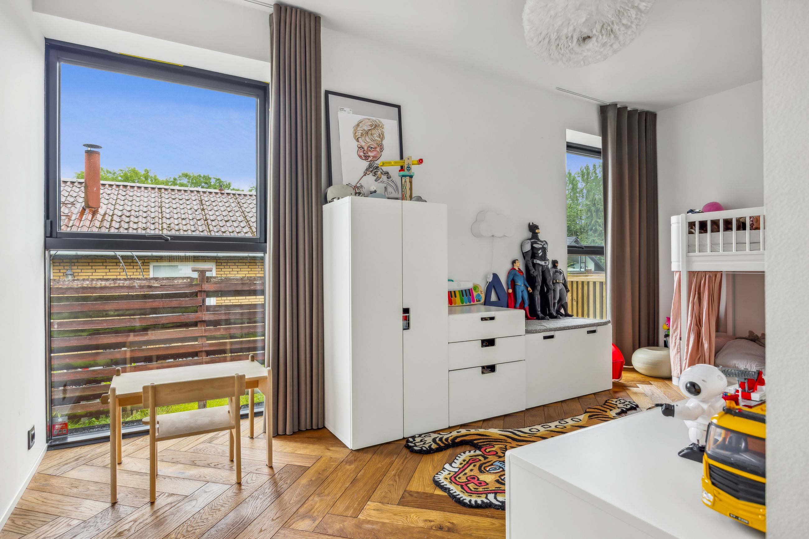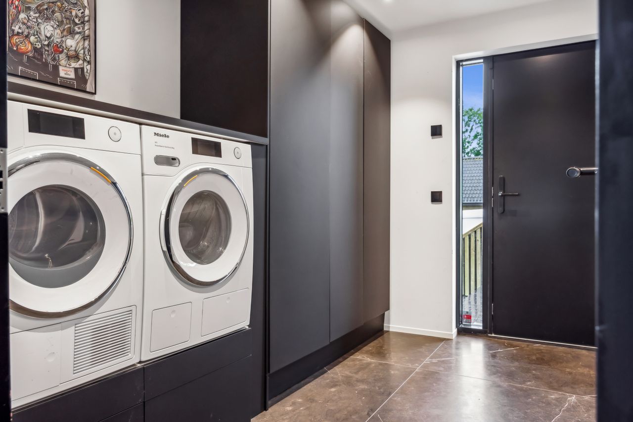 Husets smarte intelligente NIKO Home system styrer lys, musik, varme, gardiner, ovenlysvinduer og sikkerhed. Derudover finder du masterbedroom med eksklusiv hotelstemning, tre rummelige børneværelser, kontorplads, hyggelig alkove, praktisk bryggers, gæstebadeværelse samt stort loftsrum til opbevaring og skur.