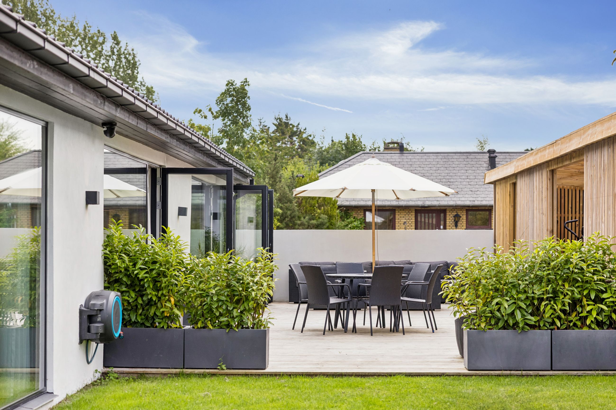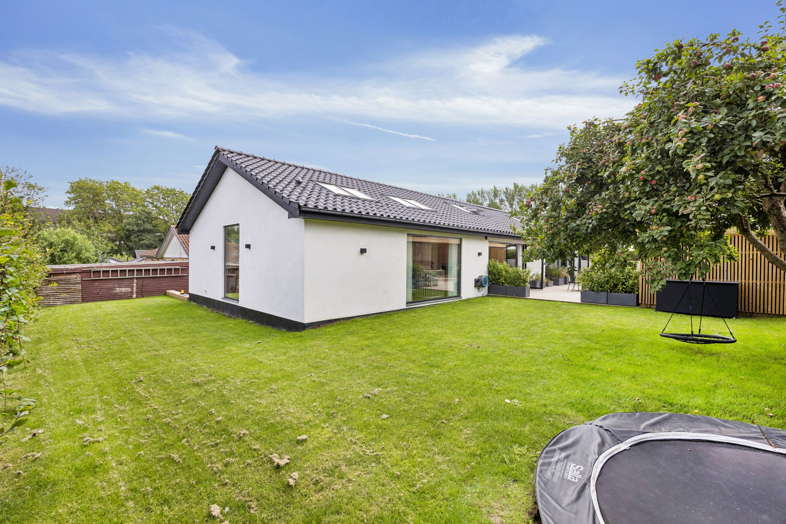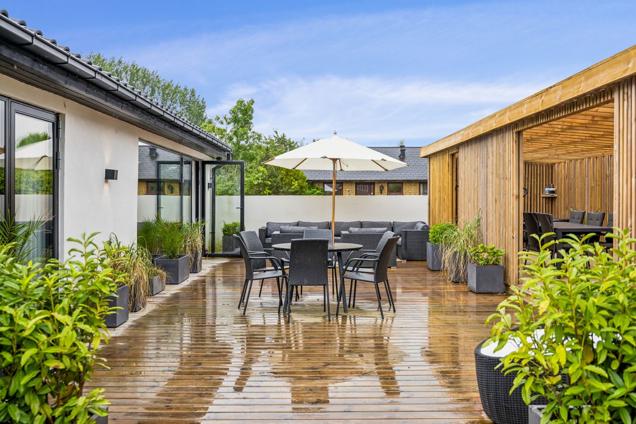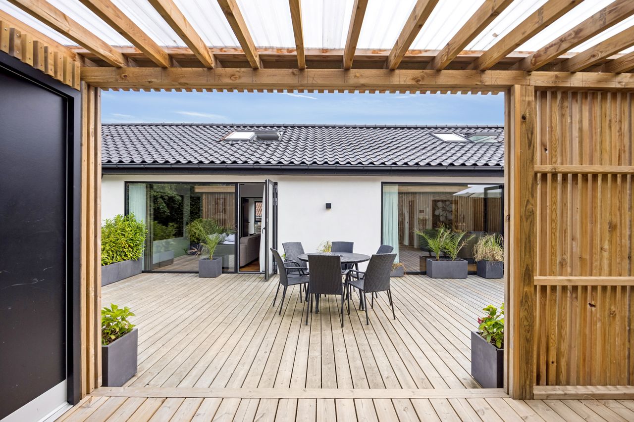 Udenfor venter en smukt terrasse- og et havemiljø med flere opholdspladser – både overdækkede og åbne – perfekt til leg, samvær og afslapning året rundt.