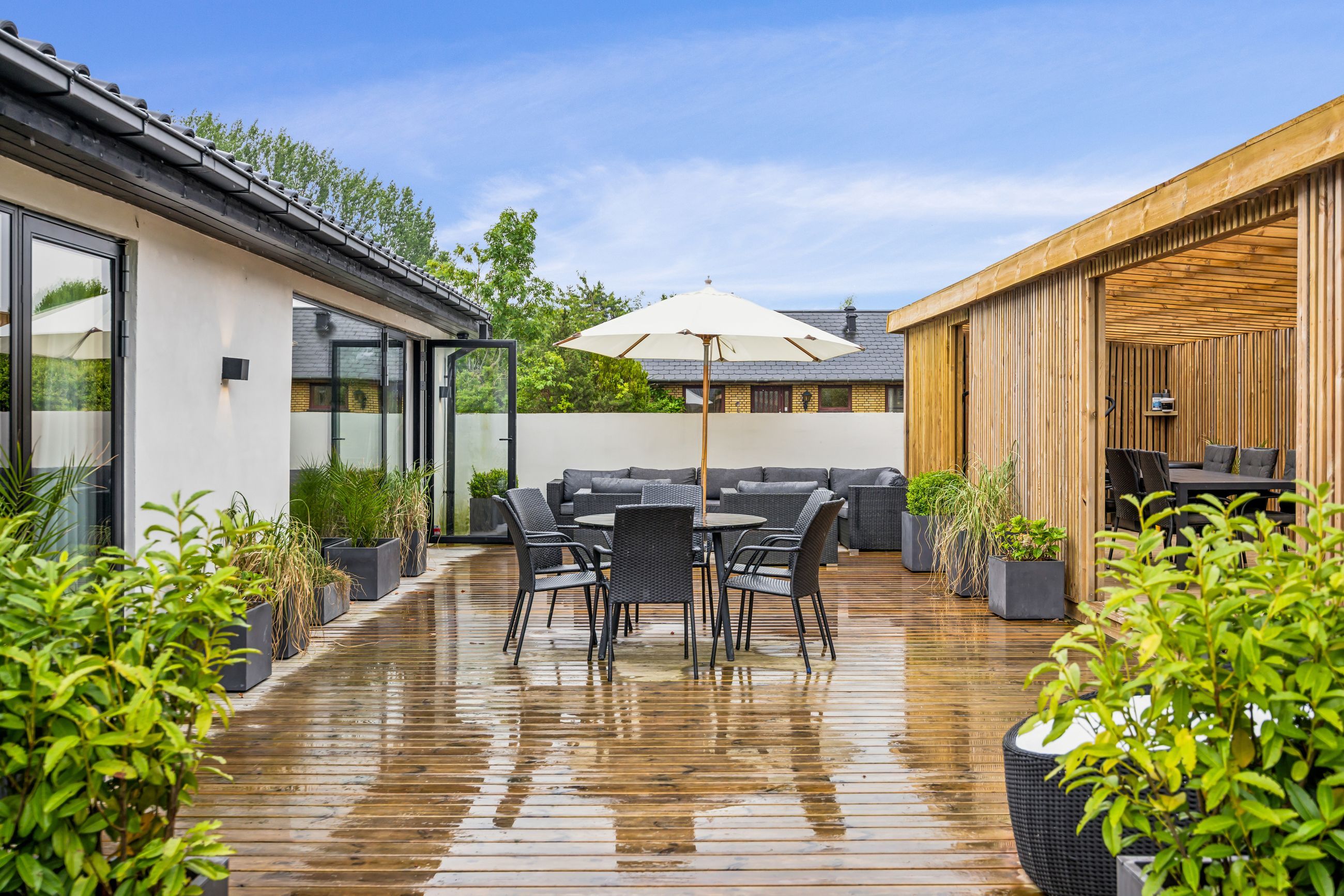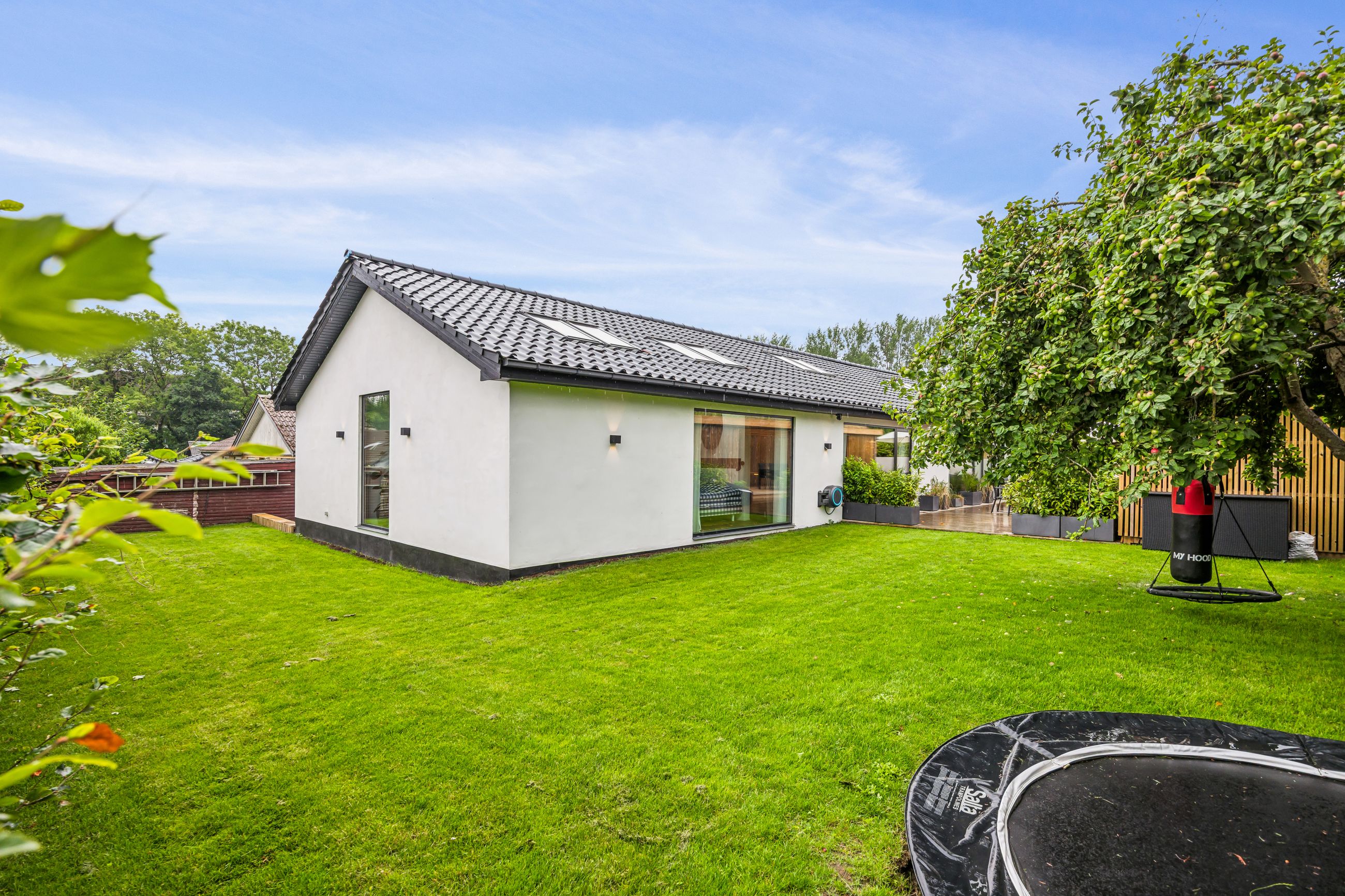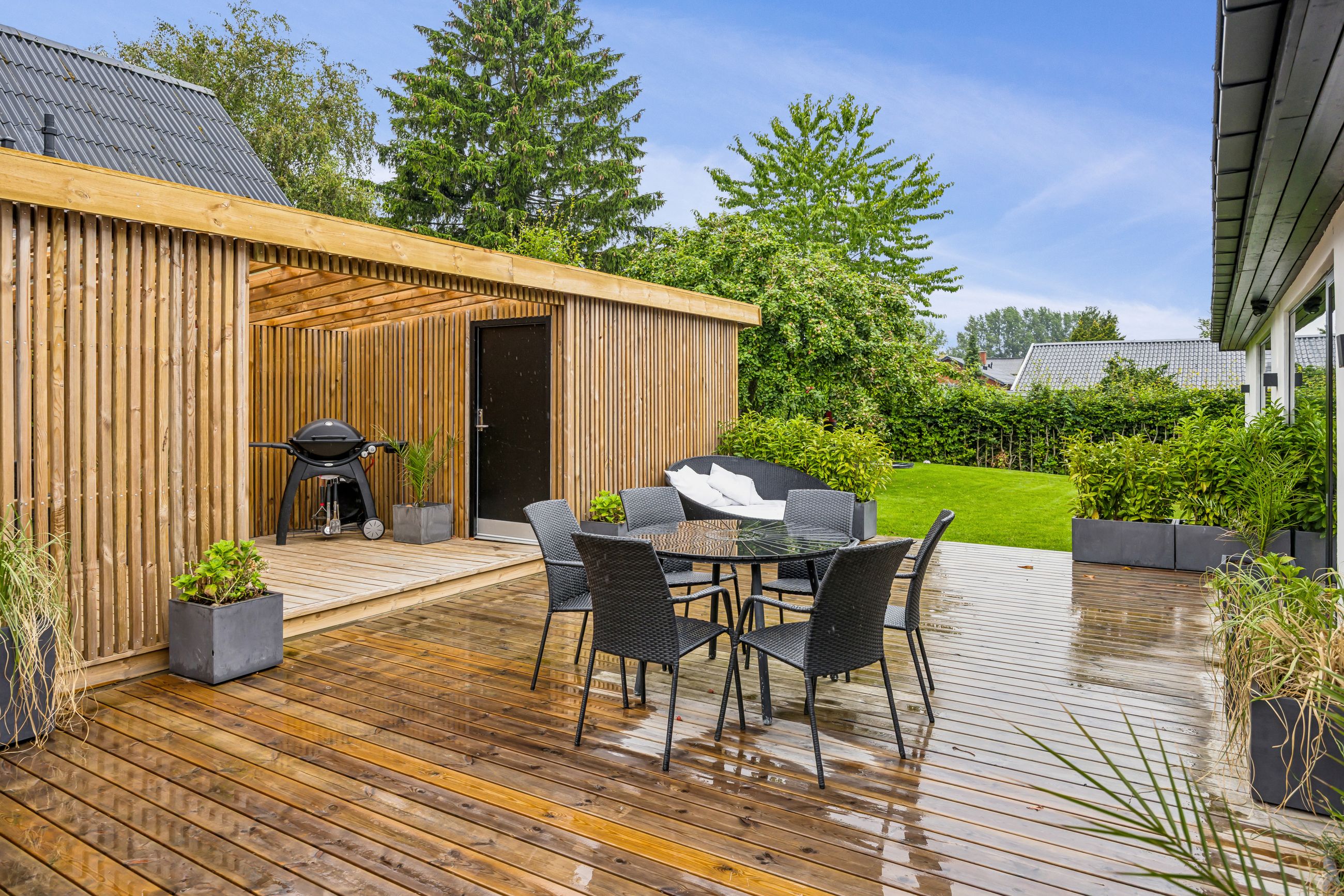 Udenfor venter en smukt terrasse- og et havemiljø med flere opholdspladser – både overdækkede og åbne – perfekt til leg, samvær og afslapning året rundt.