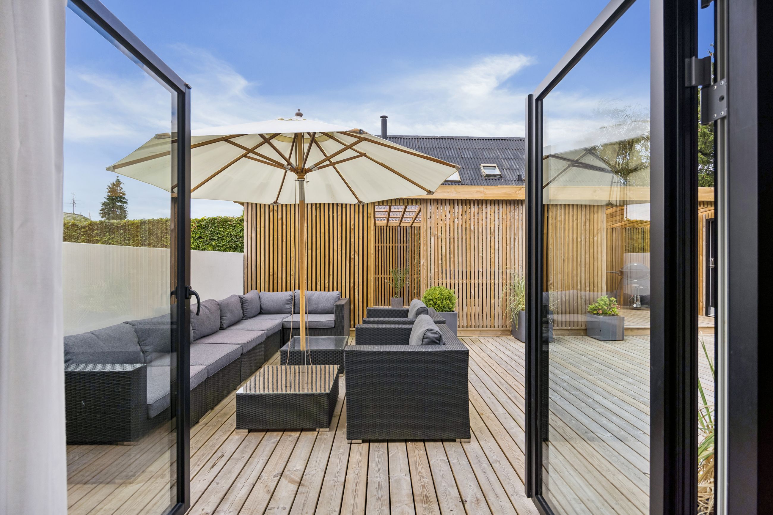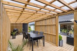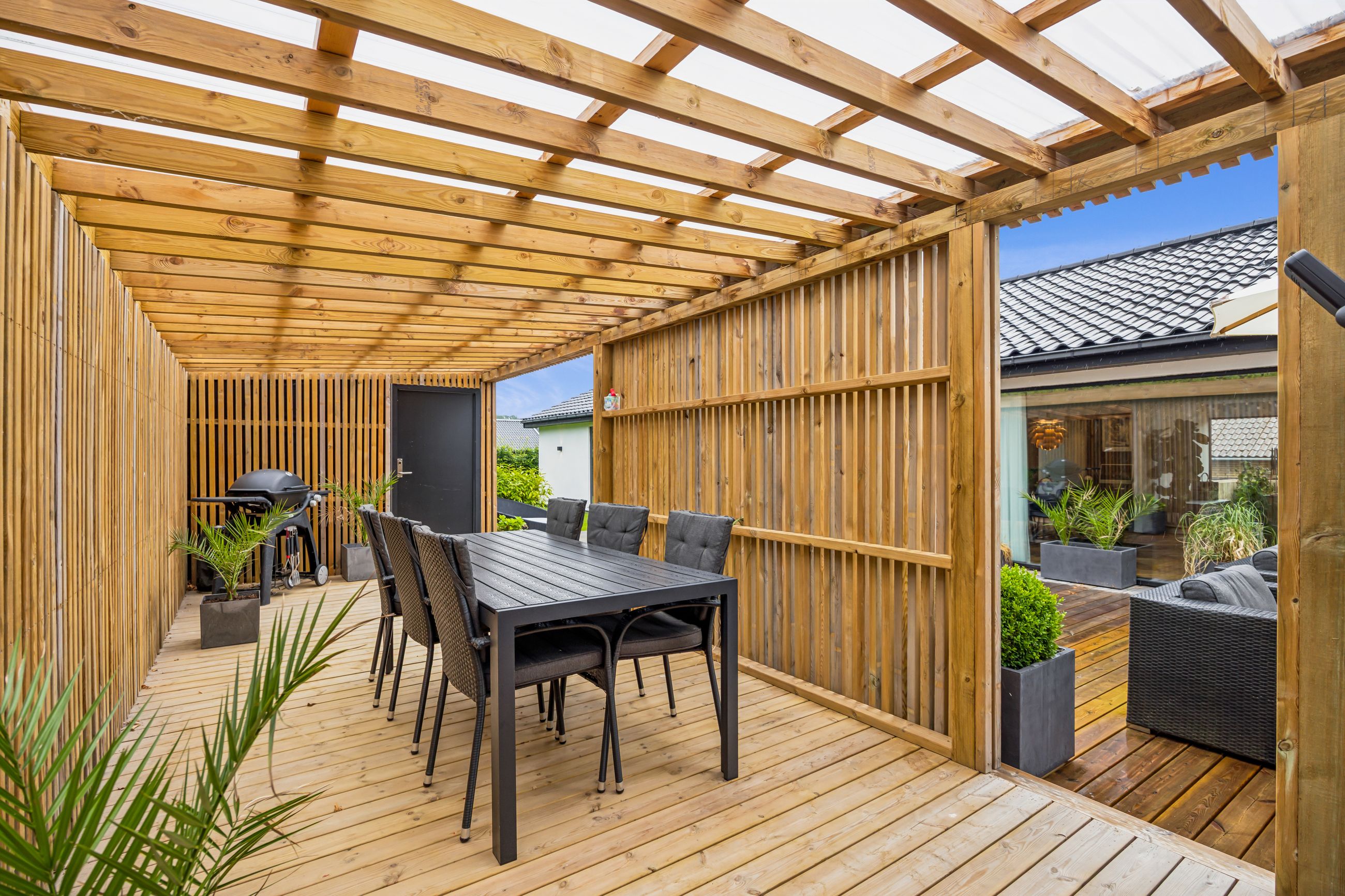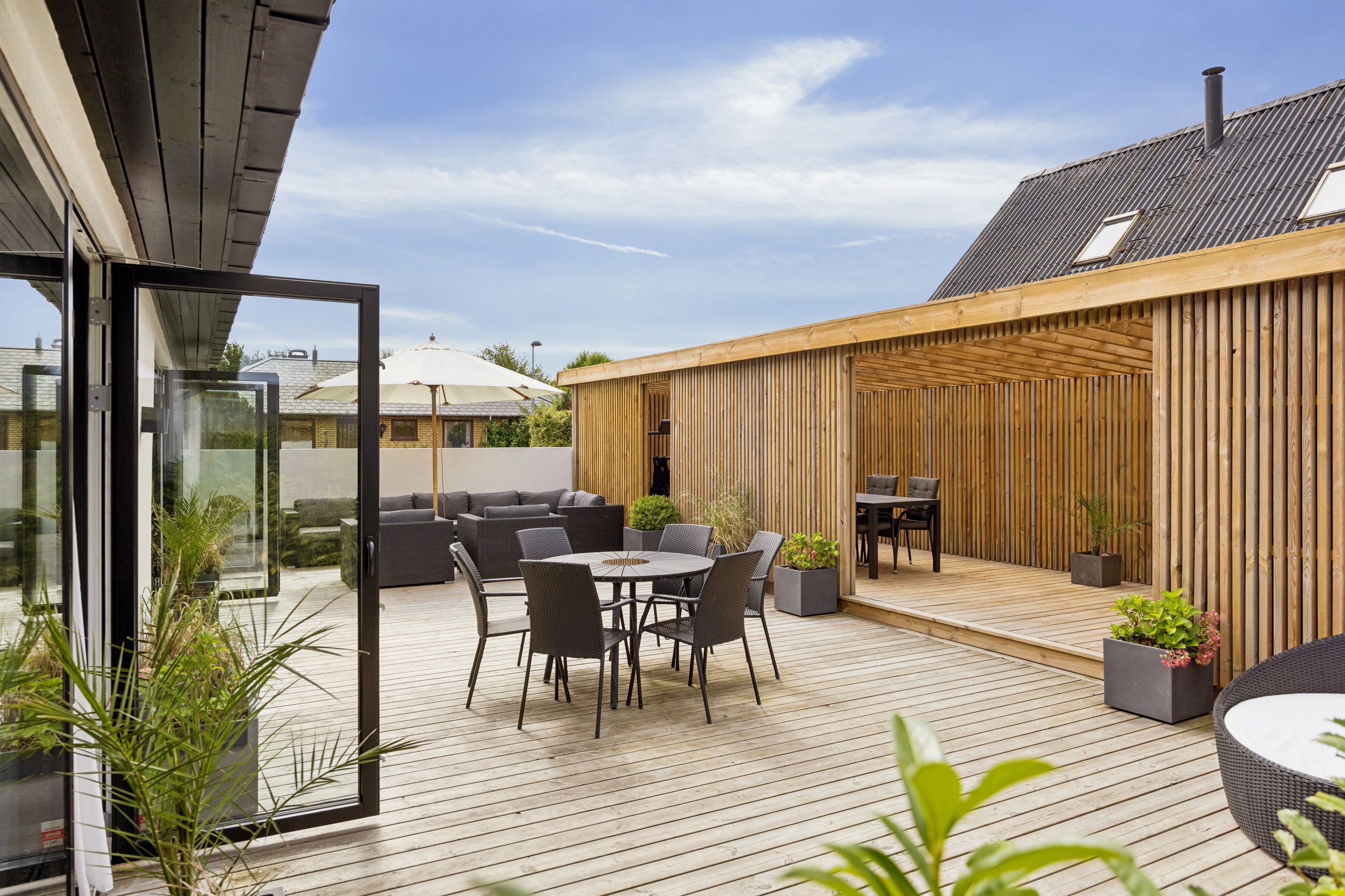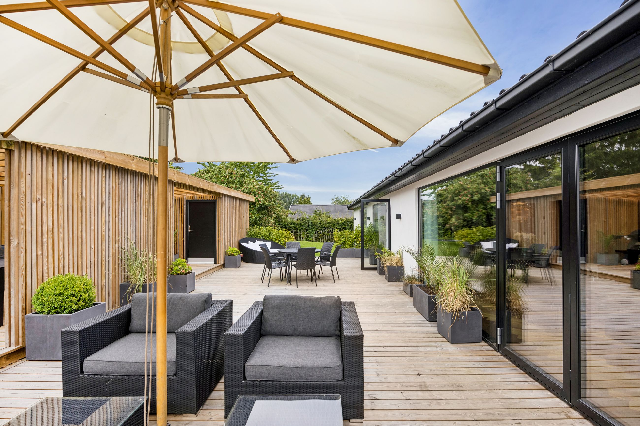 Udenfor venter en smukt terrasse- og et havemiljø med flere opholdspladser – både overdækkede og åbne – perfekt til leg, samvær og afslapning året rundt.