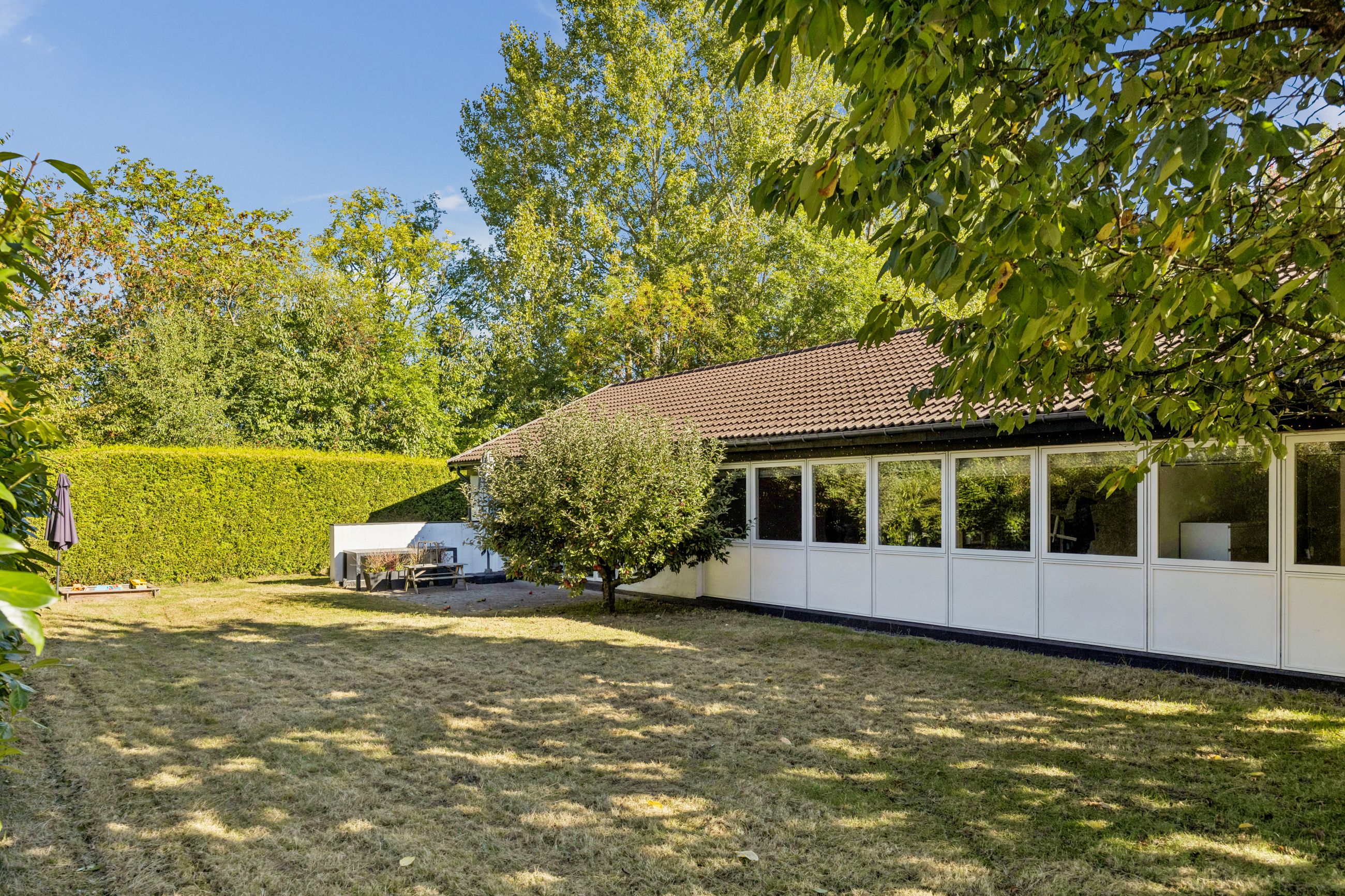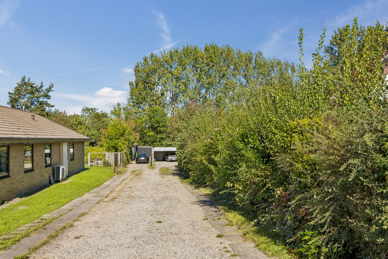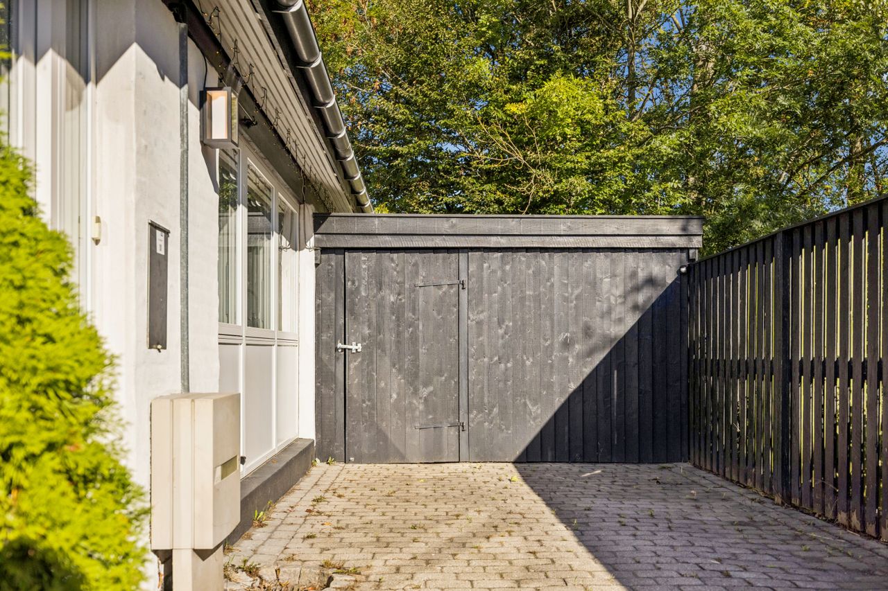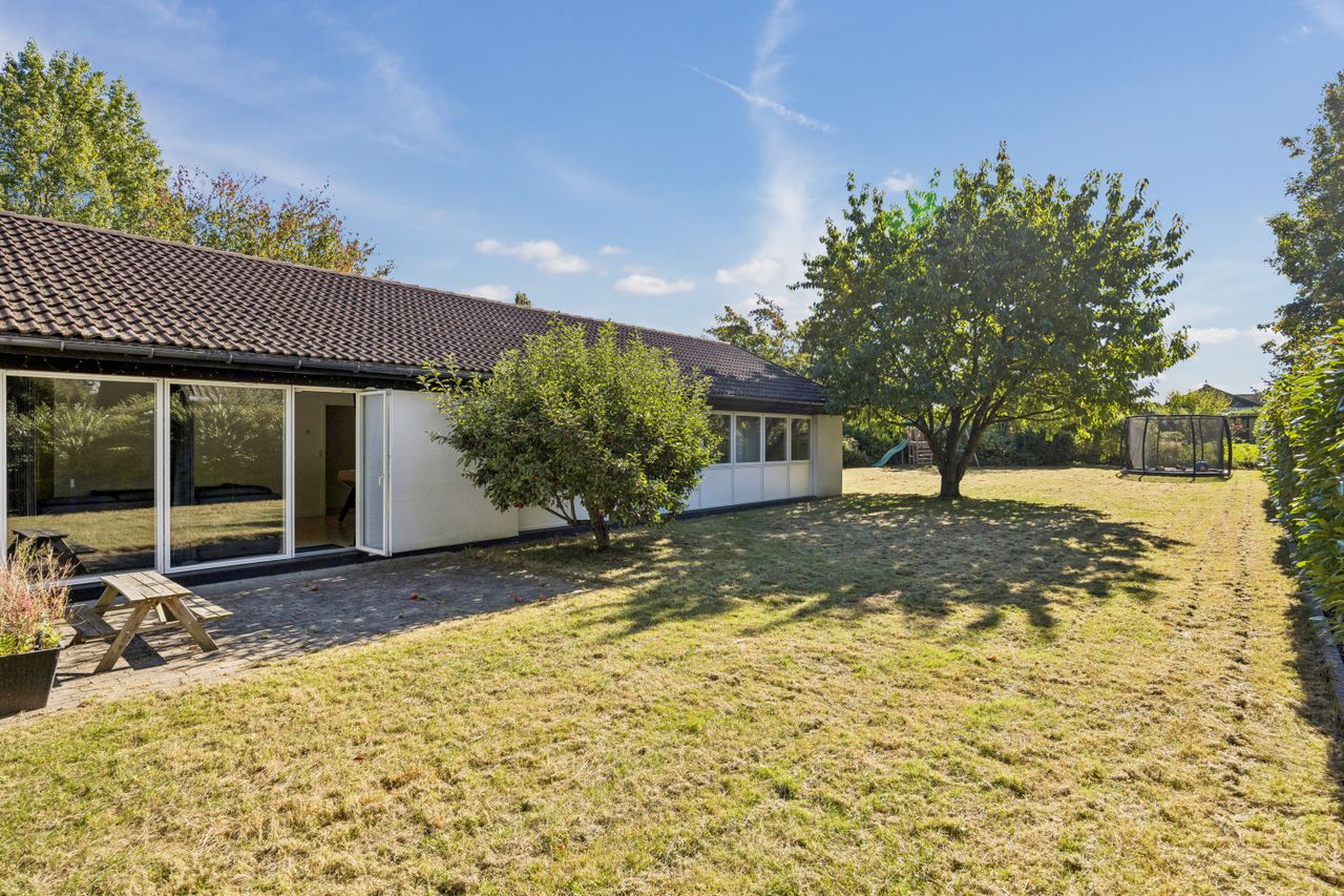 Udendørs kan man glæde sig over en stor sydvestvendt have med solrig terrasse perfekt til sommerens mange grillfester eller afslapning under åben himmel. Den rummelige garage giver ikke kun mulighed for parkering men også plads til cykler eller måske endda etablering af et nyt værksted.