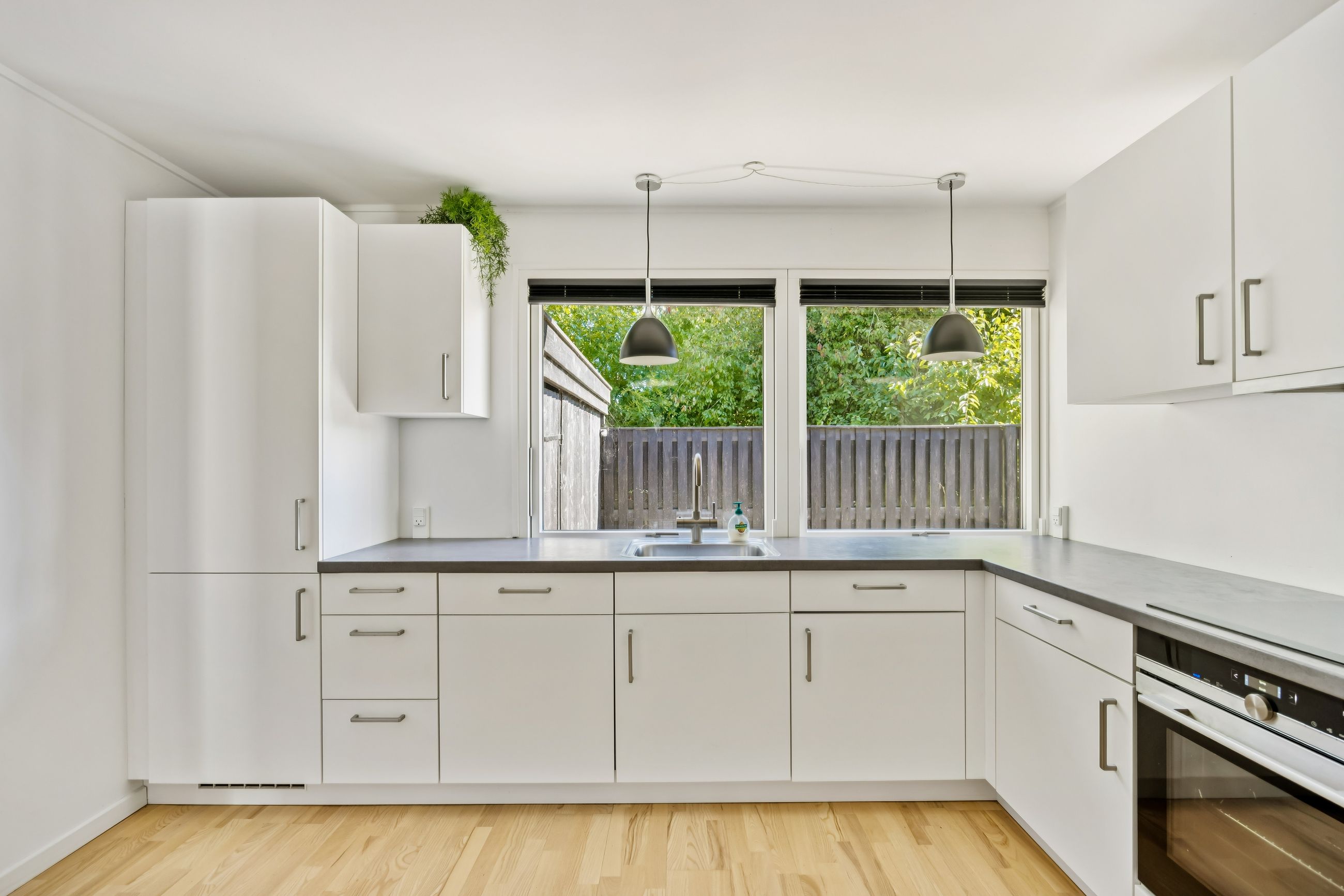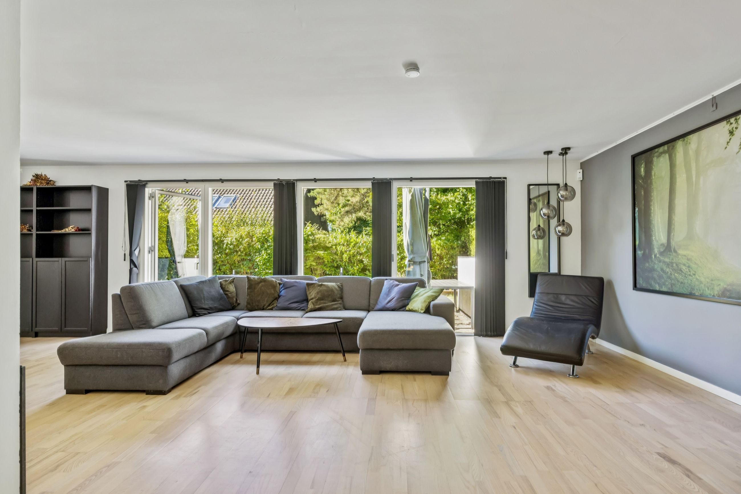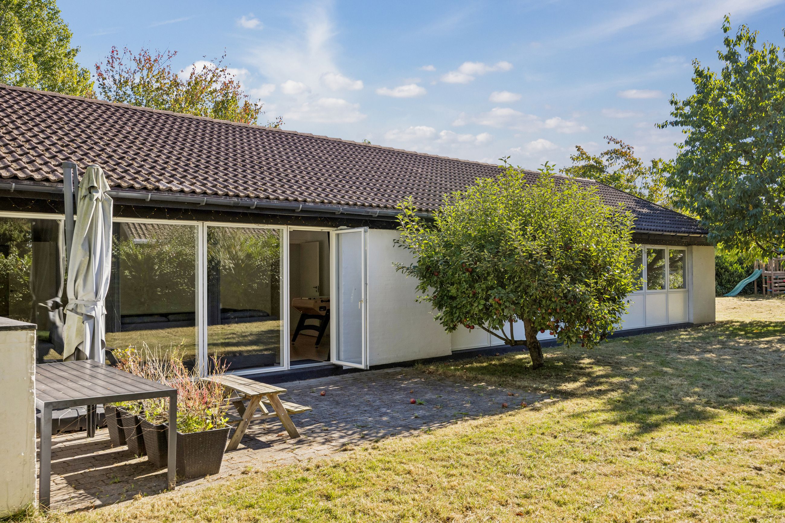 Udendørs kan man glæde sig over en stor sydvestvendt have med solrig terrasse perfekt til sommerens mange grillfester eller afslapning under åben himmel. Den rummelige garage giver ikke kun mulighed for parkering men også plads til cykler eller måske endda etablering af et nyt værksted.