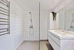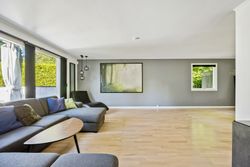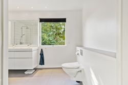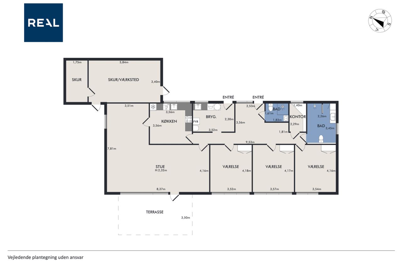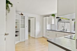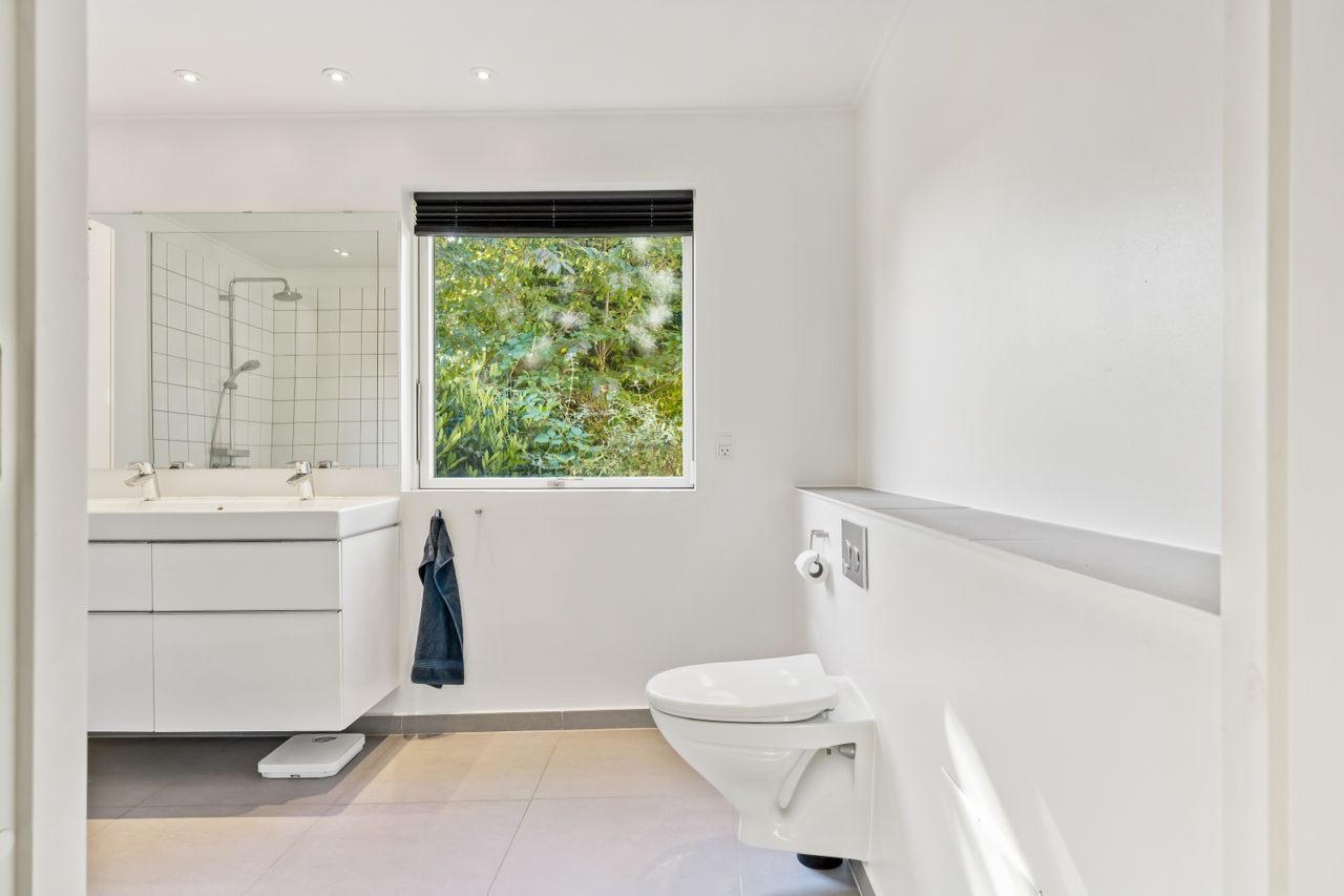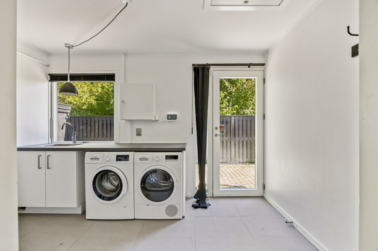 Ejendommen rummer to badeværelser samt et praktisk bryggers med egen indgang, hvilket gør hverdagen lettere for den travle familie. En fin fordelingsgang binder huset sammen på elegant vis og leder videre til det store køkken, hvor der er rigeligt med plads til at nyde måltider ved spisebordet. Gulvvarmen i størstedelen af boligen sikrer en behagelig temperatur året rundt.