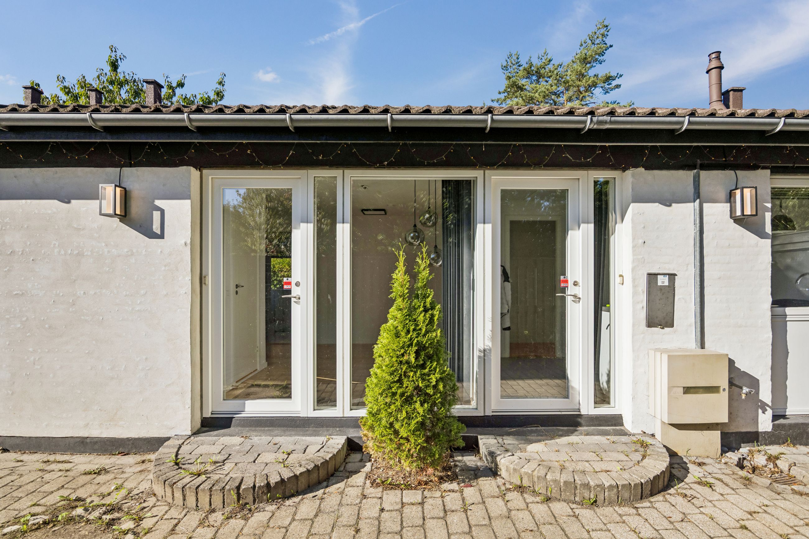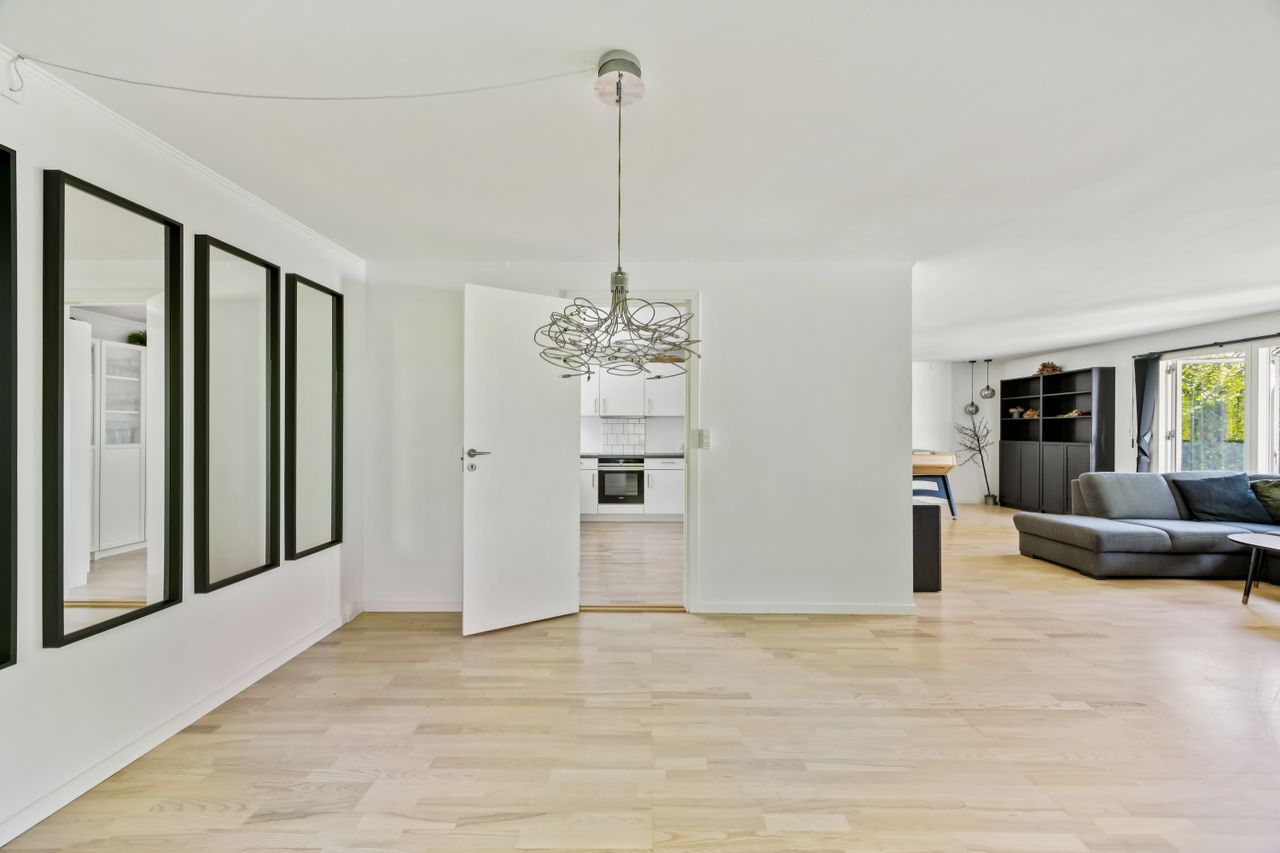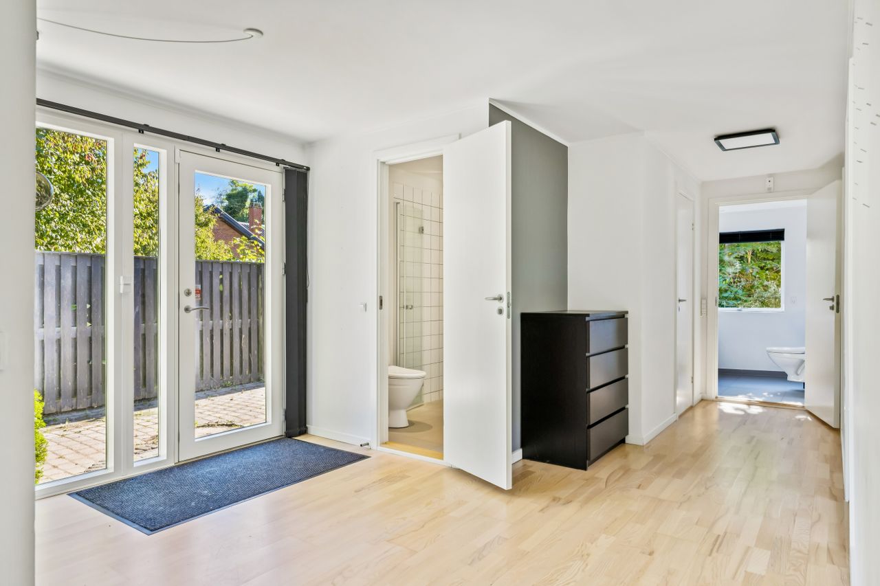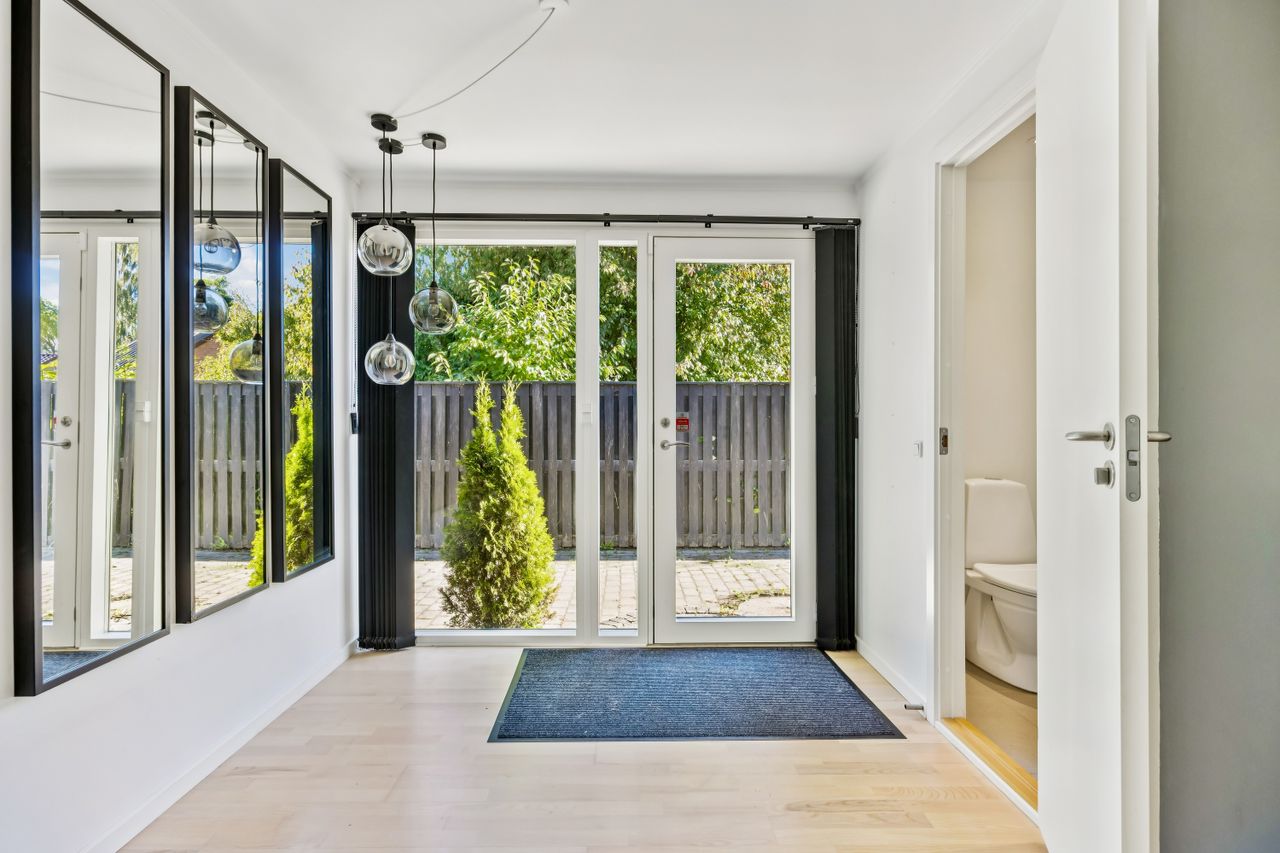 Ved hovedindgangen mødes man af et imponerende glasparti, der lukker masser af lys ind i den store entré. Derudover findes et loftrum med gangbro, som tilbyder god opbevaringsplads – ideelt for dem med behov for ekstra rum til diverse ejendele.