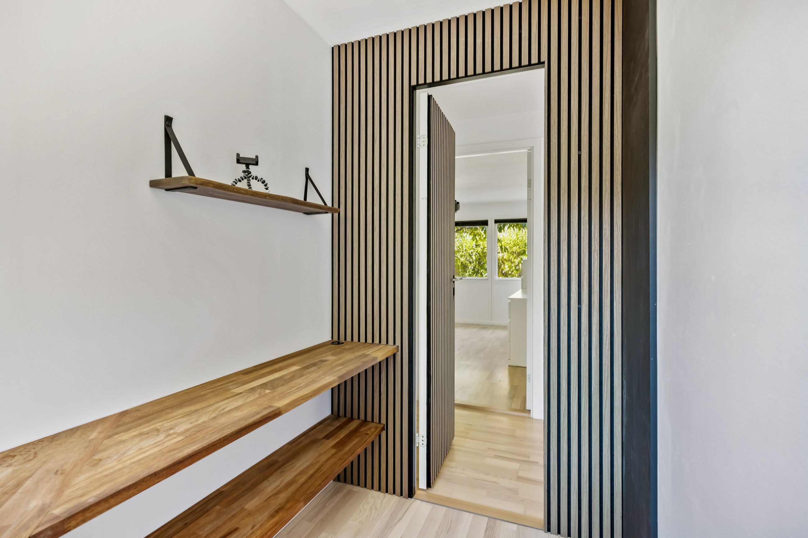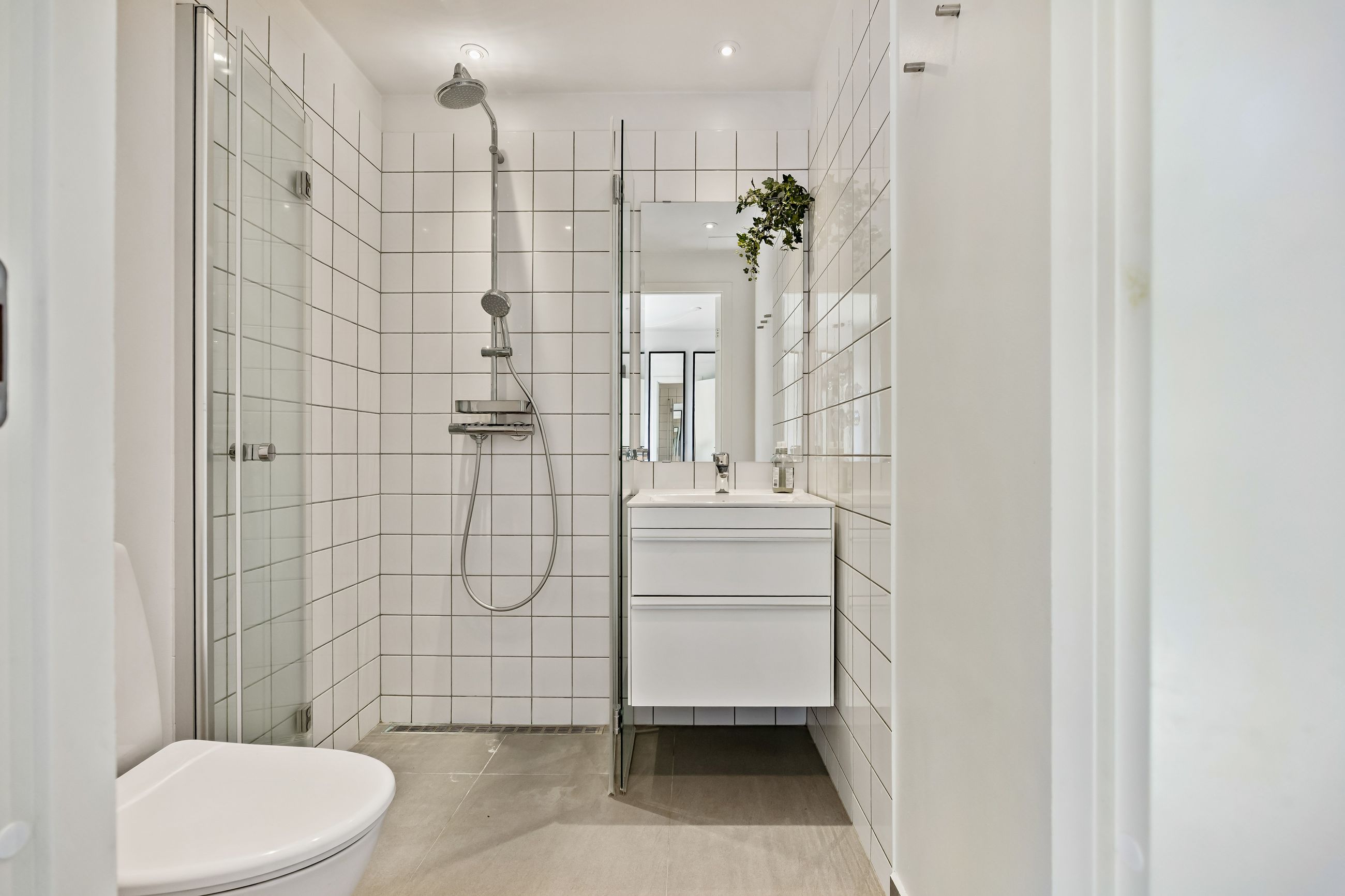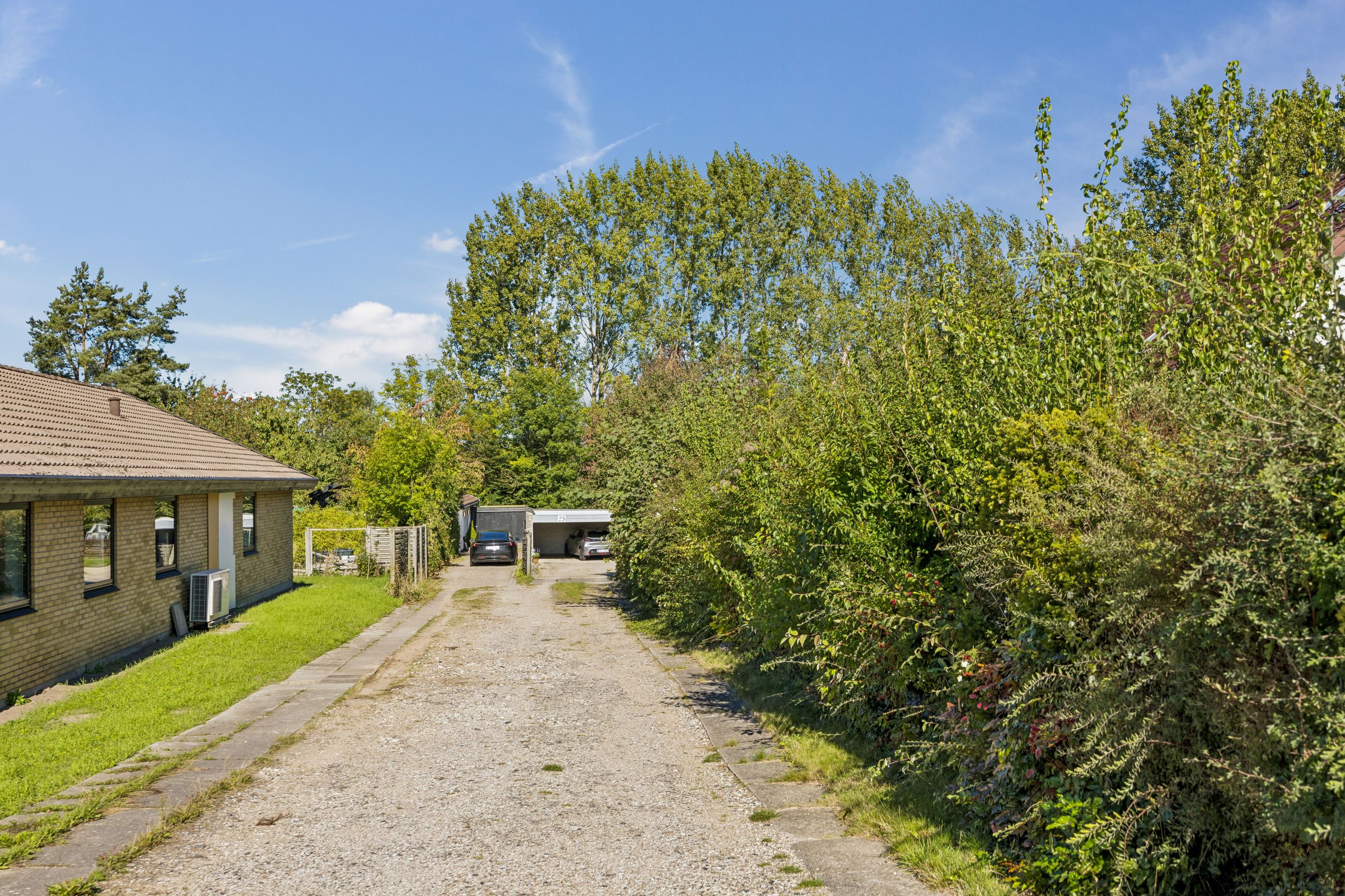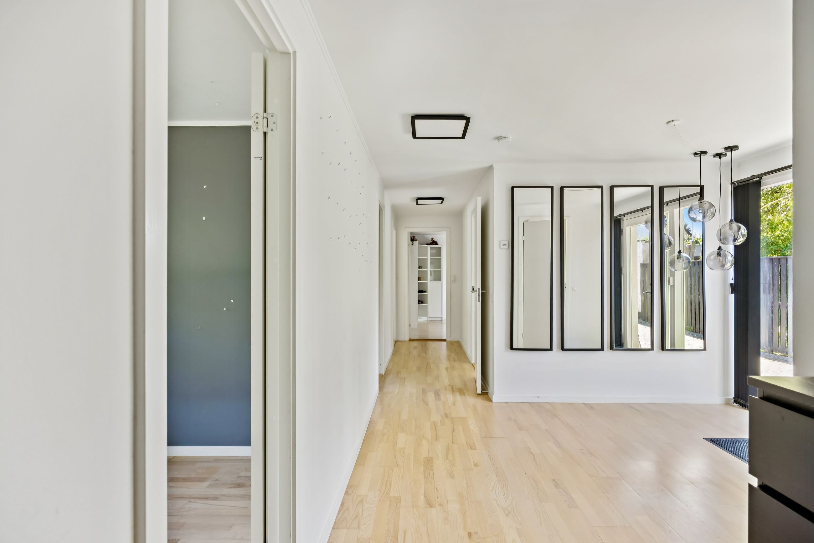 Ved hovedindgangen mødes man af et imponerende glasparti, der lukker masser af lys ind i den store entré. Derudover findes et loftrum med gangbro, som tilbyder god opbevaringsplads – ideelt for dem med behov for ekstra rum til diverse ejendele.