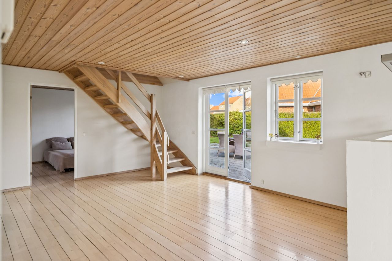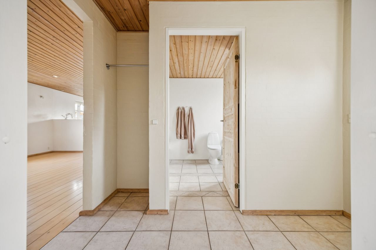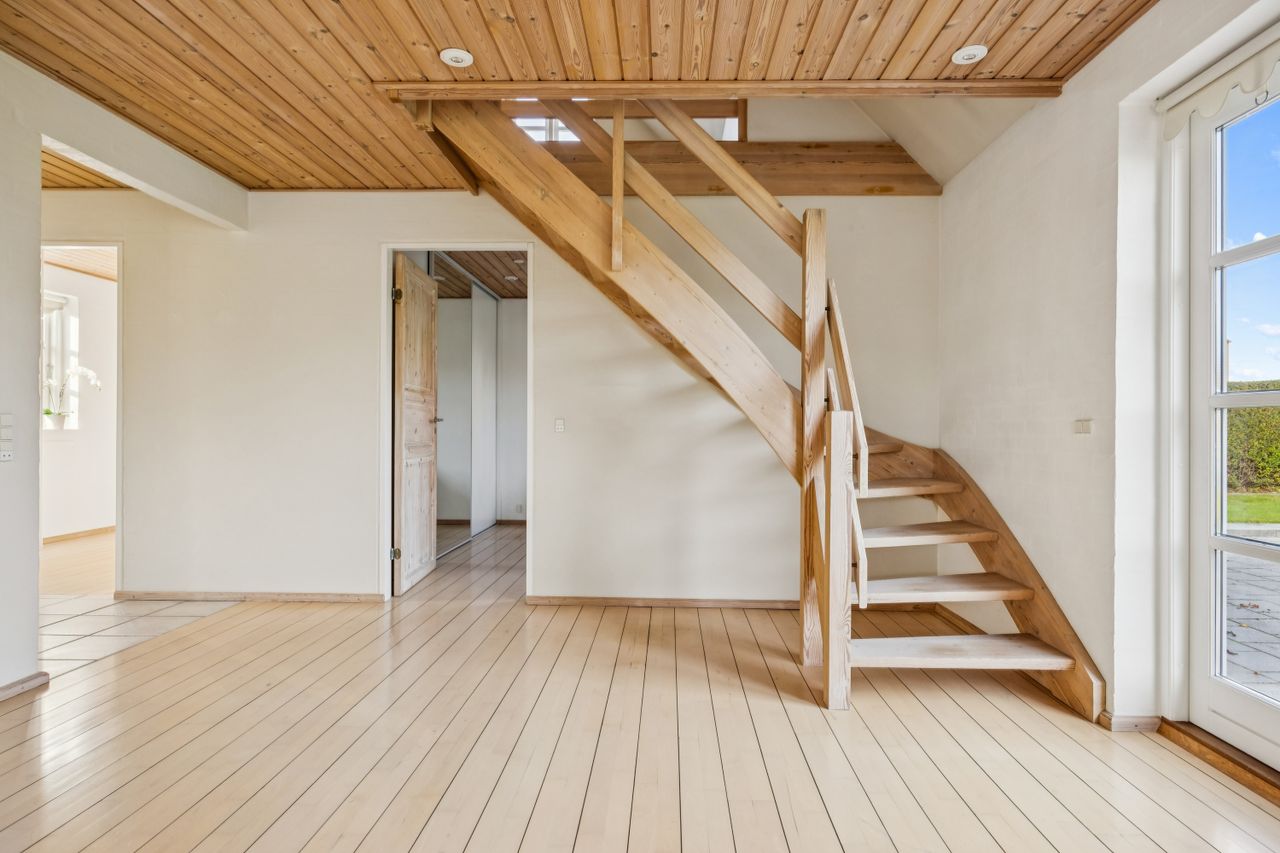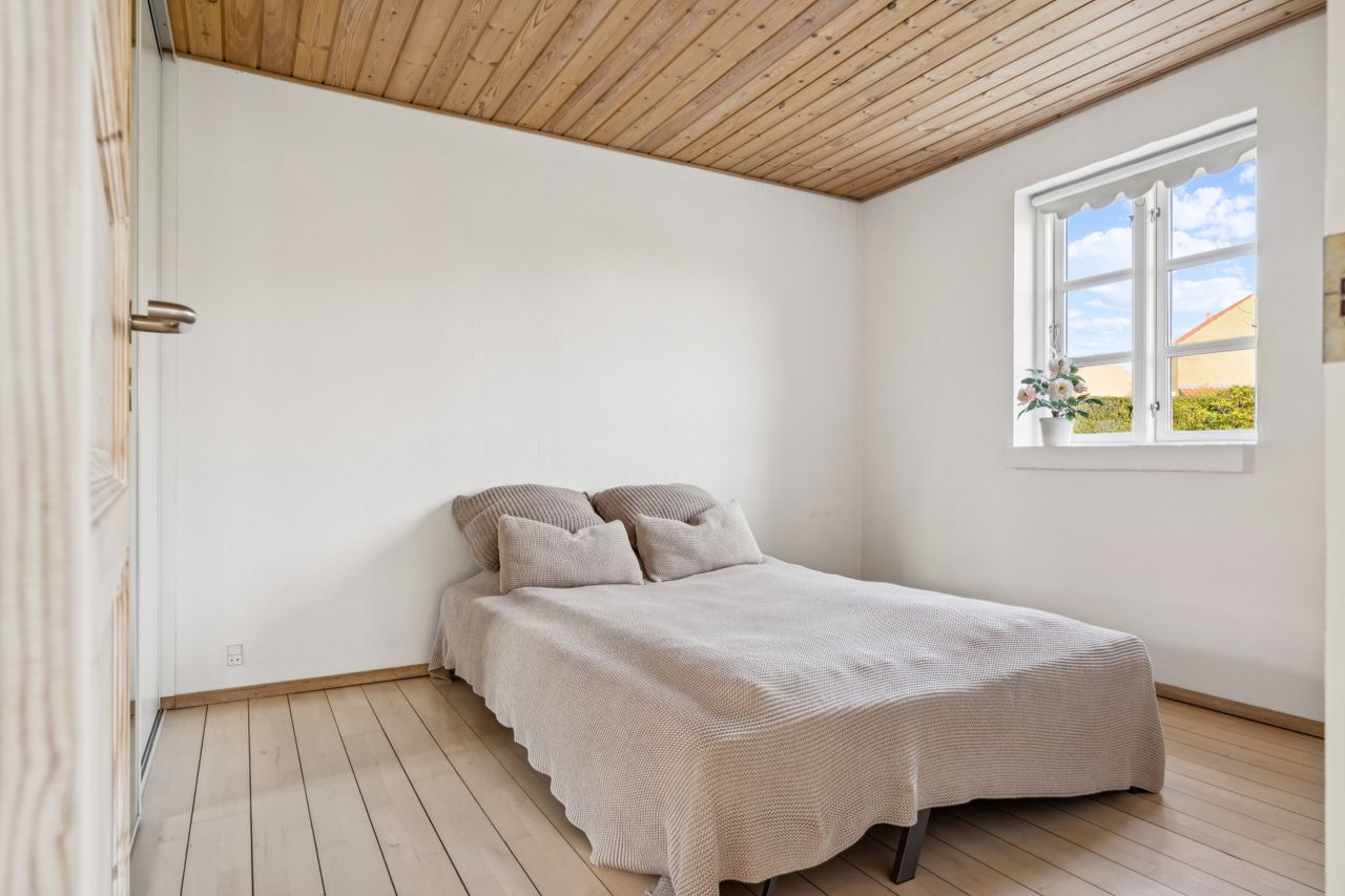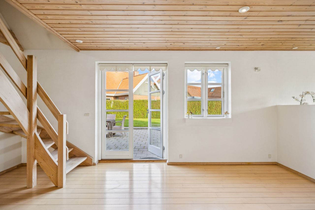 Stueplanet rummer tre værelser, hvilket giver mulighed for både soveværelser og kontorplads alt efter behov. Hvis ønsket er et større køkken-alrum, kan man nemt åbne op til det ene værelse. Det pæne badeværelse og bryggerset fuldender stueplanet sammen med behagelig gulvvarme, der sikrer komfort året rundt.