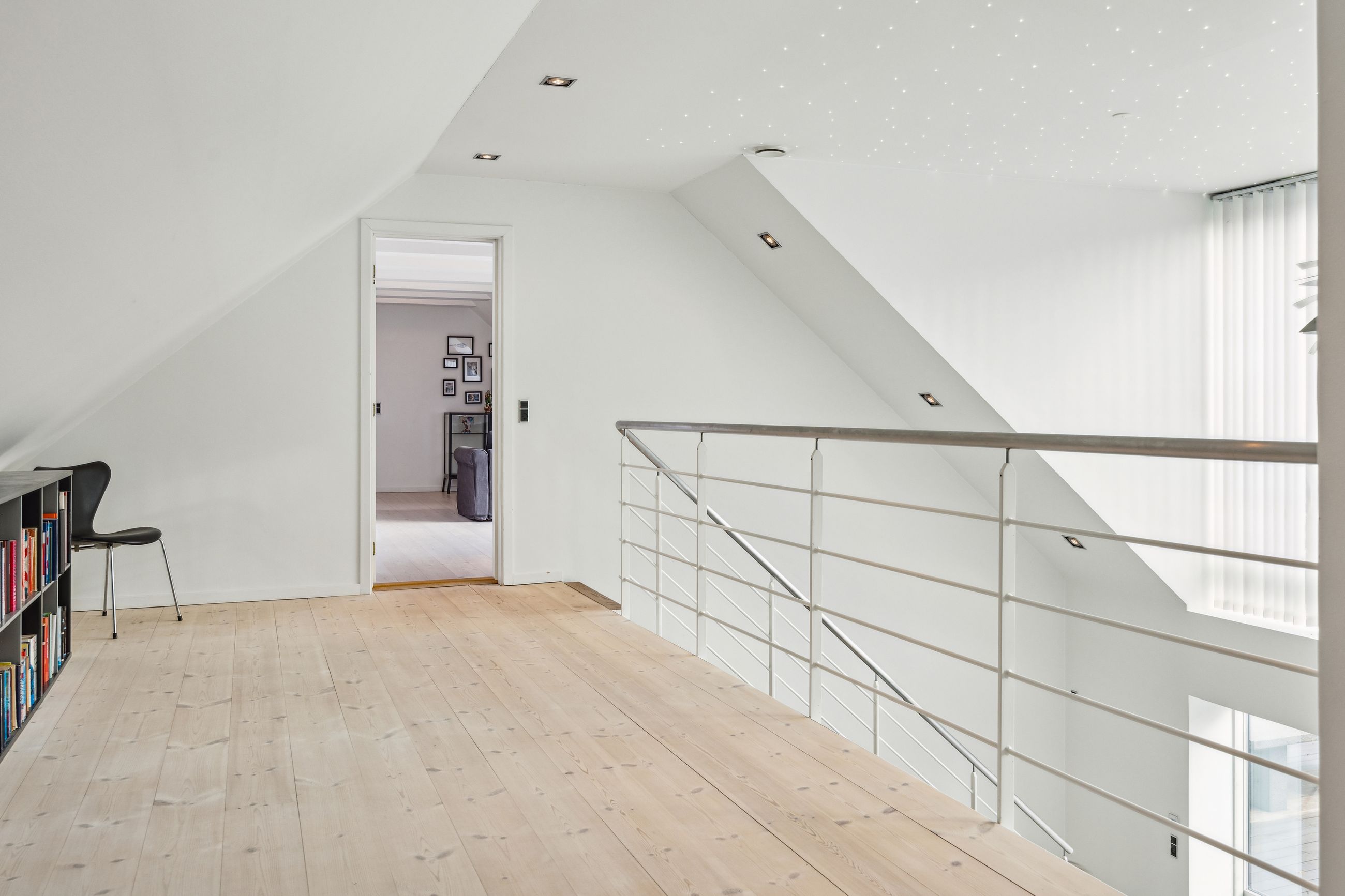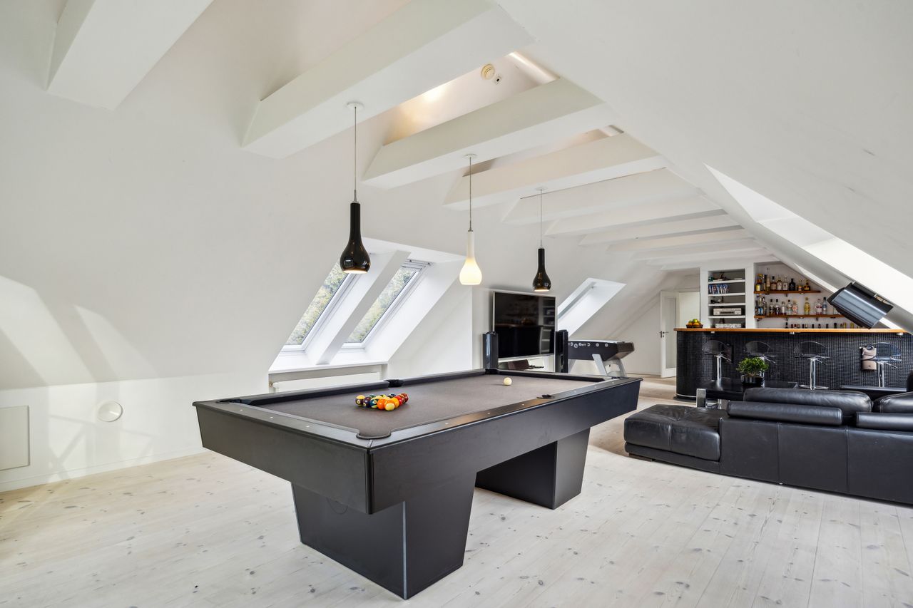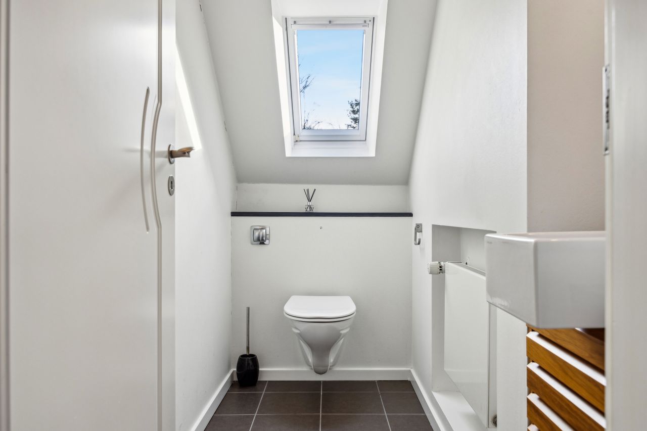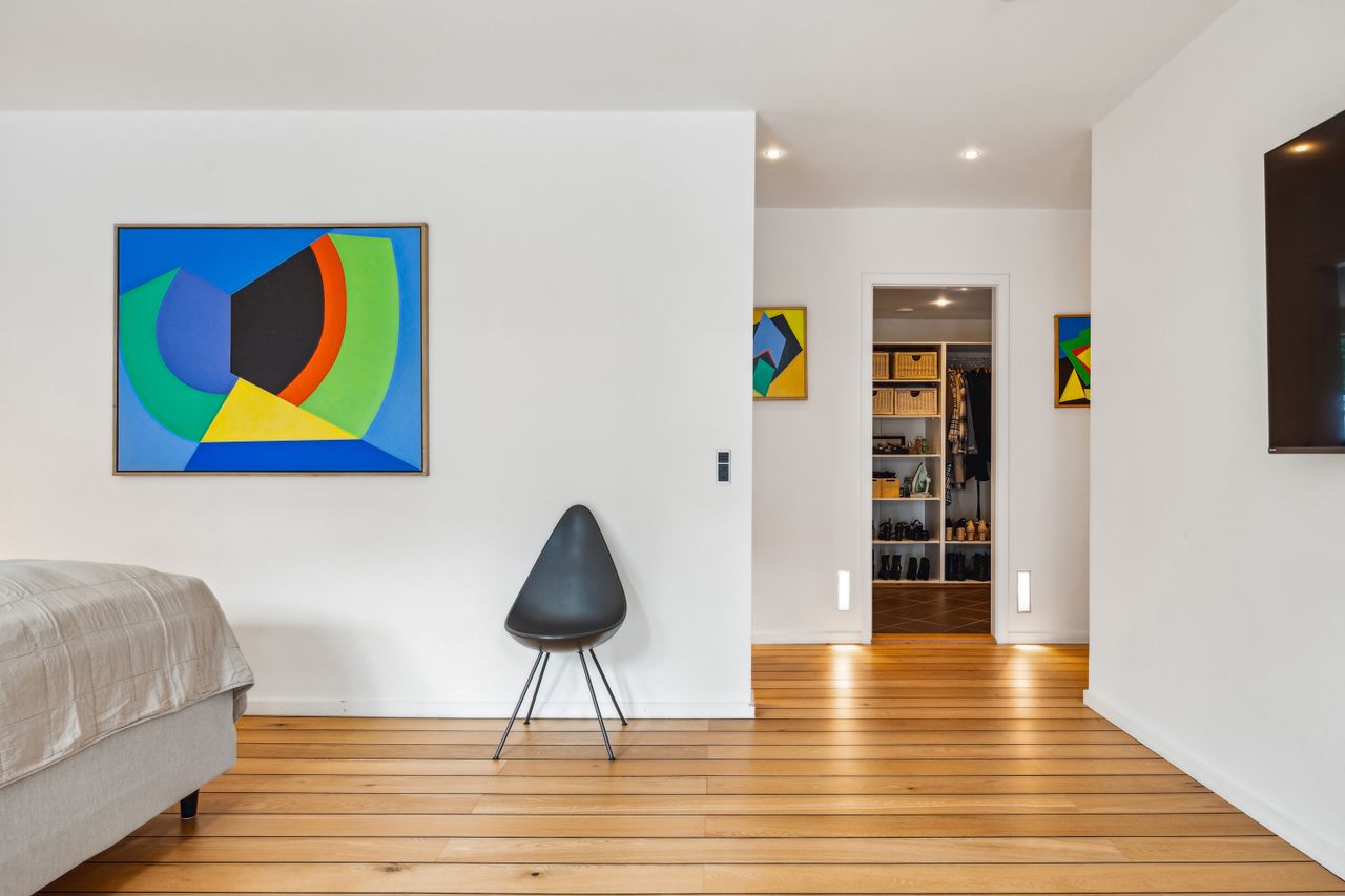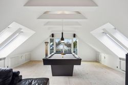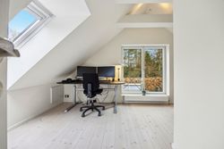 Soveafdelingen rummer et master bedroom med walk-in closet samt eget badeværelse, mens to børneværelser ligger i forlængelse heraf sammen med endnu et badeværelse. Det er i øjeblikket åbnet op, men det kan nemt reetableres. Førstesalen imponerer yderligere med et stort repos samt tre store værelser alle prydet af loft til kip, hvilket giver en flot udsigt over de omkringliggende områder.