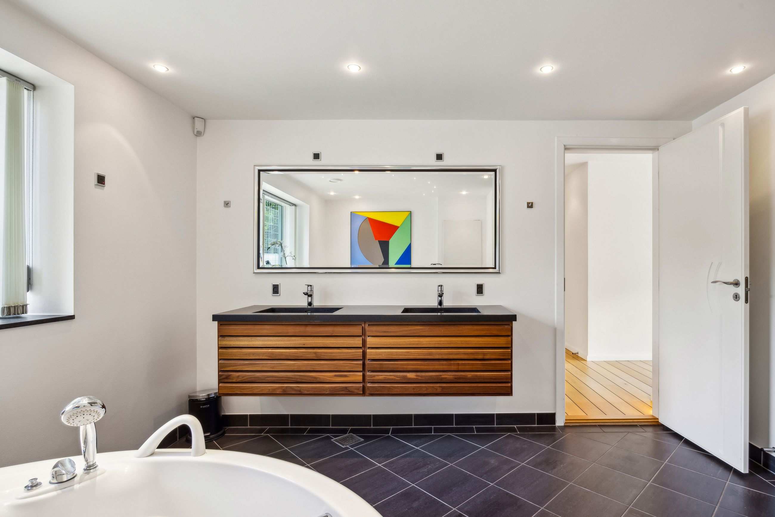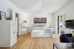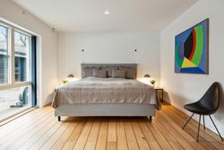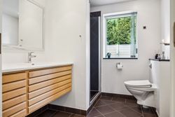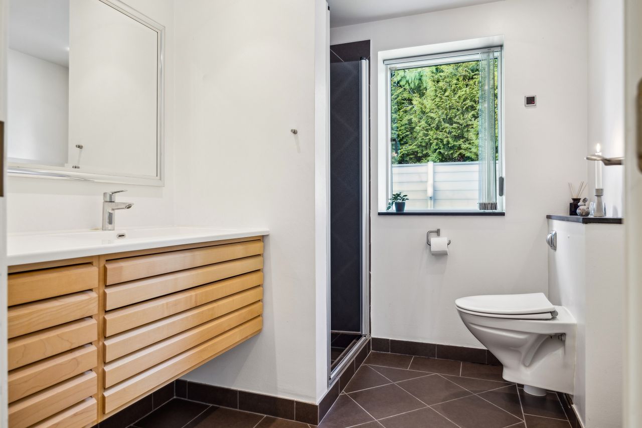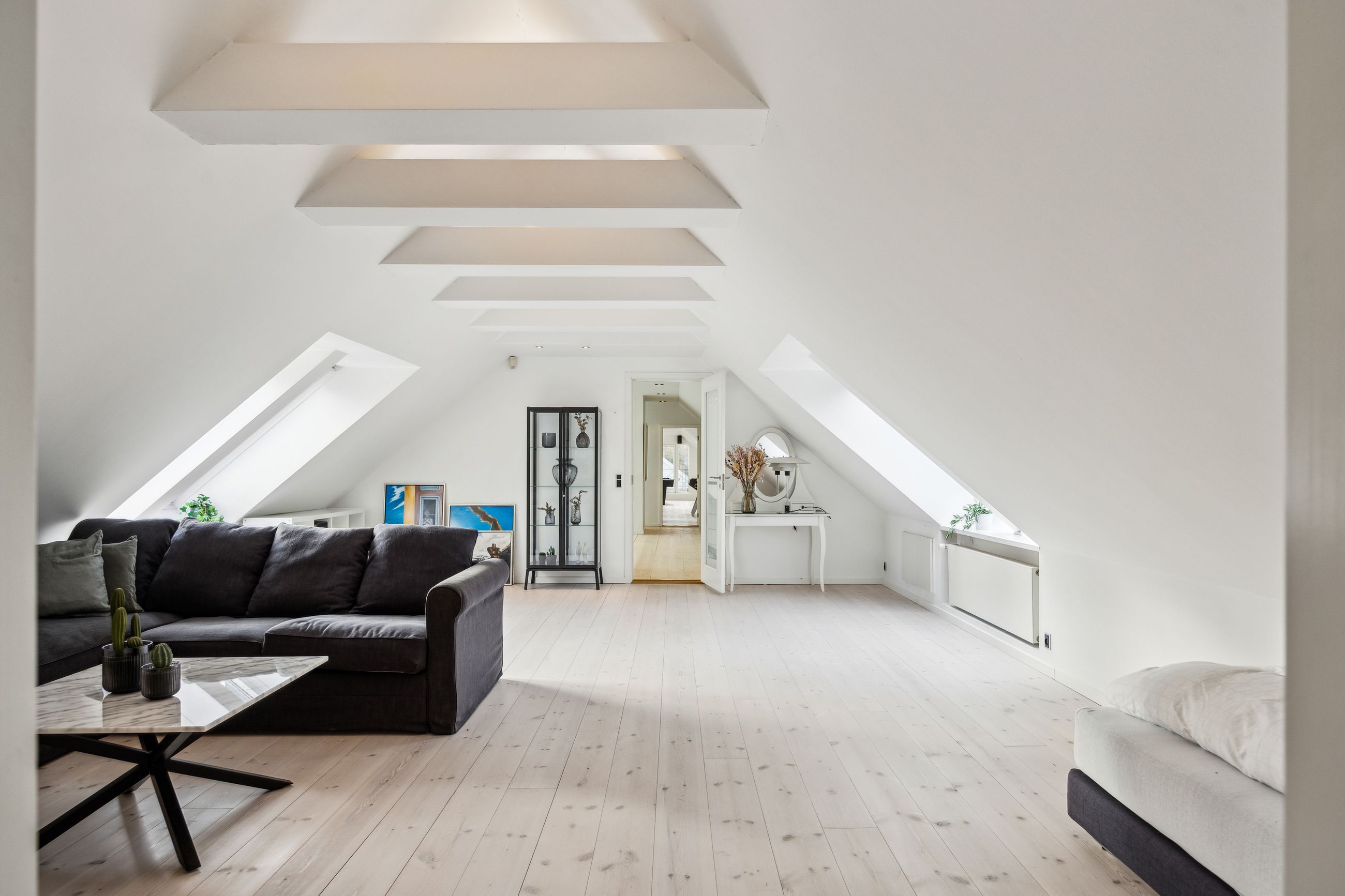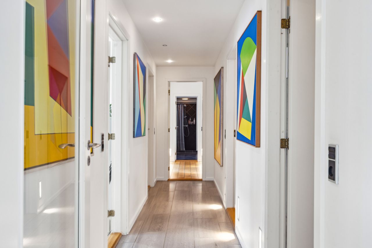 Soveafdelingen rummer et master bedroom med walk-in closet samt eget badeværelse, mens to børneværelser ligger i forlængelse heraf sammen med endnu et badeværelse. Det er i øjeblikket åbnet op, men det kan nemt reetableres. Førstesalen imponerer yderligere med et stort repos samt tre store værelser alle prydet af loft til kip, hvilket giver en flot udsigt over de omkringliggende områder.