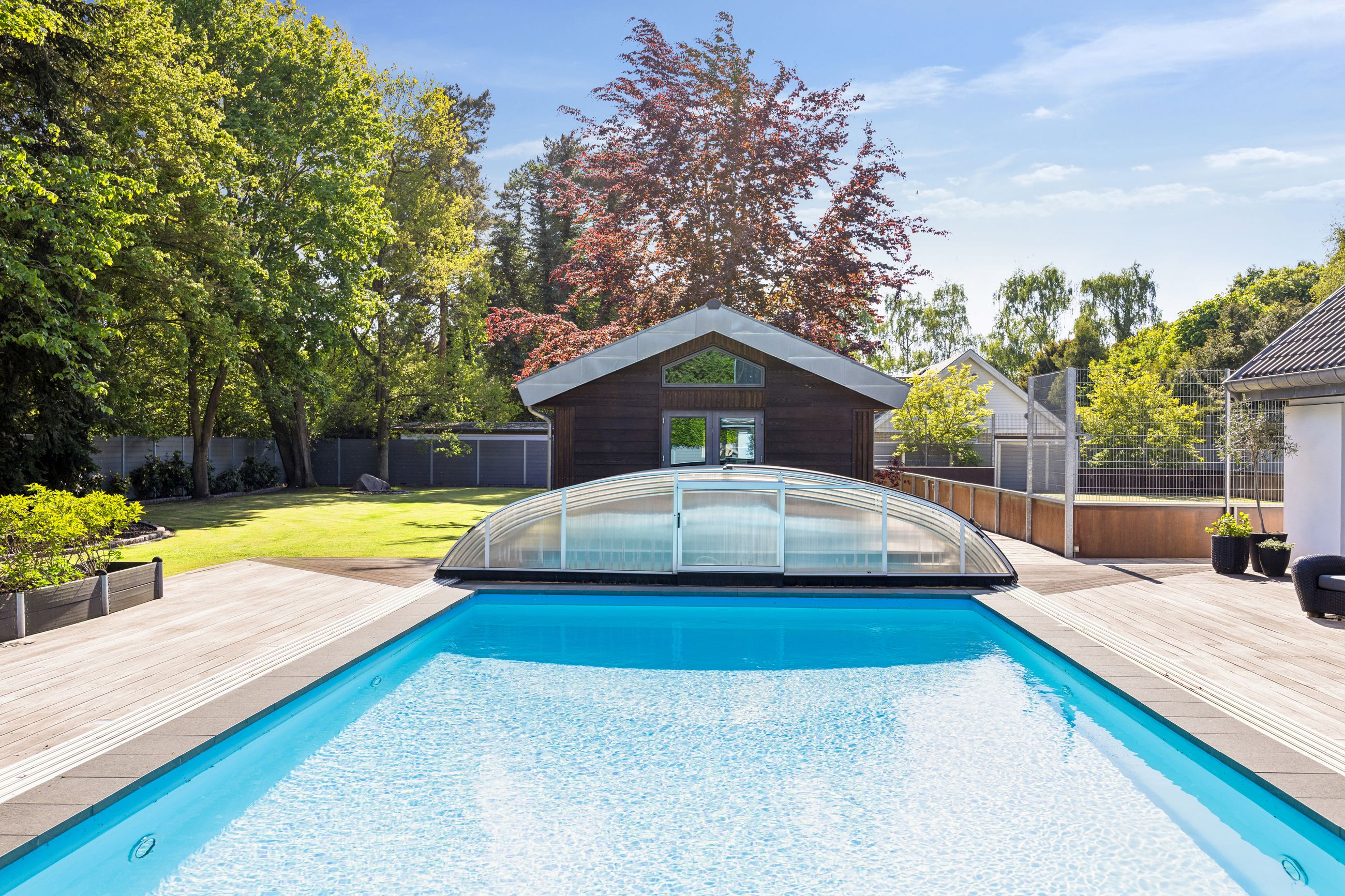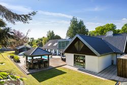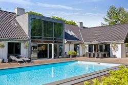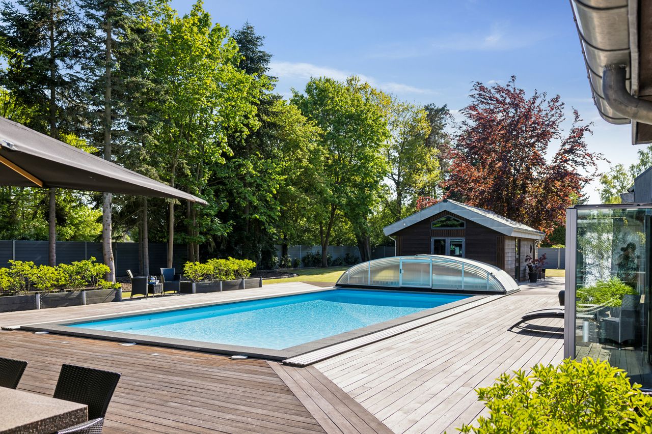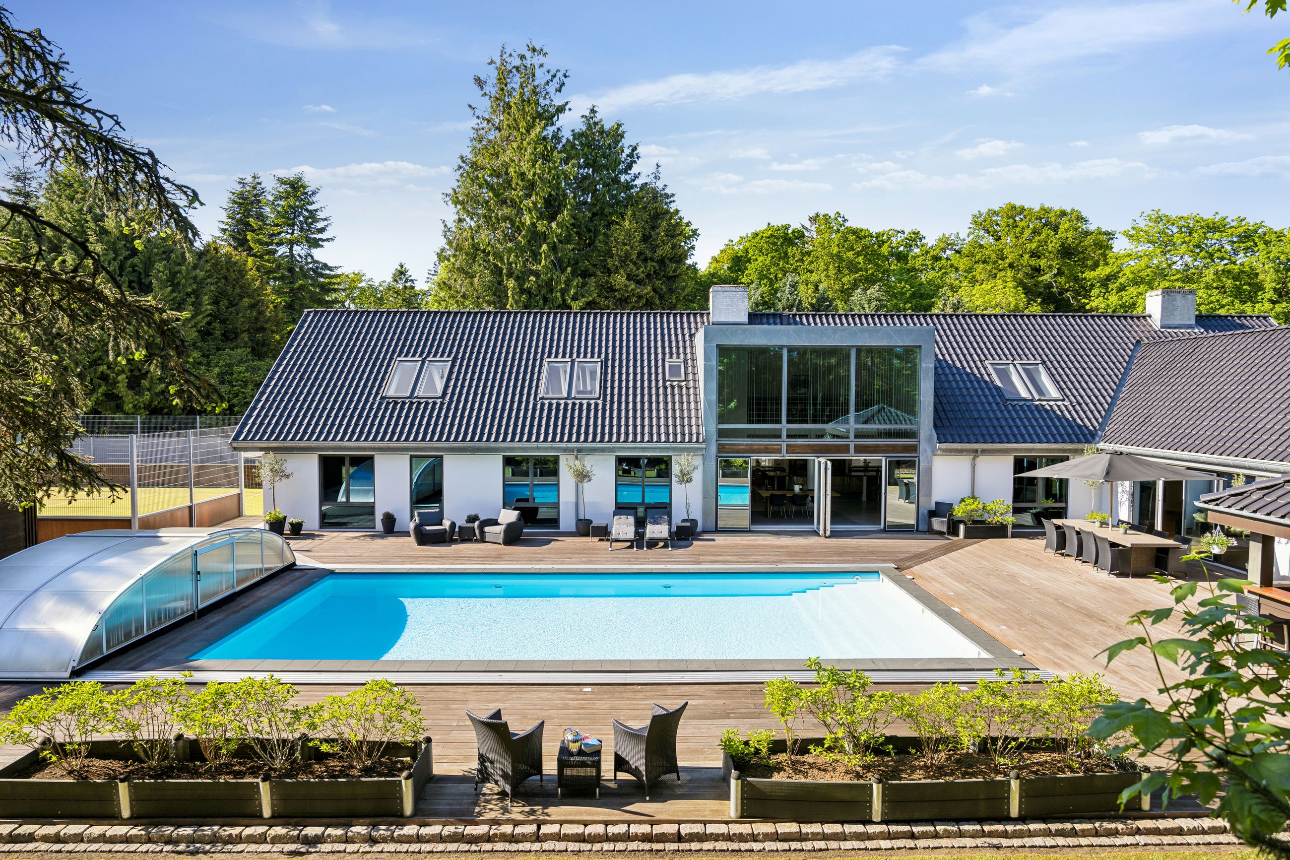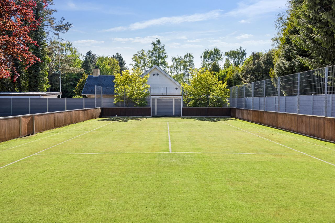 Udearealerne er intet mindre end fantastiske; udover det sædvanlige finder man her et kæmpe poolområde omgivet af en smuk træterrasse – perfekt til afslapning eller festlige begivenheder. For de aktive familiemedlemmer findes egen fodboldbane/tennisbane samt en stor have anlagt med flot beplantning som danner ramme om hyggelige udendørs aktiviteter.
