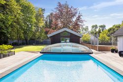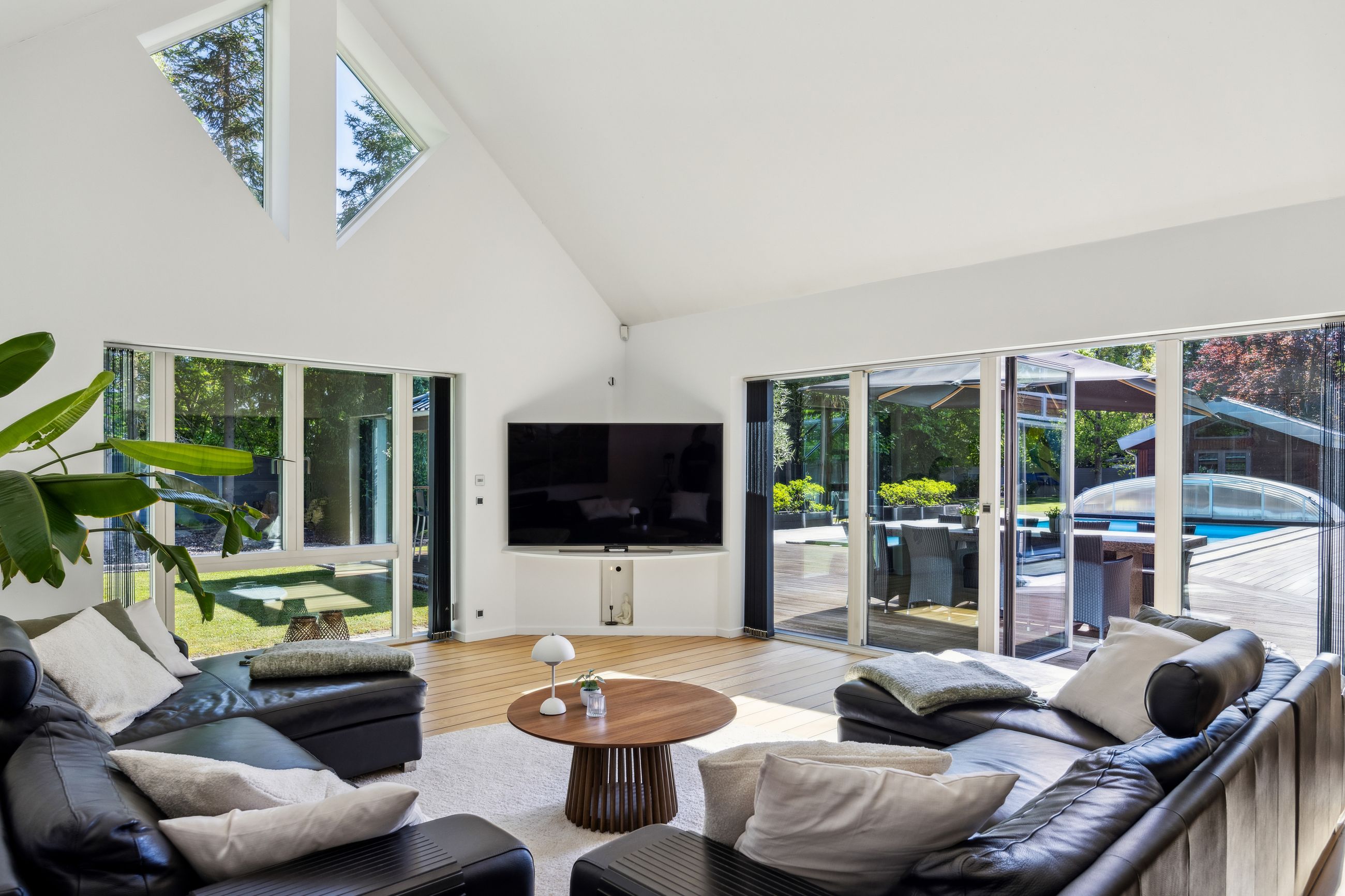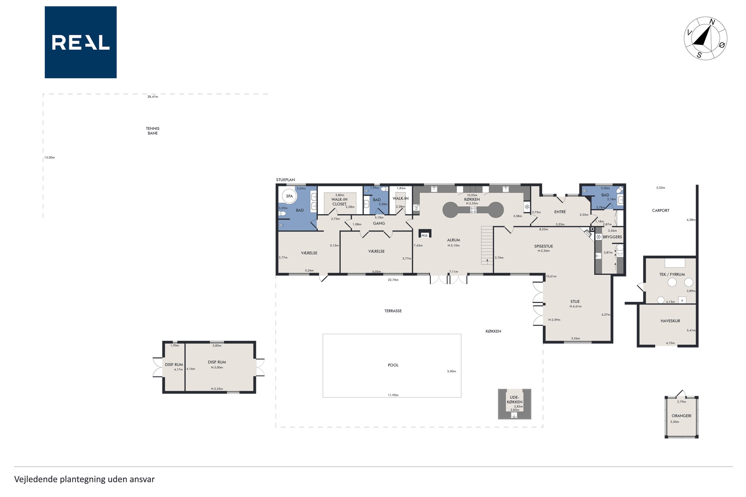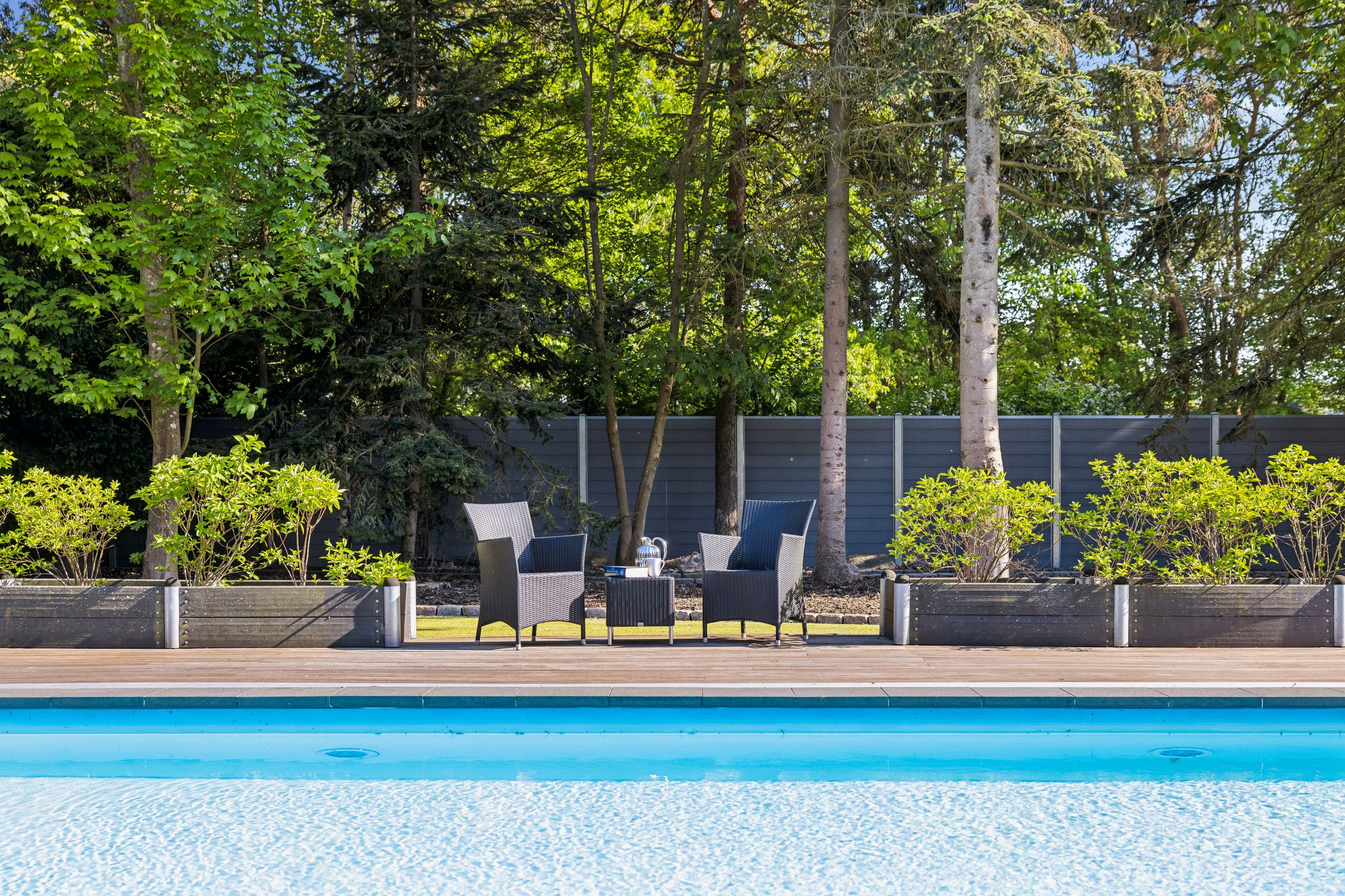 Udearealerne er intet mindre end fantastiske; udover det sædvanlige finder man her et kæmpe poolområde omgivet af en smuk træterrasse – perfekt til afslapning eller festlige begivenheder. For de aktive familiemedlemmer findes egen fodboldbane/tennisbane samt en stor have anlagt med flot beplantning som danner ramme om hyggelige udendørs aktiviteter.