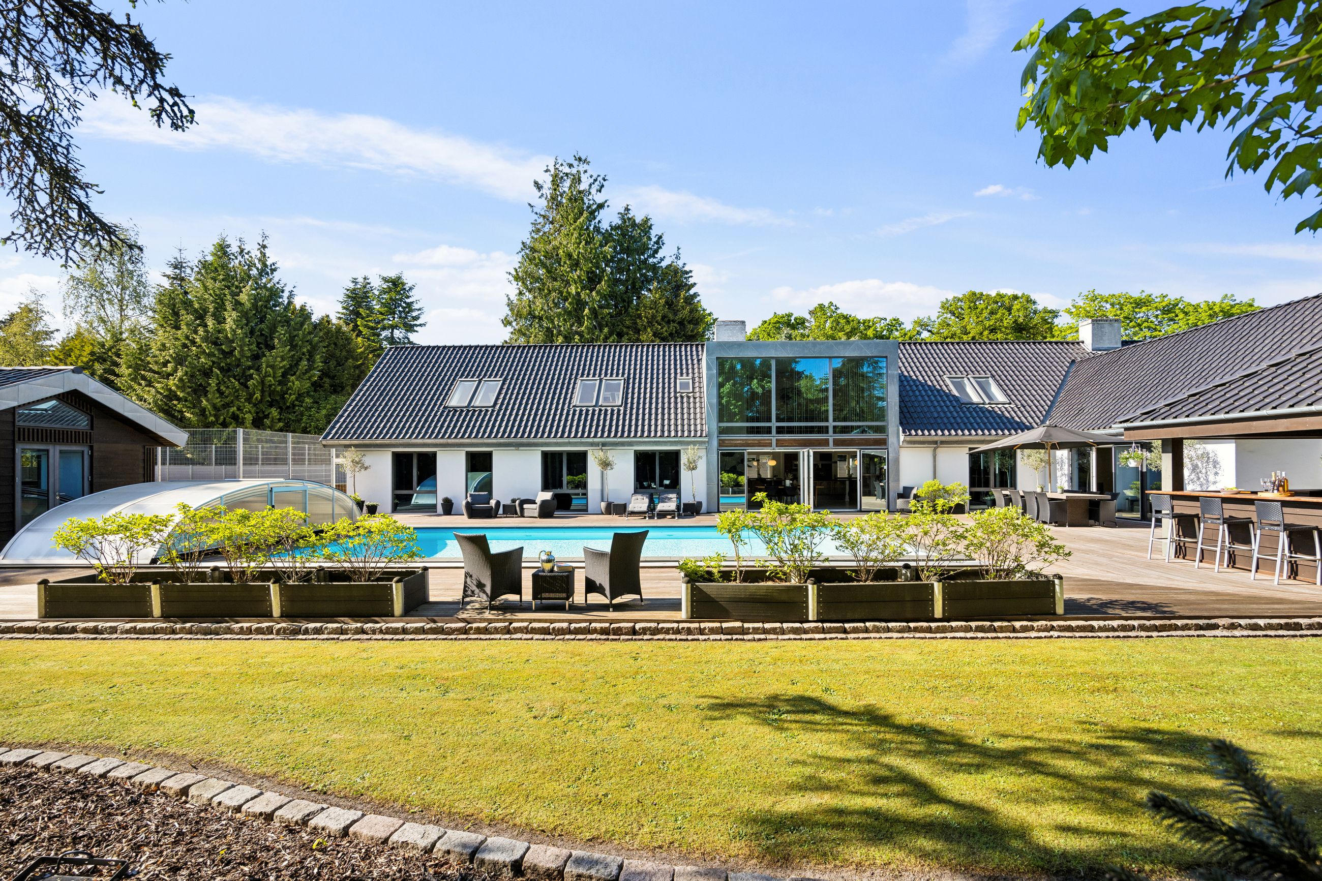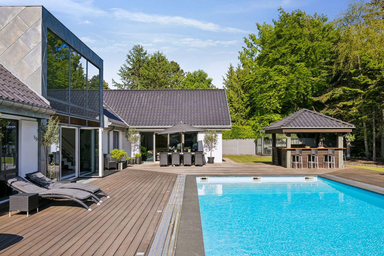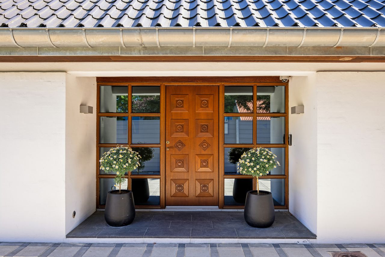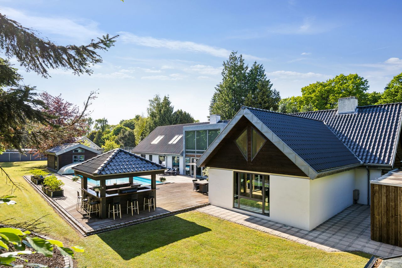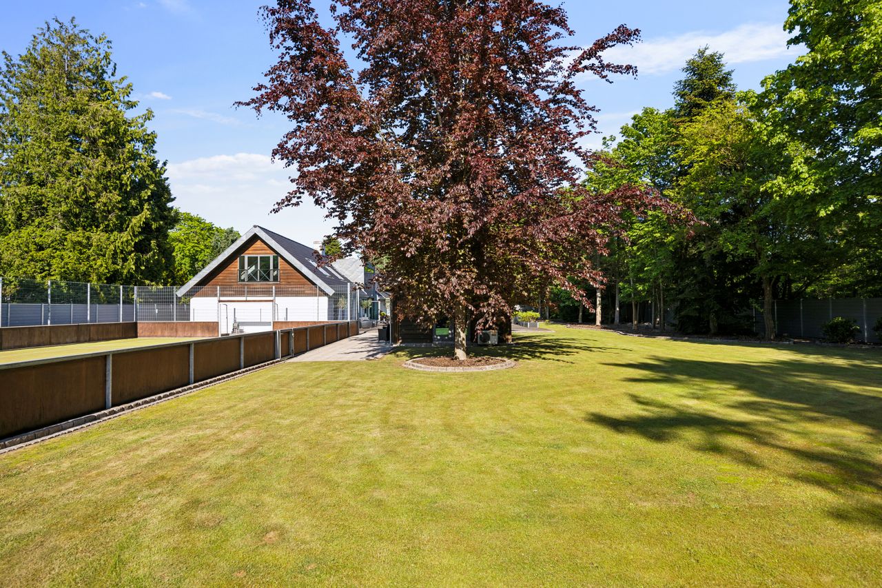 En ekstra luksusdetalje er den udendørs bar hvor man kan nyde lange sommeraftener under åben himmel. Den store indkørsel prydes af en smedelåge som åbnes bekvemt via fjernbetjening – sikkerhed kombineret med stil.