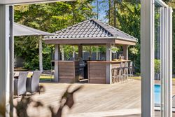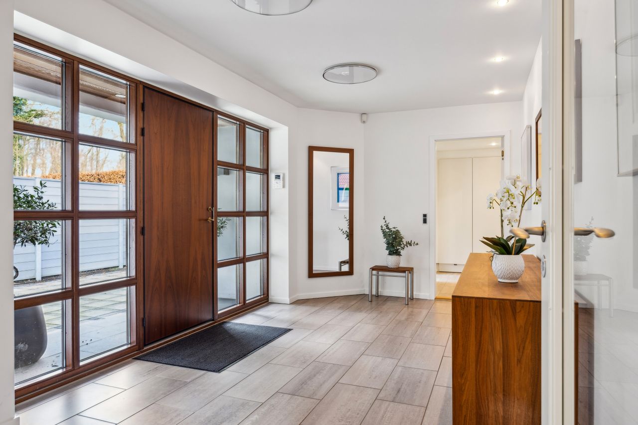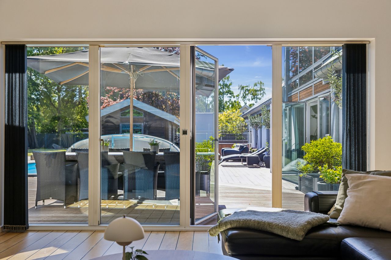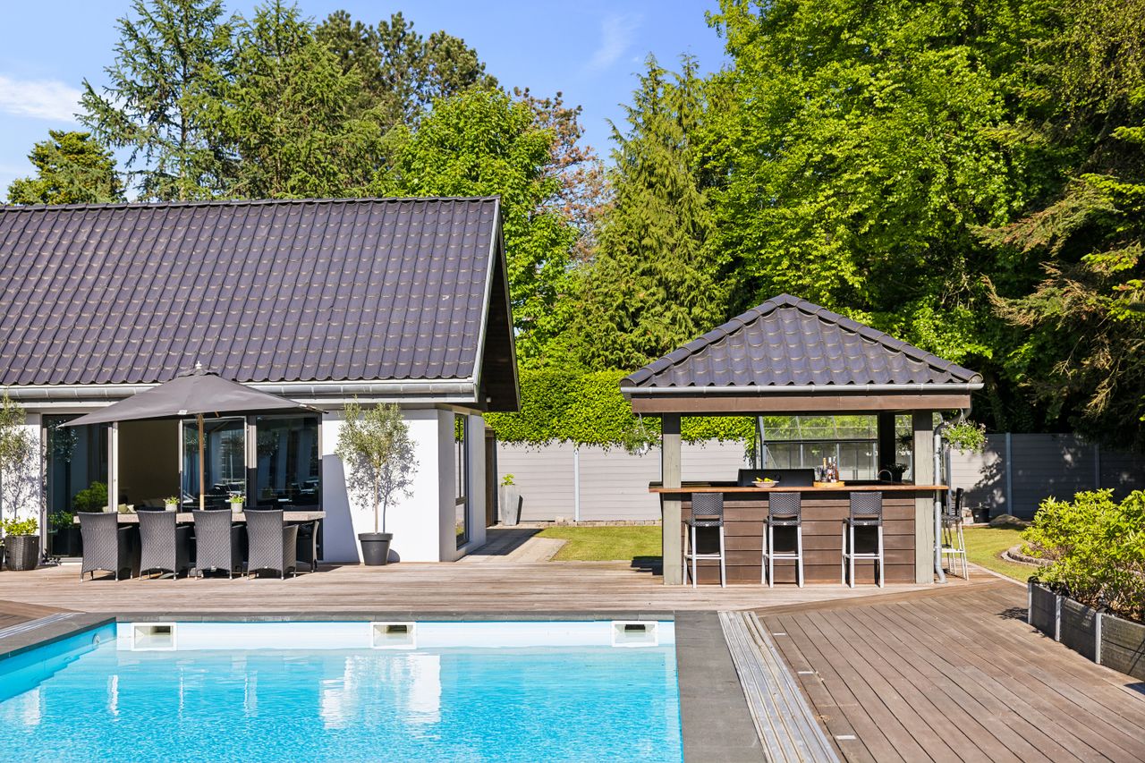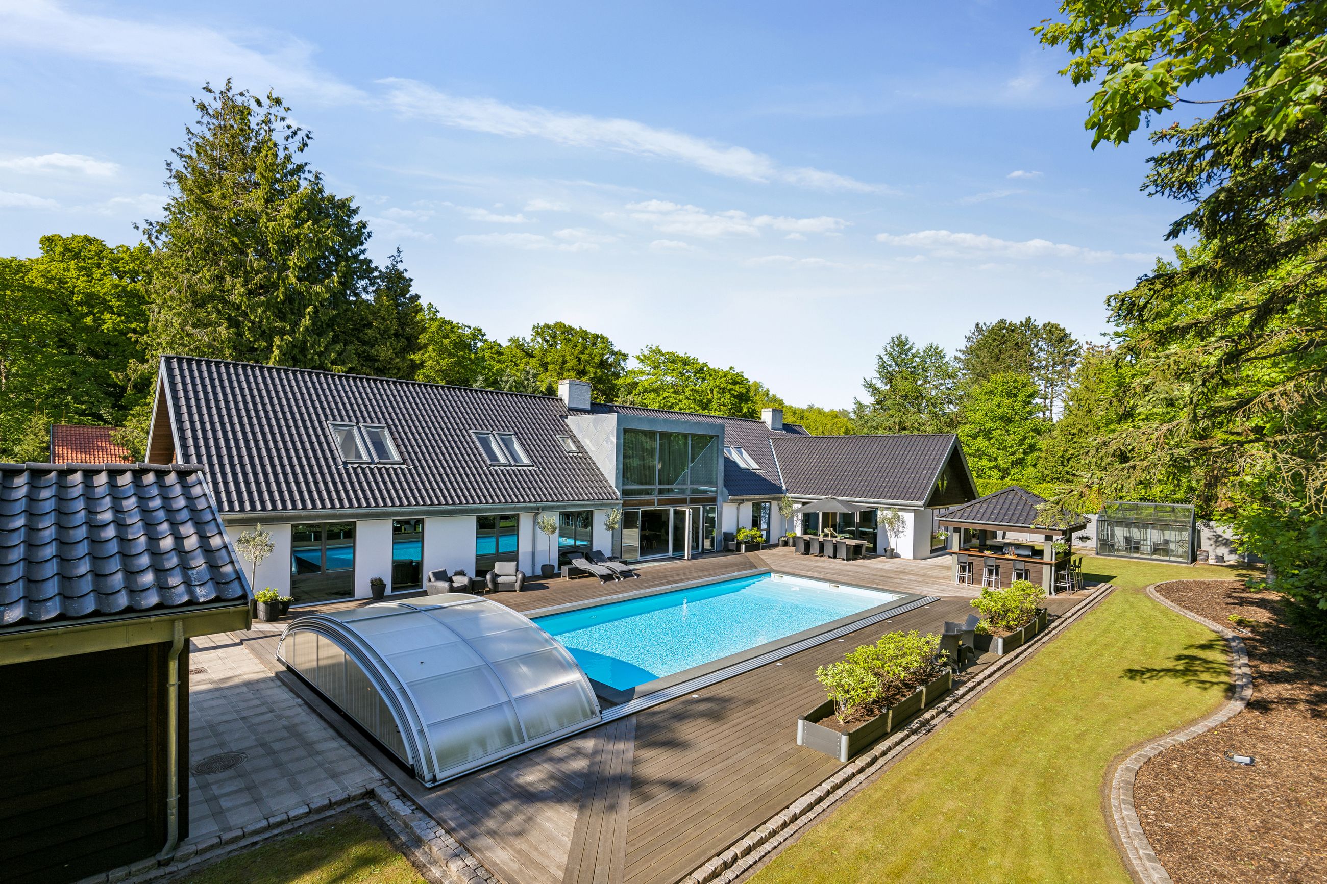En ekstra luksusdetalje er den udendørs bar hvor man kan nyde lange sommeraftener under åben himmel. Den store indkørsel prydes af en smedelåge som åbnes bekvemt via fjernbetjening – sikkerhed kombineret med stil.