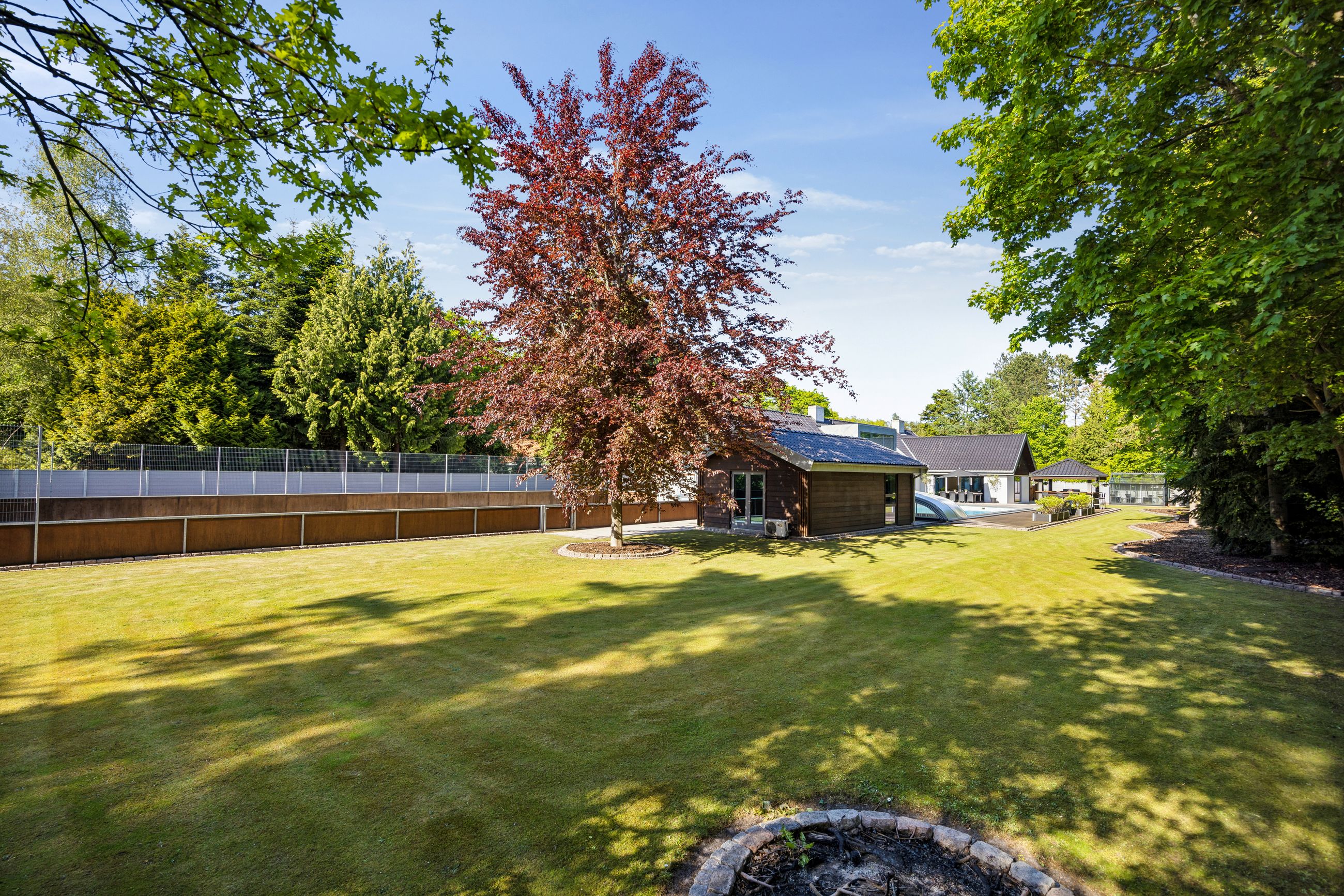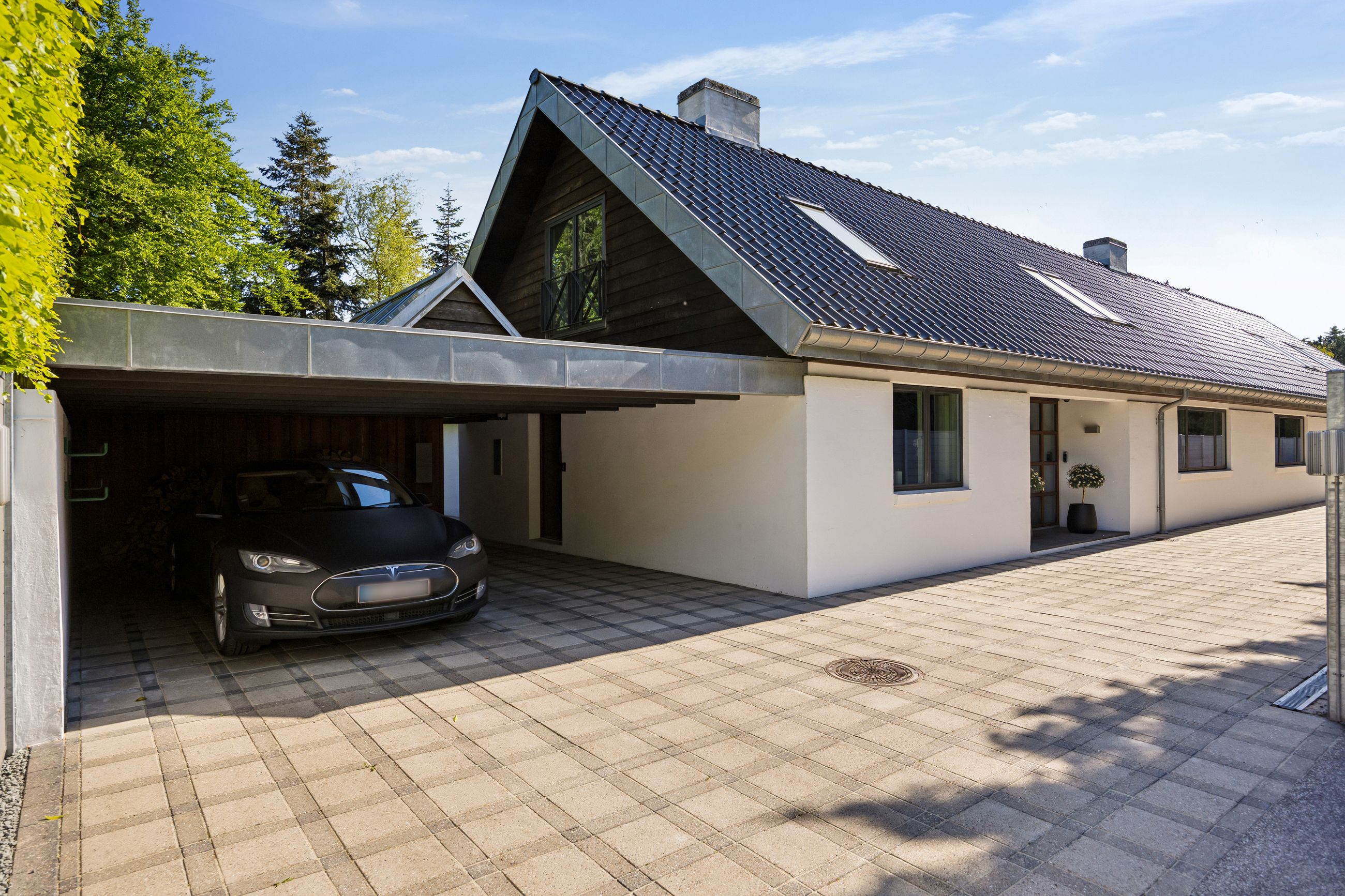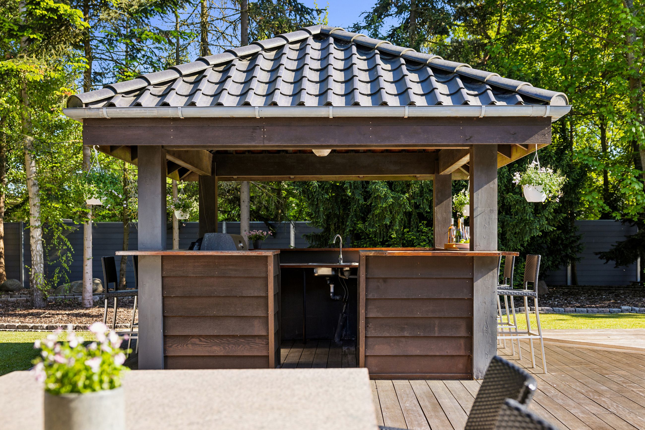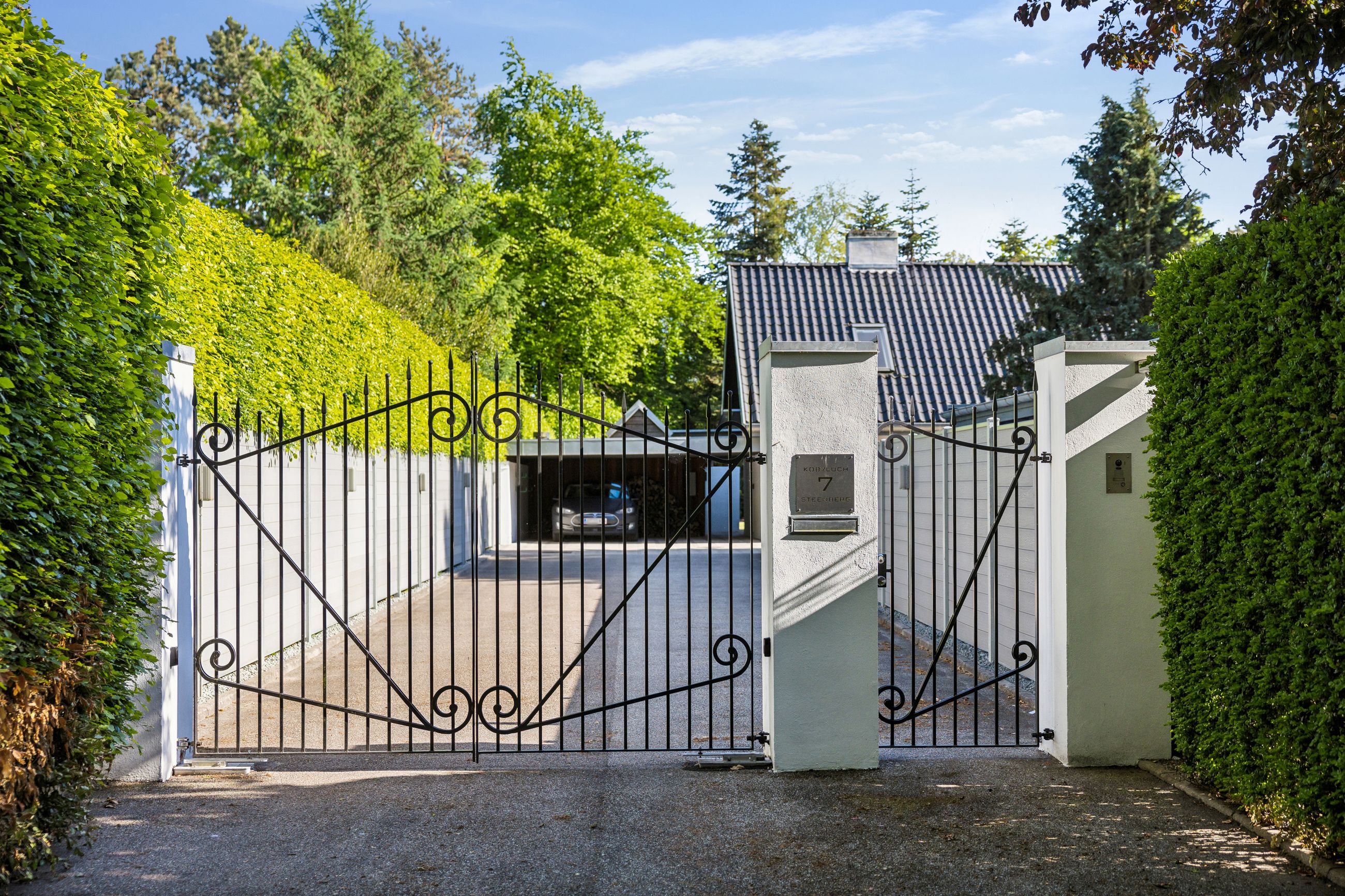En ekstra luksusdetalje er den udendørs bar hvor man kan nyde lange sommeraftener under åben himmel. Den store indkørsel prydes af en smedelåge som åbnes bekvemt via fjernbetjening – sikkerhed kombineret med stil.