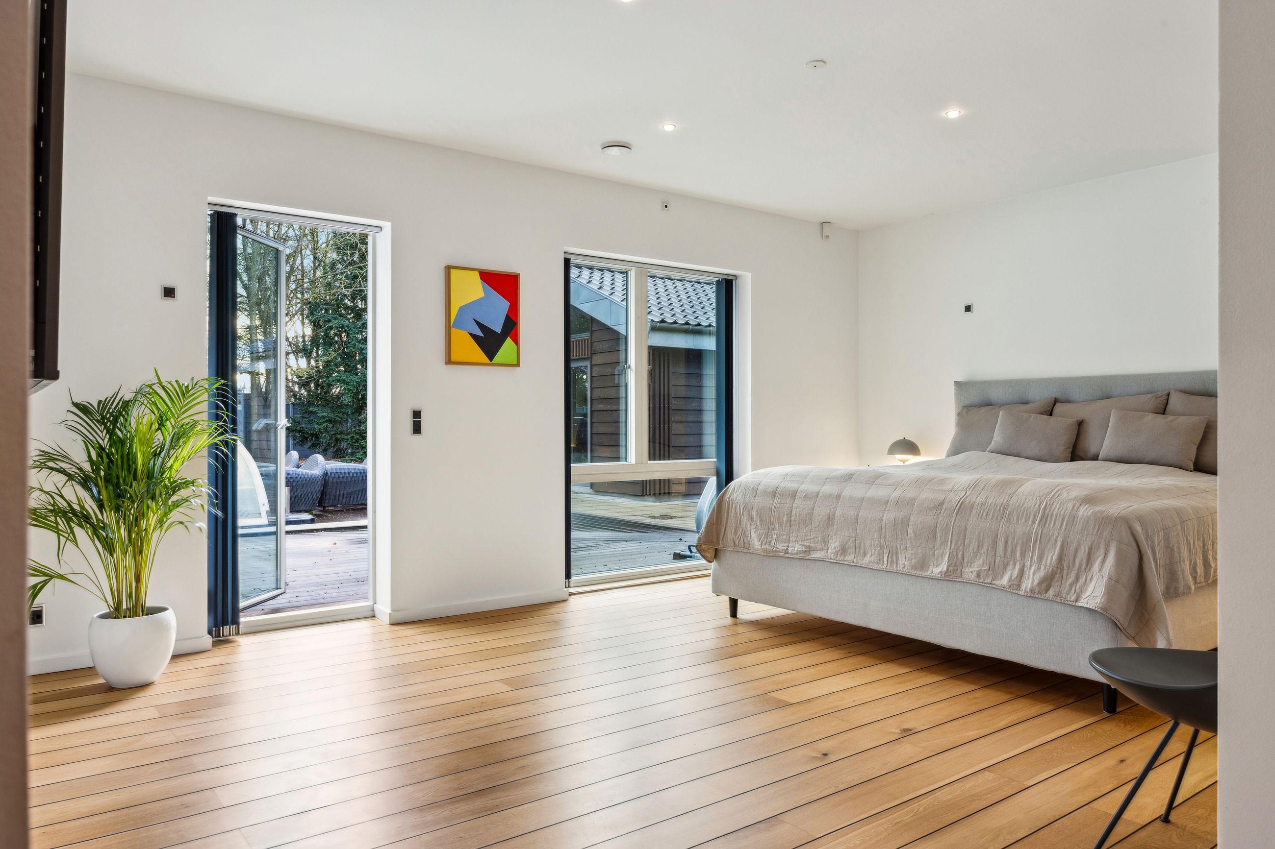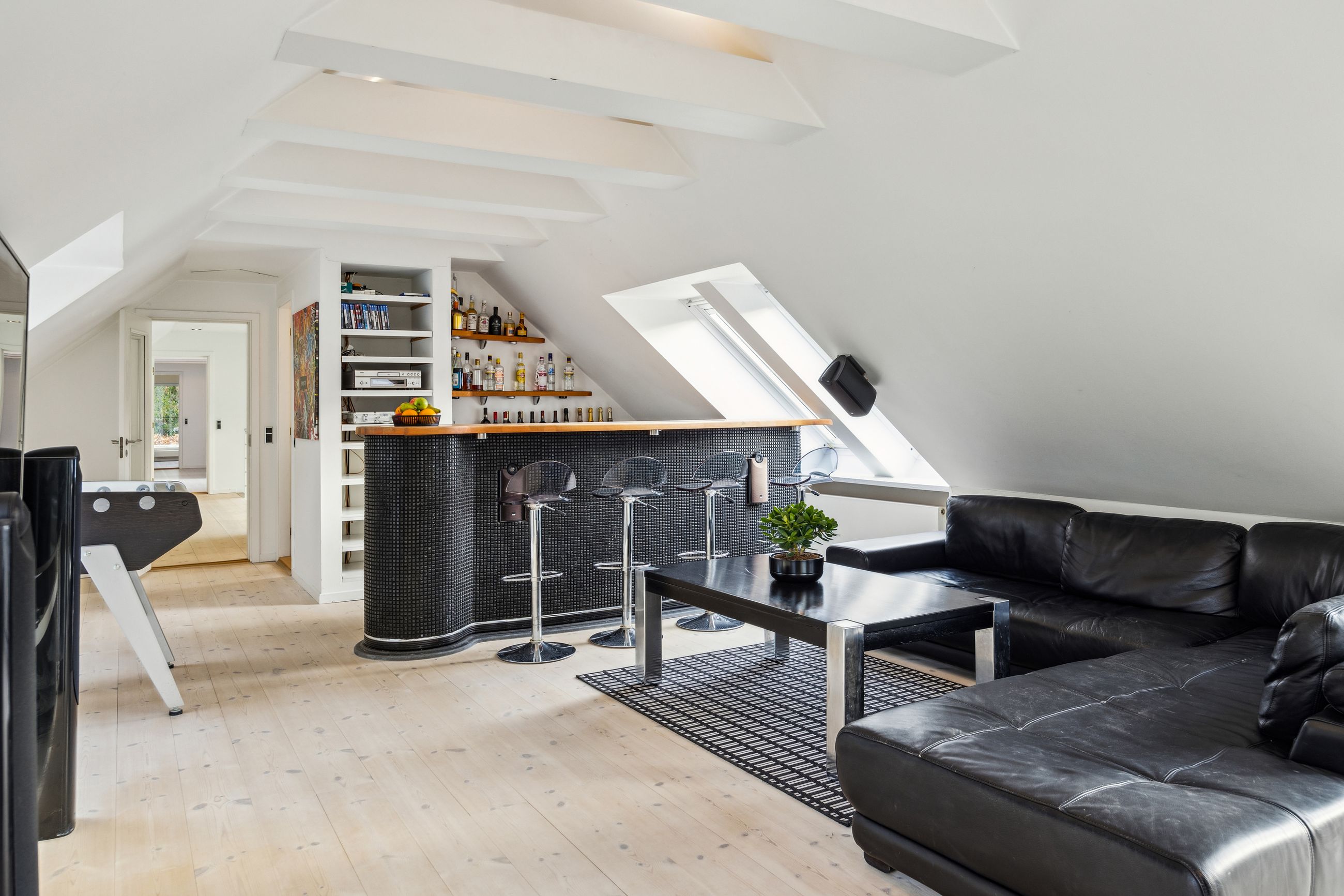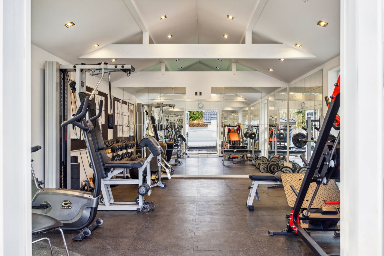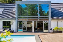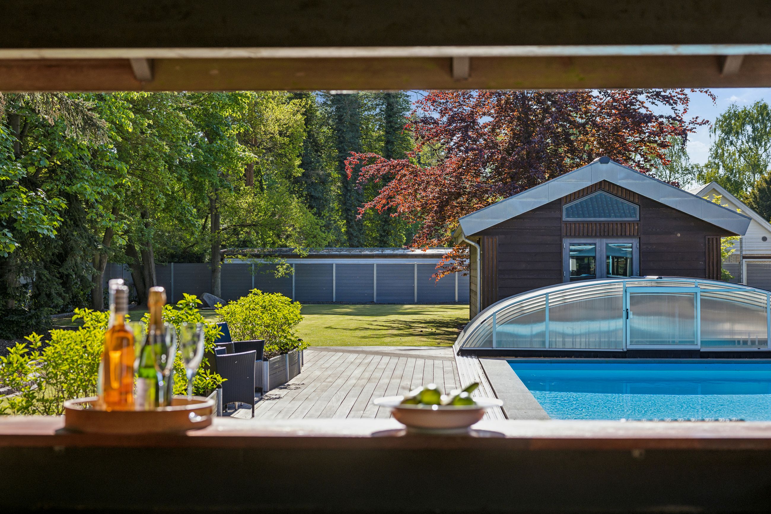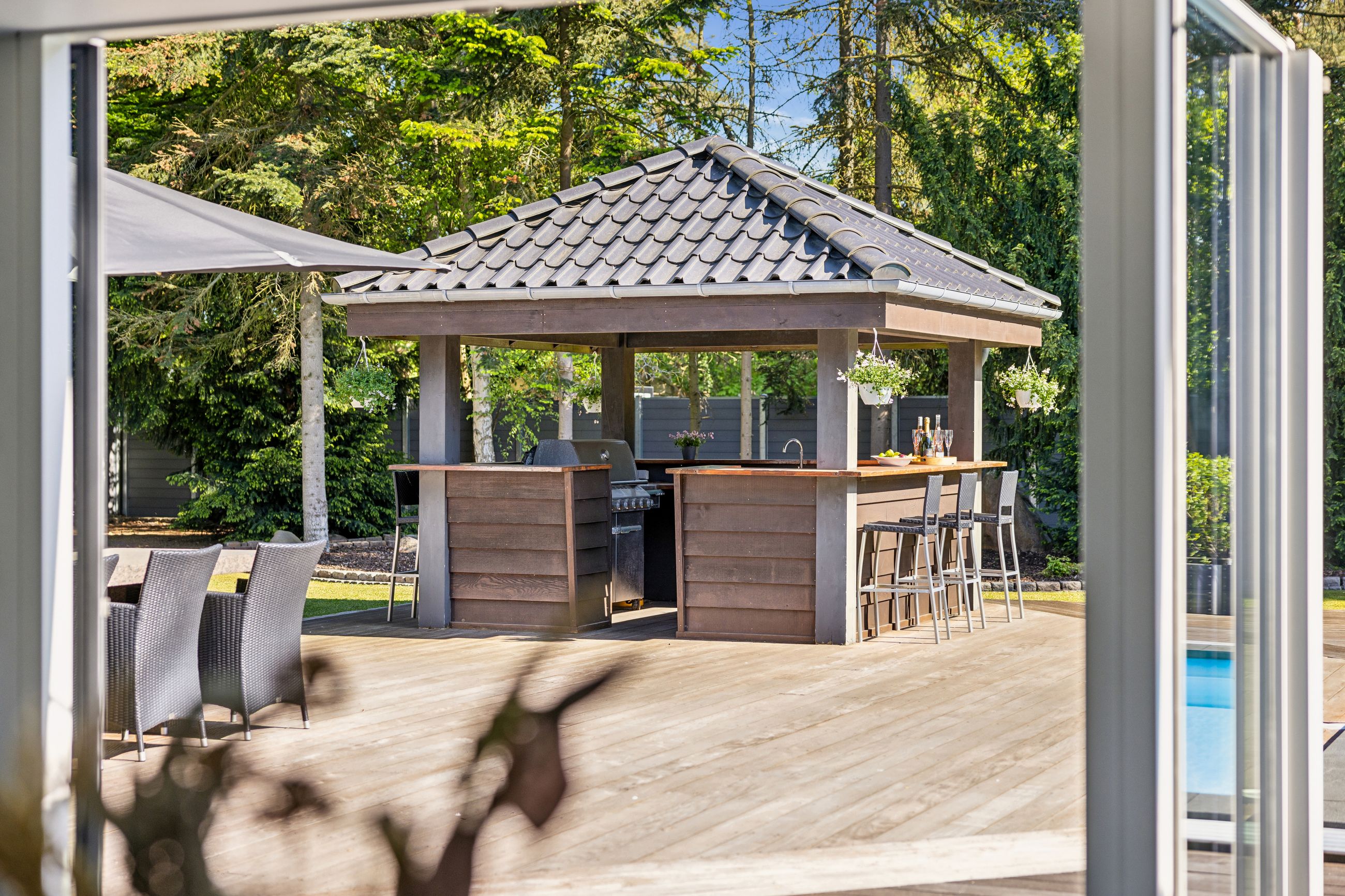 En ekstra luksusdetalje er den udendørs bar hvor man kan nyde lange sommeraftener under åben himmel. Den store indkørsel prydes af en smedelåge som åbnes bekvemt via fjernbetjening – sikkerhed kombineret med stil.