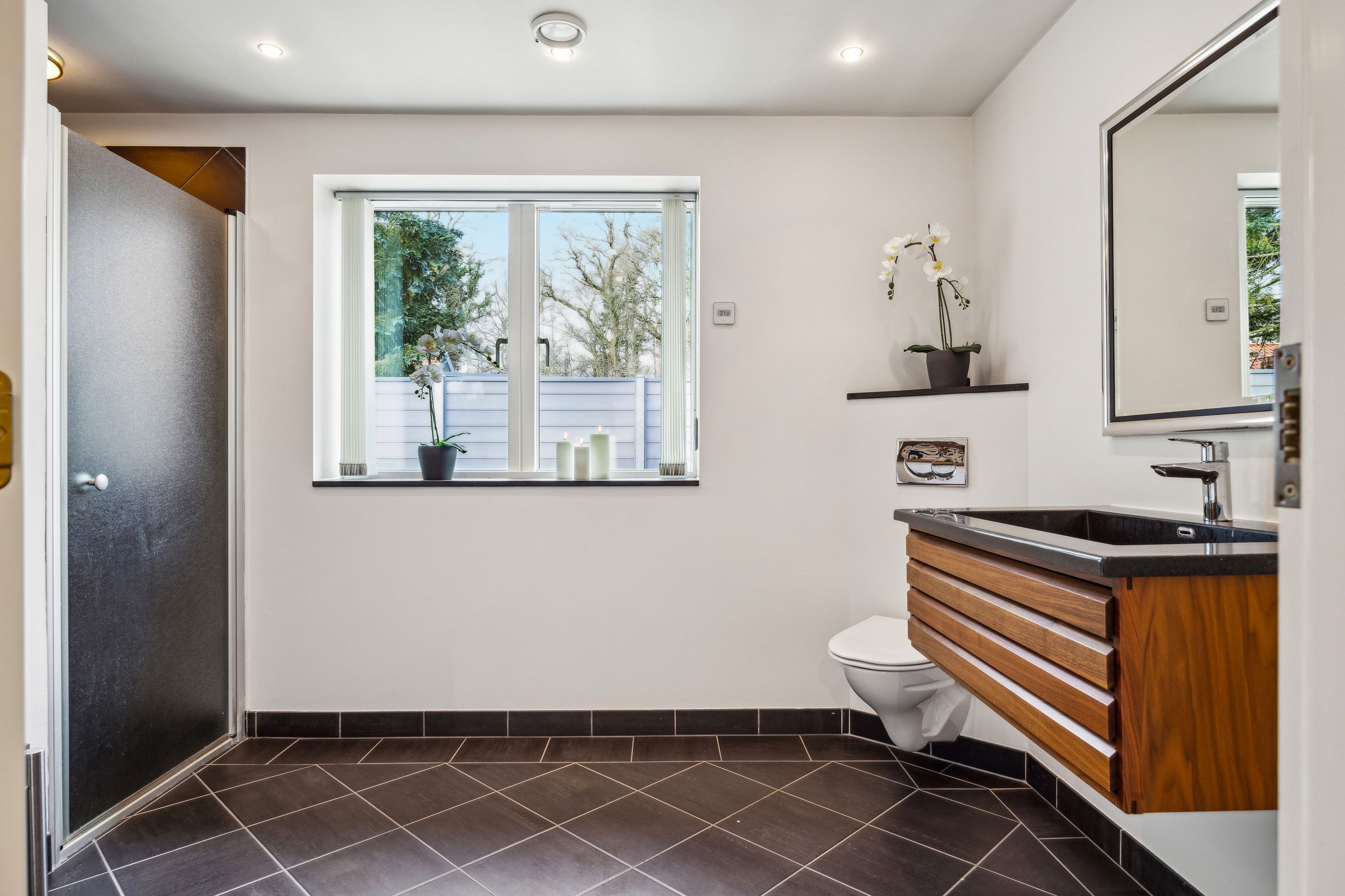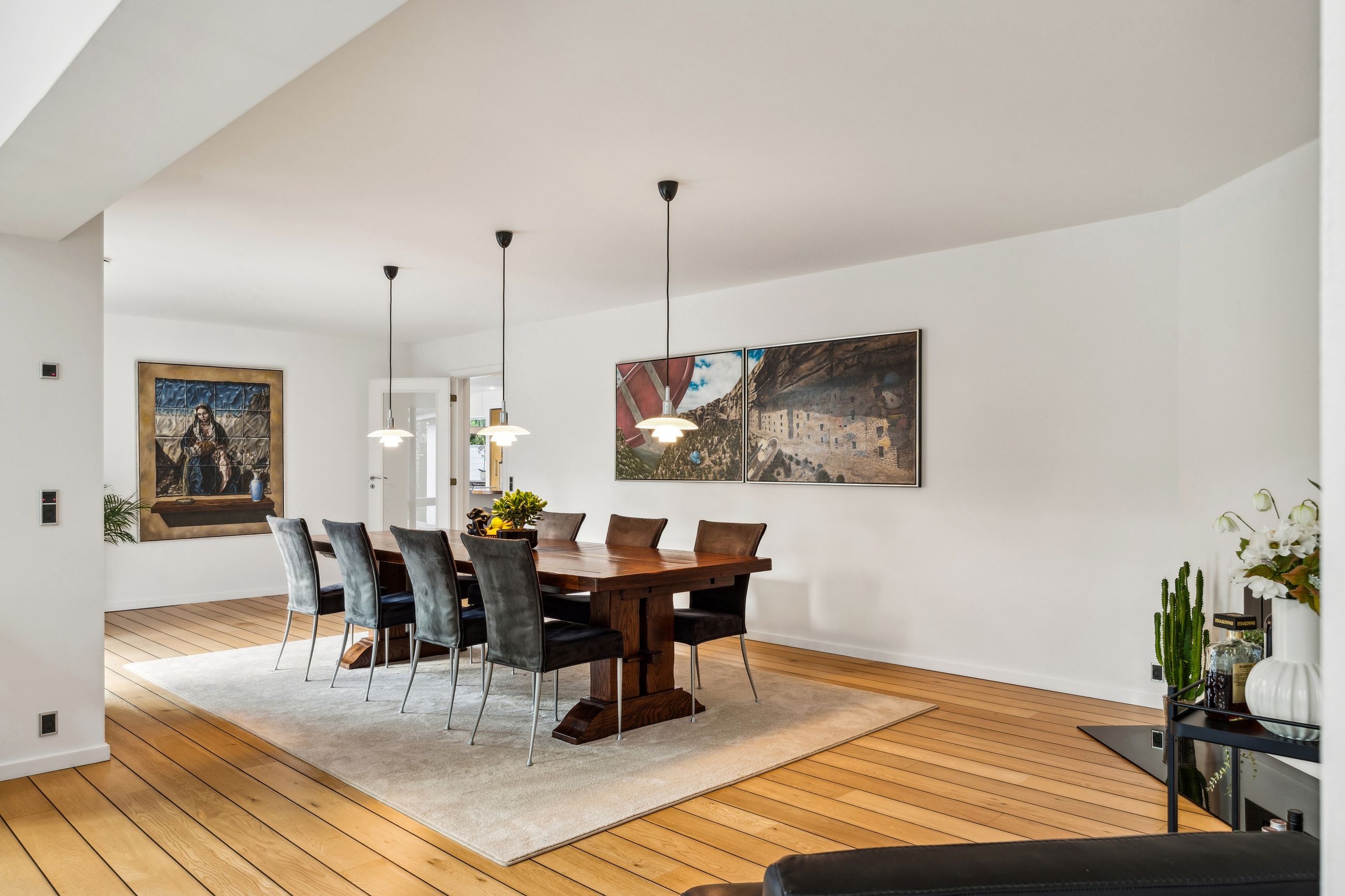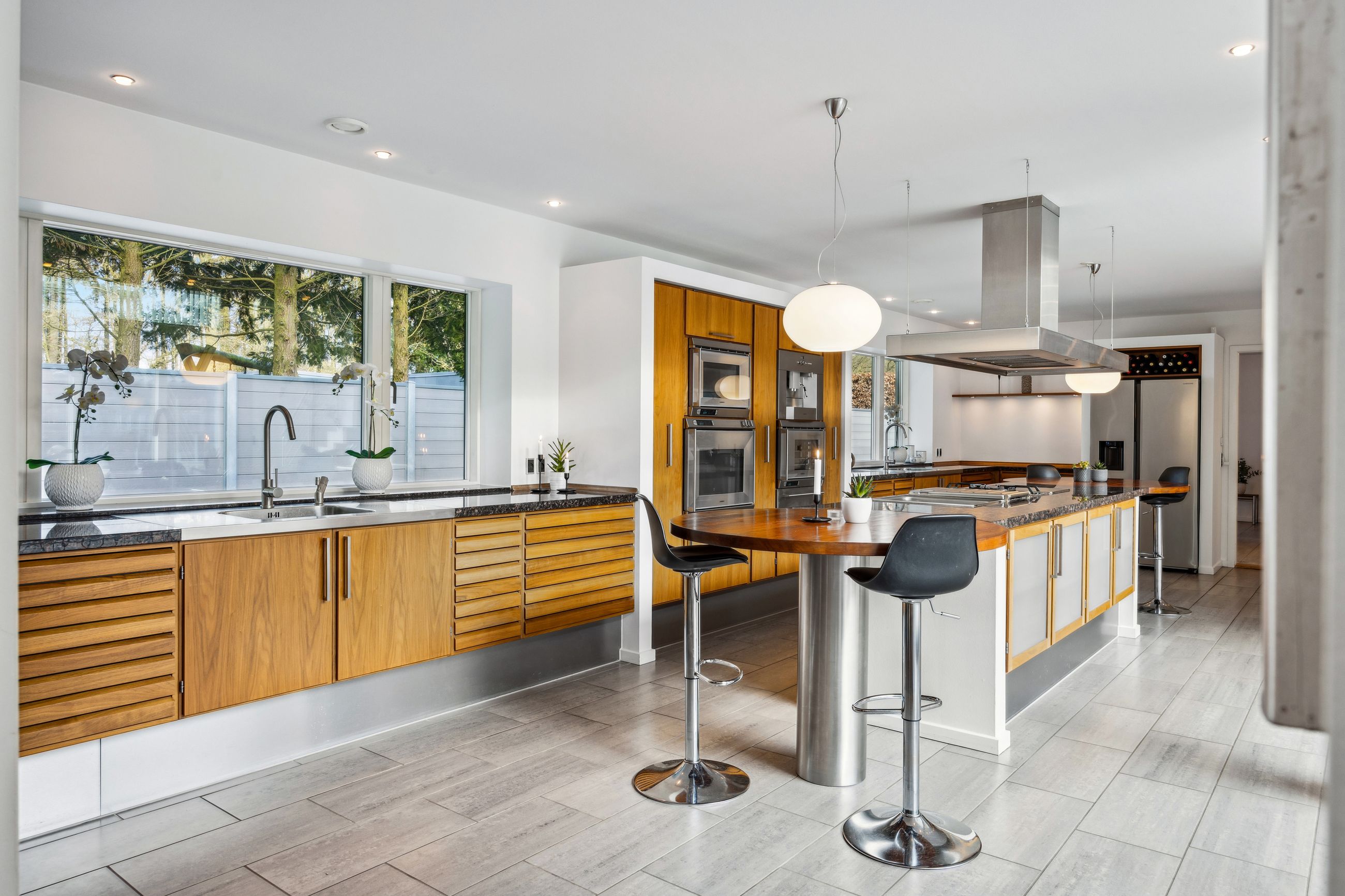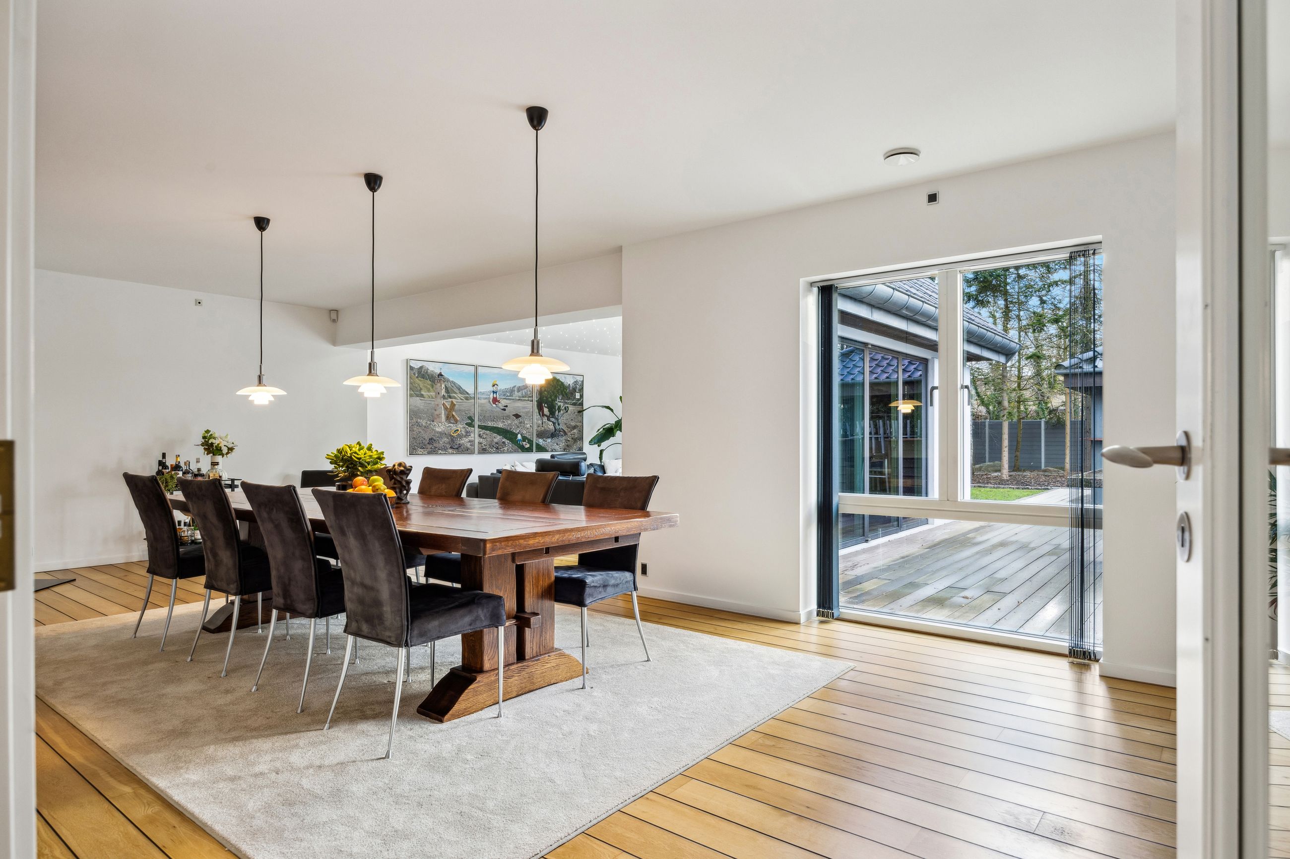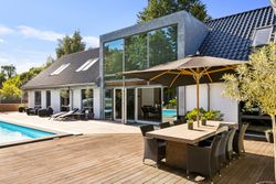 En ekstra luksusdetalje er den udendørs bar hvor man kan nyde lange sommeraftener under åben himmel. Den store indkørsel prydes af en smedelåge som åbnes bekvemt via fjernbetjening – sikkerhed kombineret med stil.