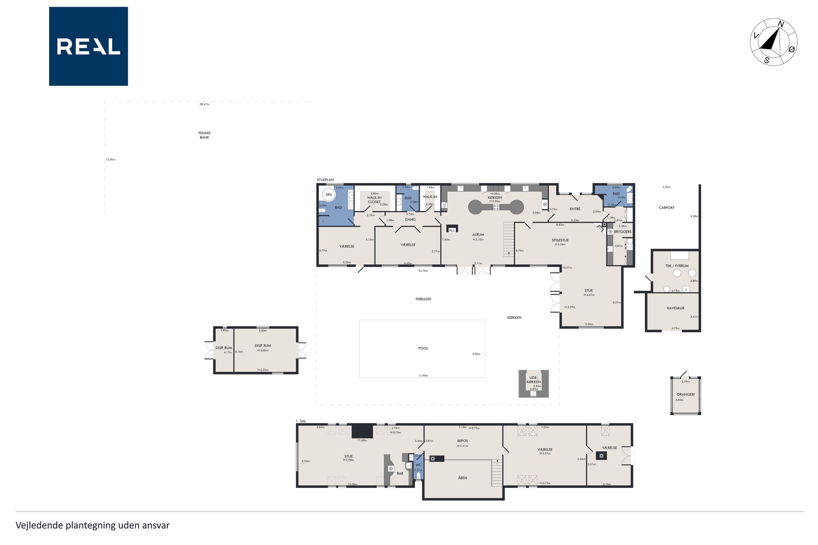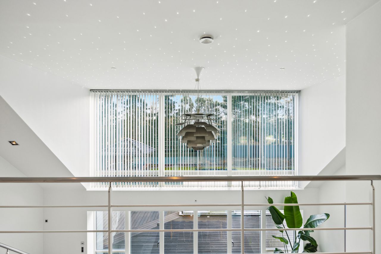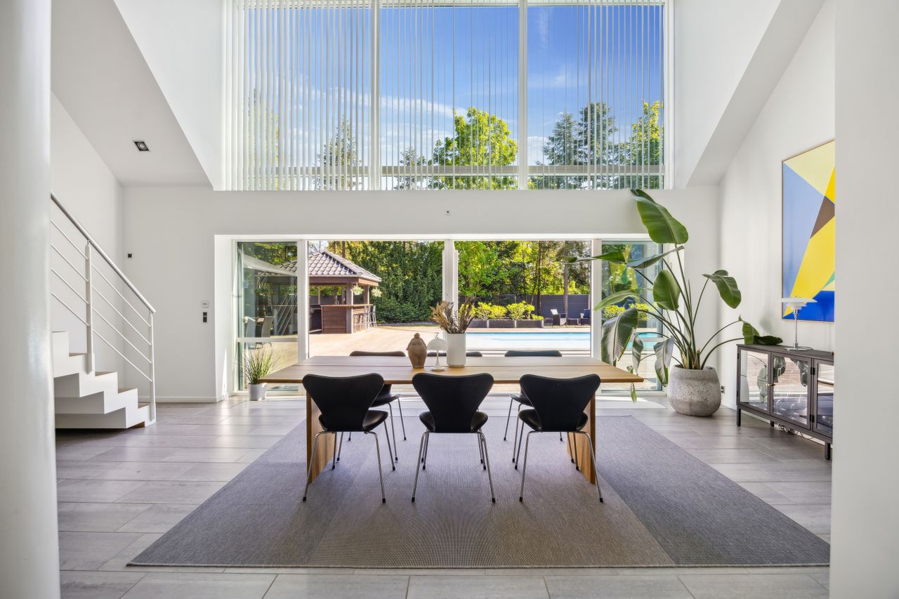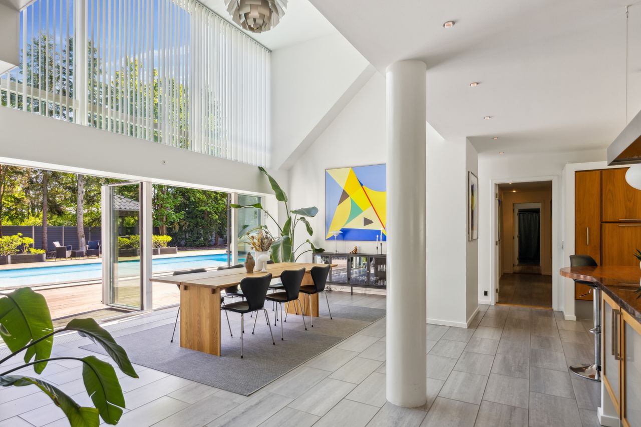 Når du træder ind ad døren, mødes du af en stor hall med rigelig plads til sko og overtøj. Herfra er der adgang til et fantastisk køkken-alrum udstyret med et stort køkken udført i elegante træelementer samt eksklusive hårde hvidevarer af højeste kvalitet. Køkkenet har god spiseplads og fører videre ind til en rummelig stue med loft til kip og en betagende stjernehimmel. Fra både køkken-alrummet og stuen er der direkte udgang til terrasse- og poolområdet.