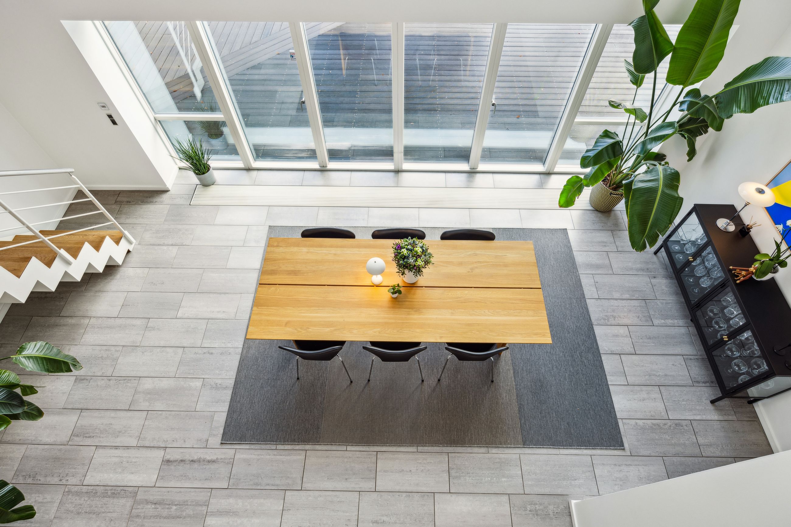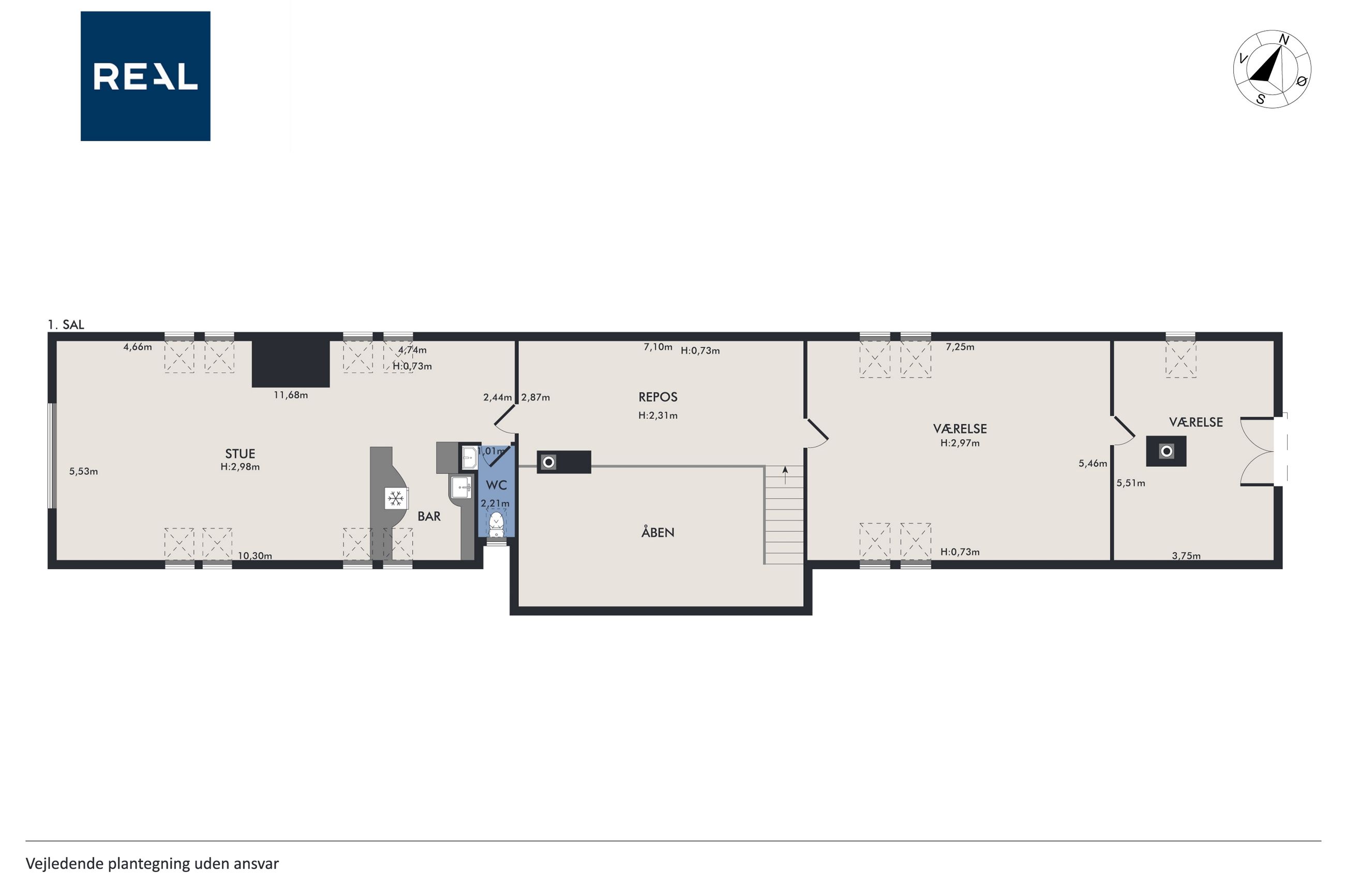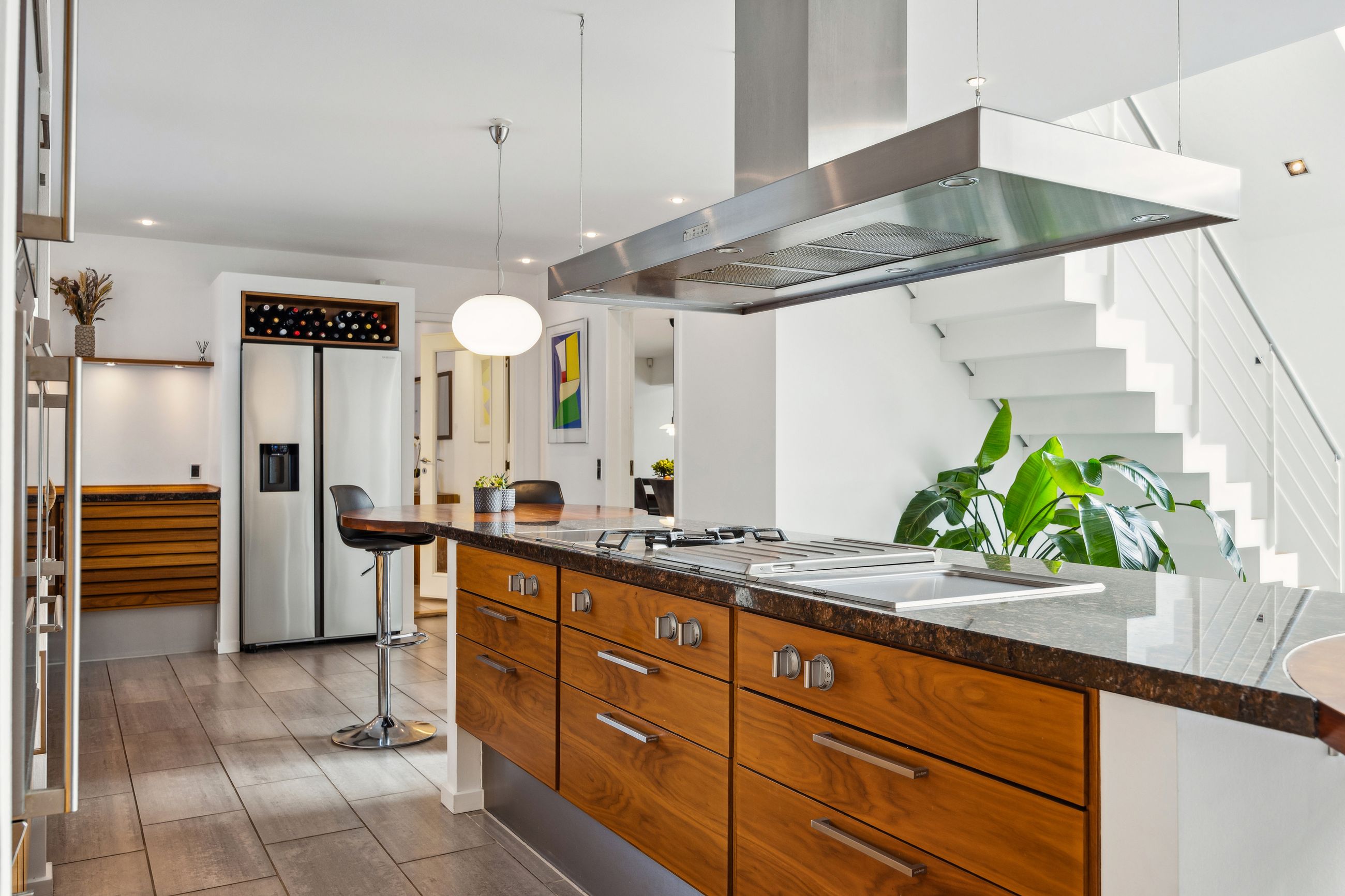 Når du træder ind ad døren, mødes du af en stor hall med rigelig plads til sko og overtøj. Herfra er der adgang til et fantastisk køkken-alrum udstyret med et stort køkken udført i elegante træelementer samt eksklusive hårde hvidevarer af højeste kvalitet. Køkkenet har god spiseplads og fører videre ind til en rummelig stue med loft til kip og en betagende stjernehimmel. Fra både køkken-alrummet og stuen er der direkte udgang til terrasse- og poolområdet.