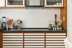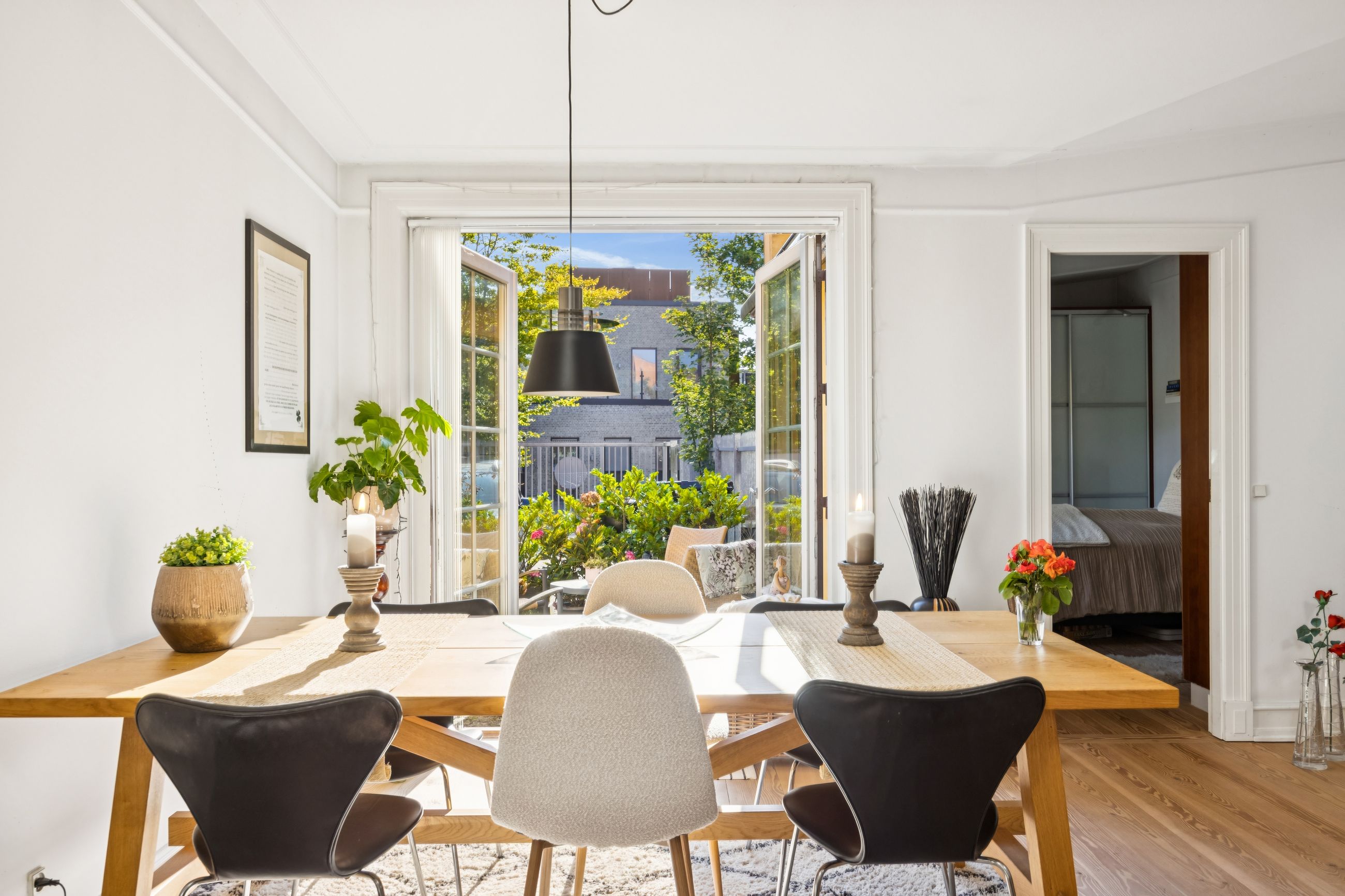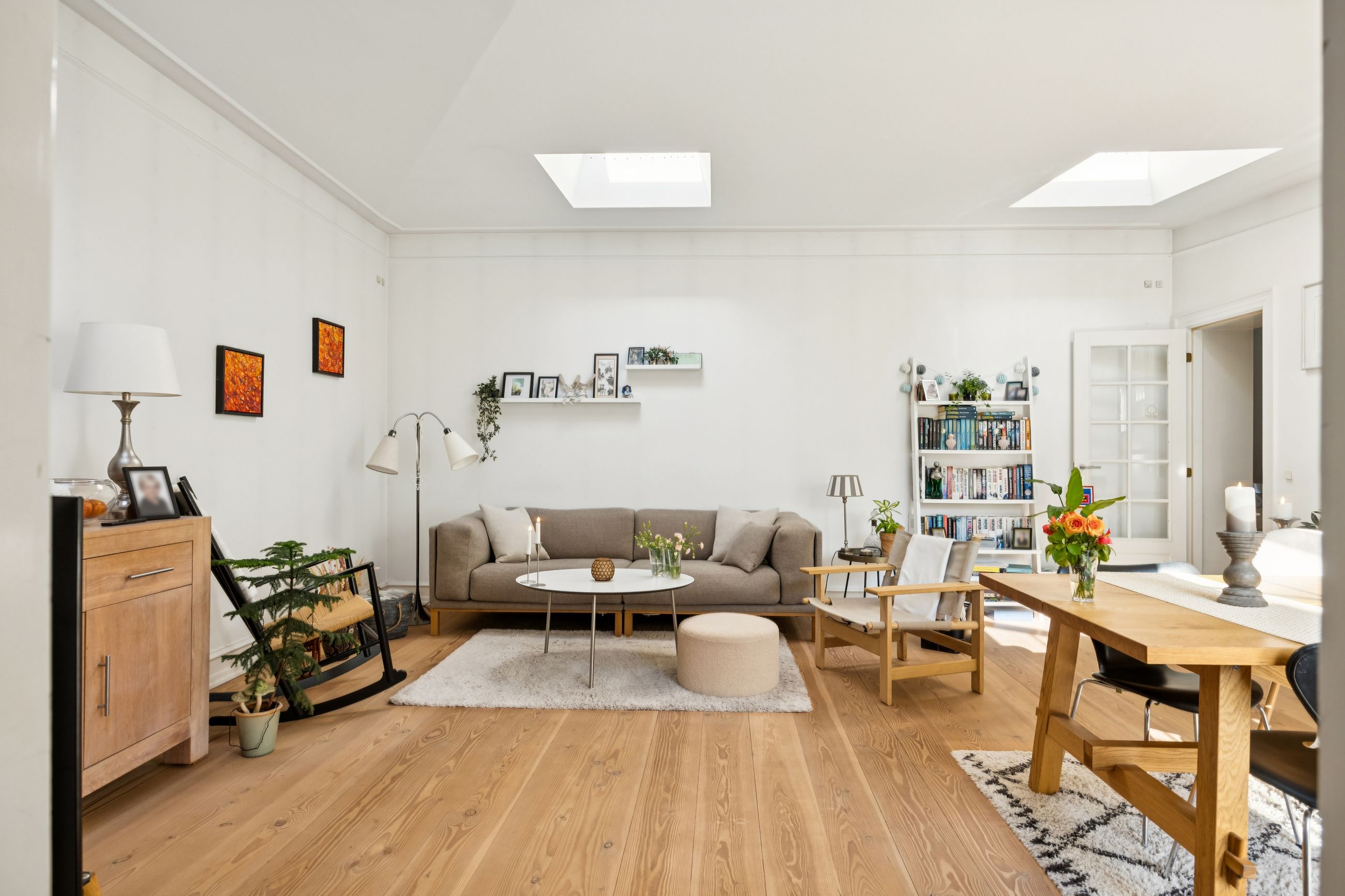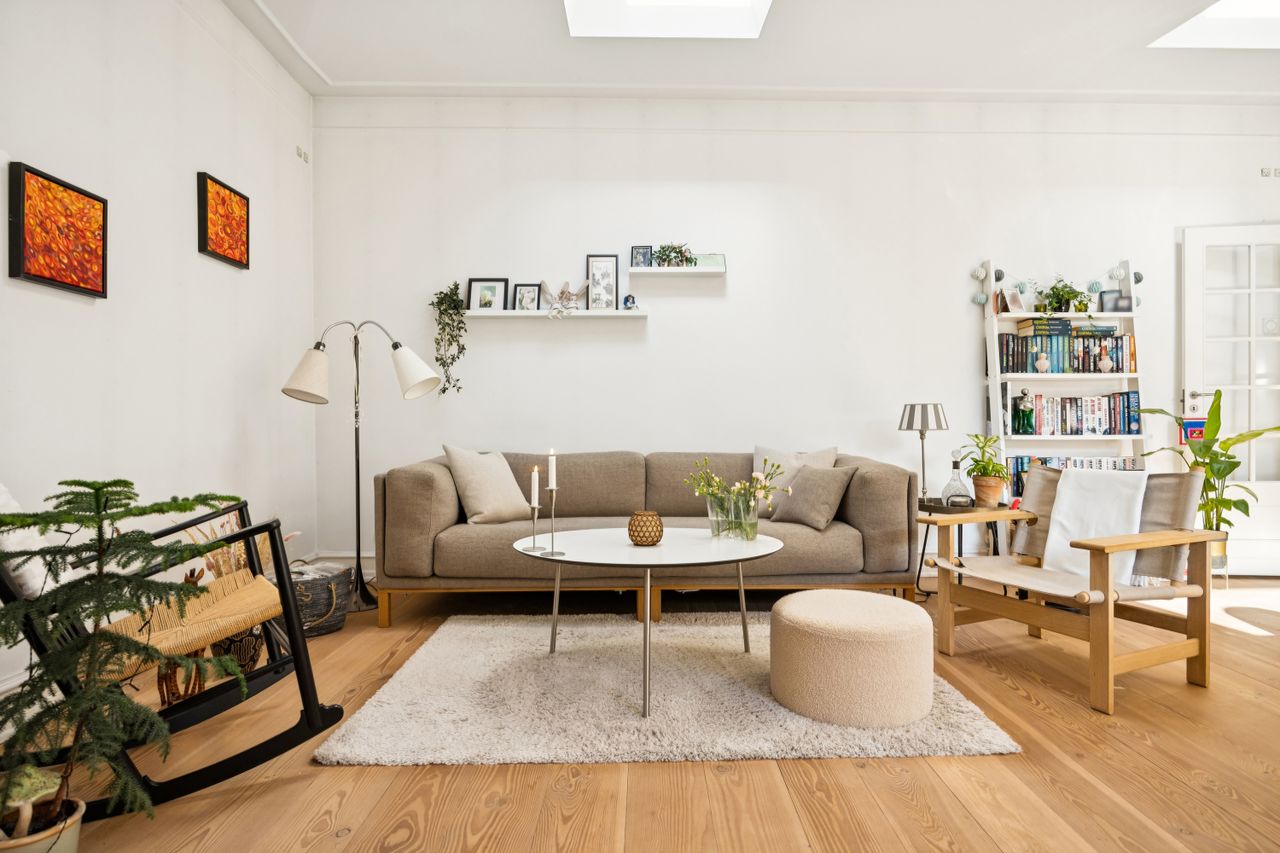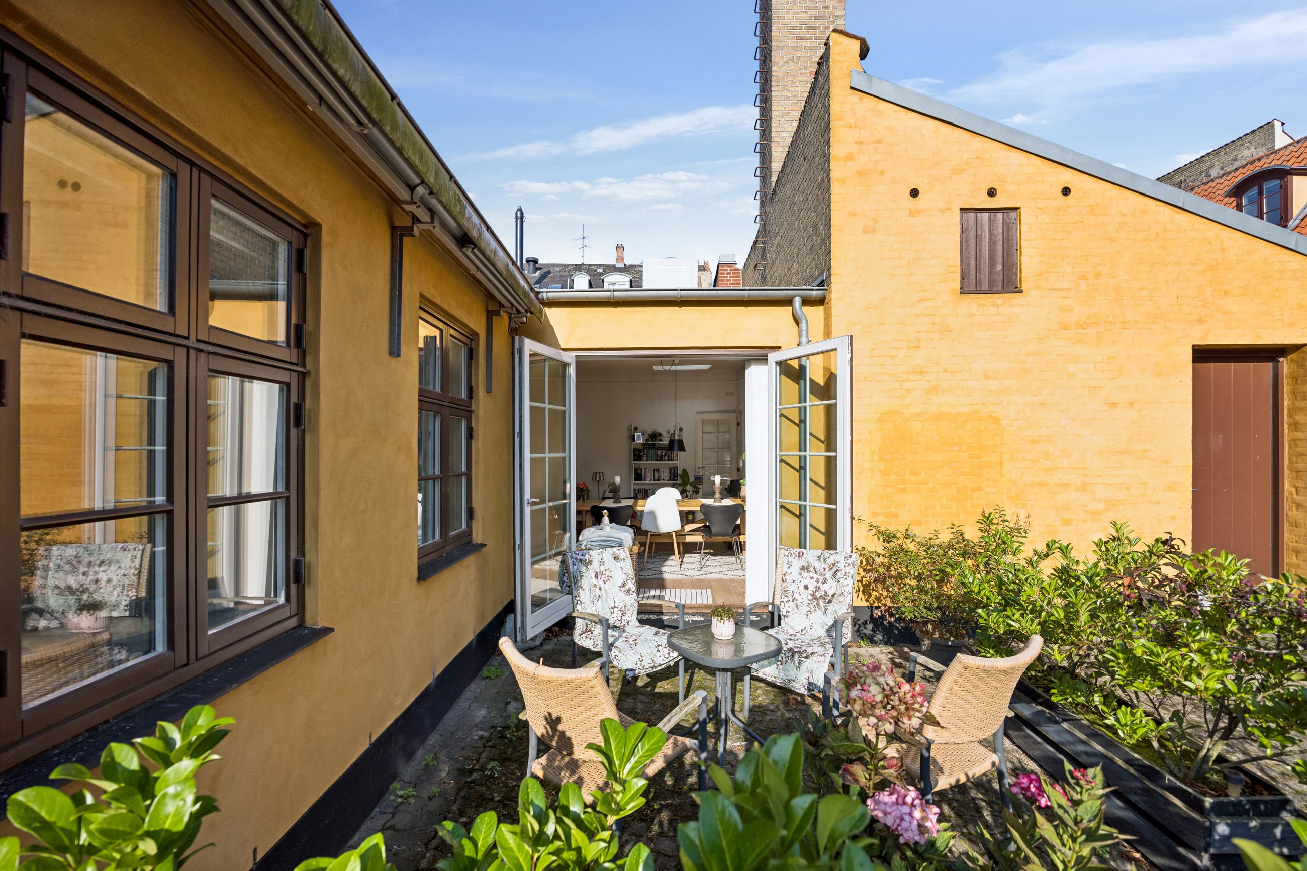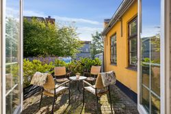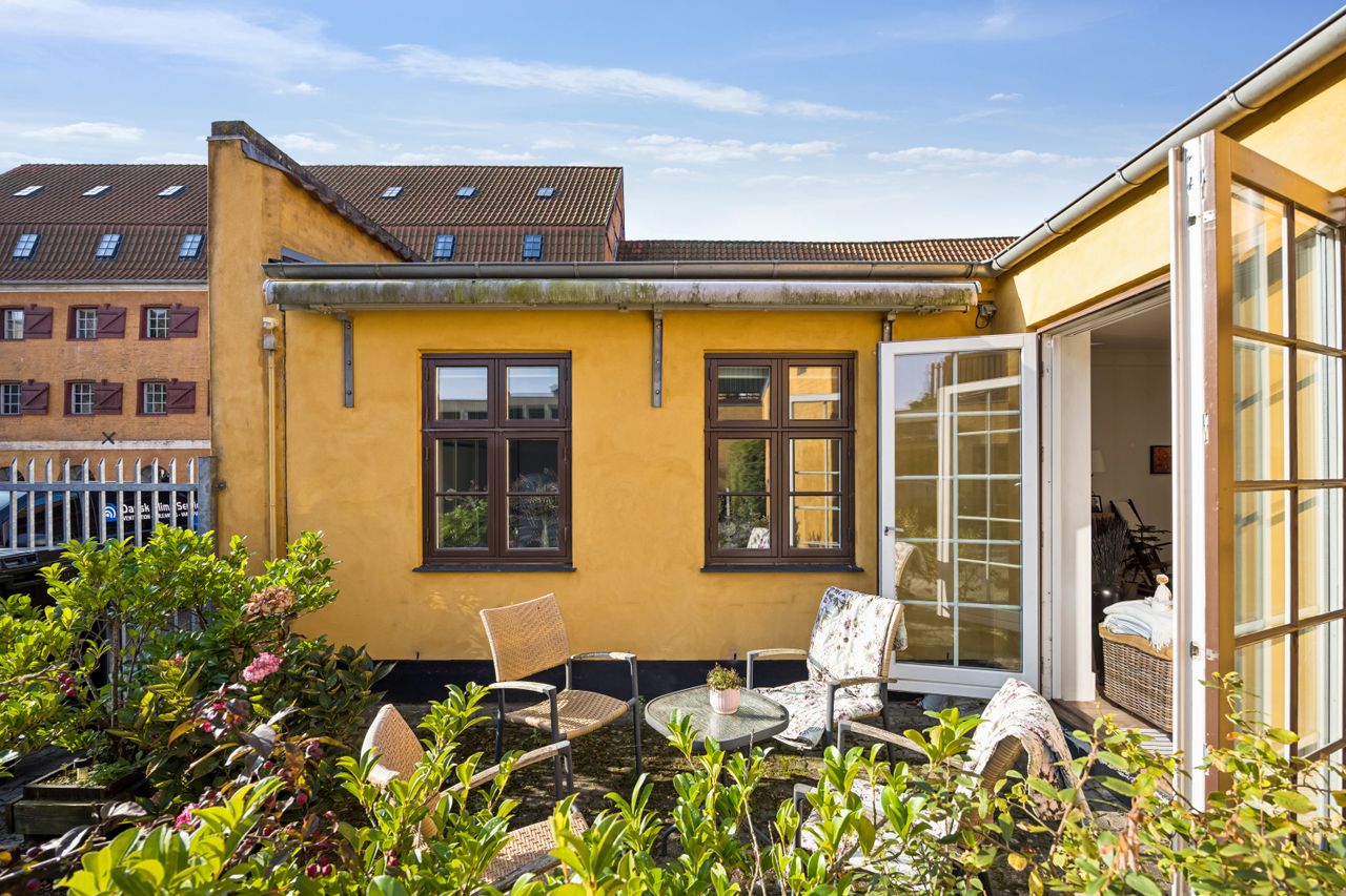 Stuen fungerer som lejlighedens hjerte og samlingspunkt; herfra har du direkte adgang til gårdspladsen, hvor du kan nyde morgenkaffen eller aftensolen i rolige omgivelser. Terrassen bliver hurtigt et yndet sted for afslapning eller hyggelige stunder med venner og familie.